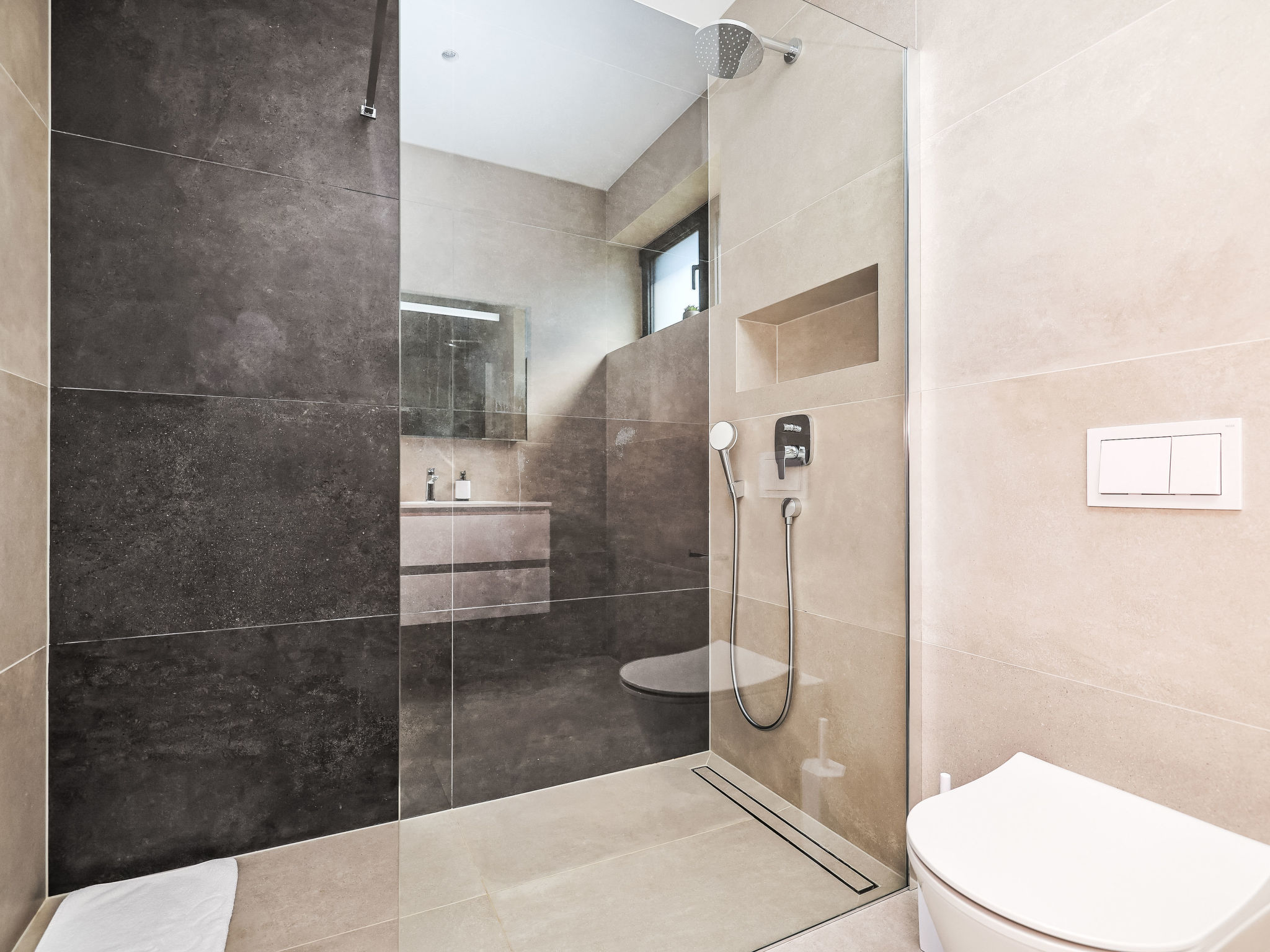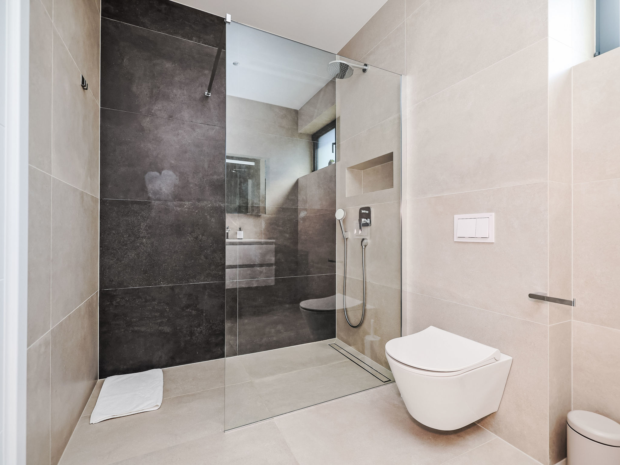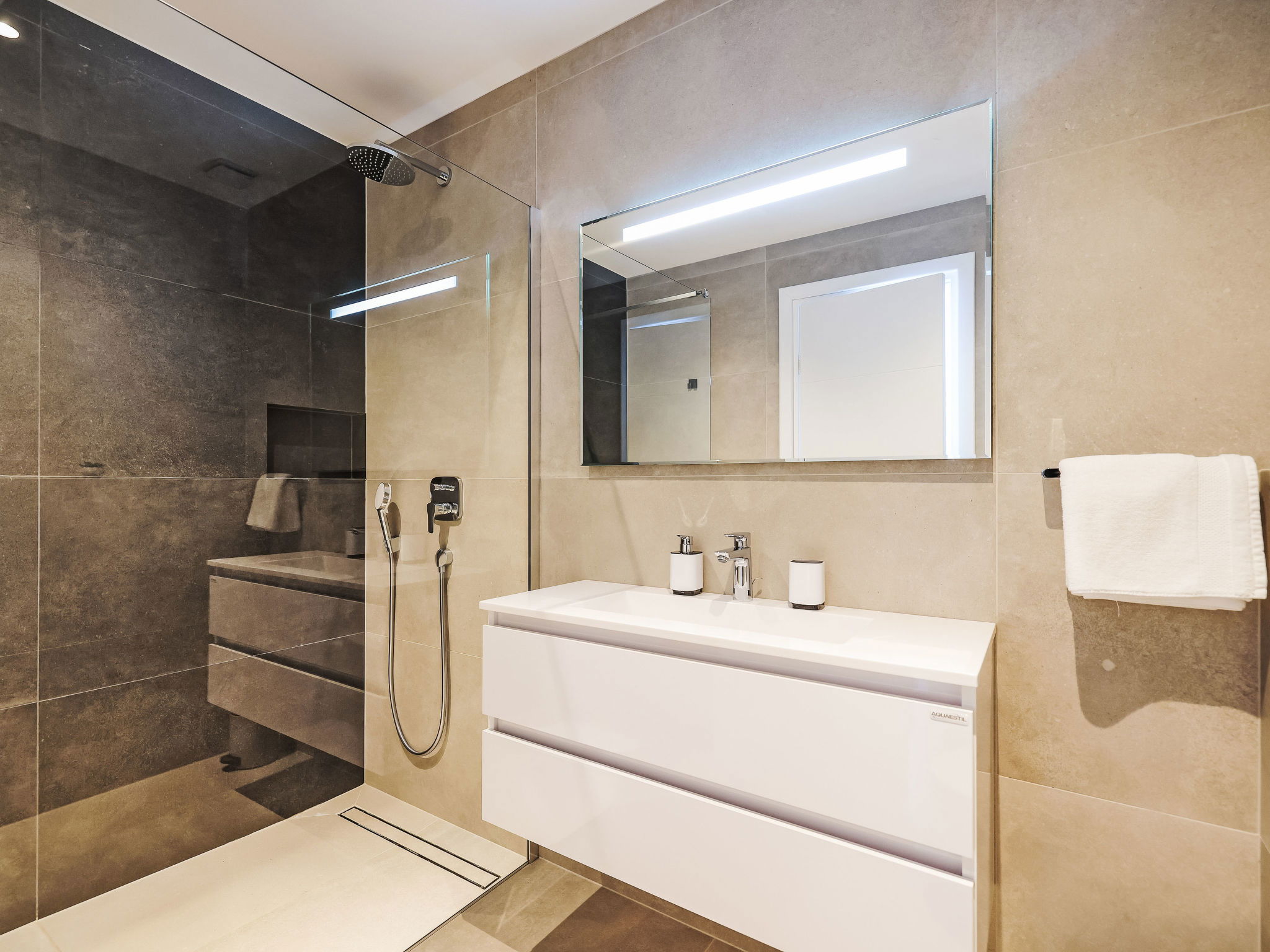 5-room villa 160 m2 on 2 levels. Living/dining room with satellite TV (flat screen), air conditioning. Exit to the terrace. 1 room with 2 beds (90 cm, length 200 cm), shower/WC and satellite TV (flat screen), air conditioning. Exit to the terrace. Open kitchen (dishwasher, 4 induction hot plates, kettle, microwave, freezer, electric coffee machine). Shower/WC. Upper floor: 1 room with 1 french bed (180 cm, length 200 cm), shower/WC and satellite TV (flat screen). 1 room with 1 french bed (160 cm, length 200 cm), shower/WC and satellite TV (flat screen), air conditioning. 1 room with 1 french bed (180 cm, length 200 cm), shower/WC and satellite TV (flat screen), air conditioning. Exit to the balcony. No heating option. Balcony 11 m2, terrace 21 m2, roofed. Terrace furniture, electric barbecue, deck chairs (6). Very beautiful view of the sea. Facilities: safe, hair dryer. Internet (WiFi, free). Please note: fire extinguisher.