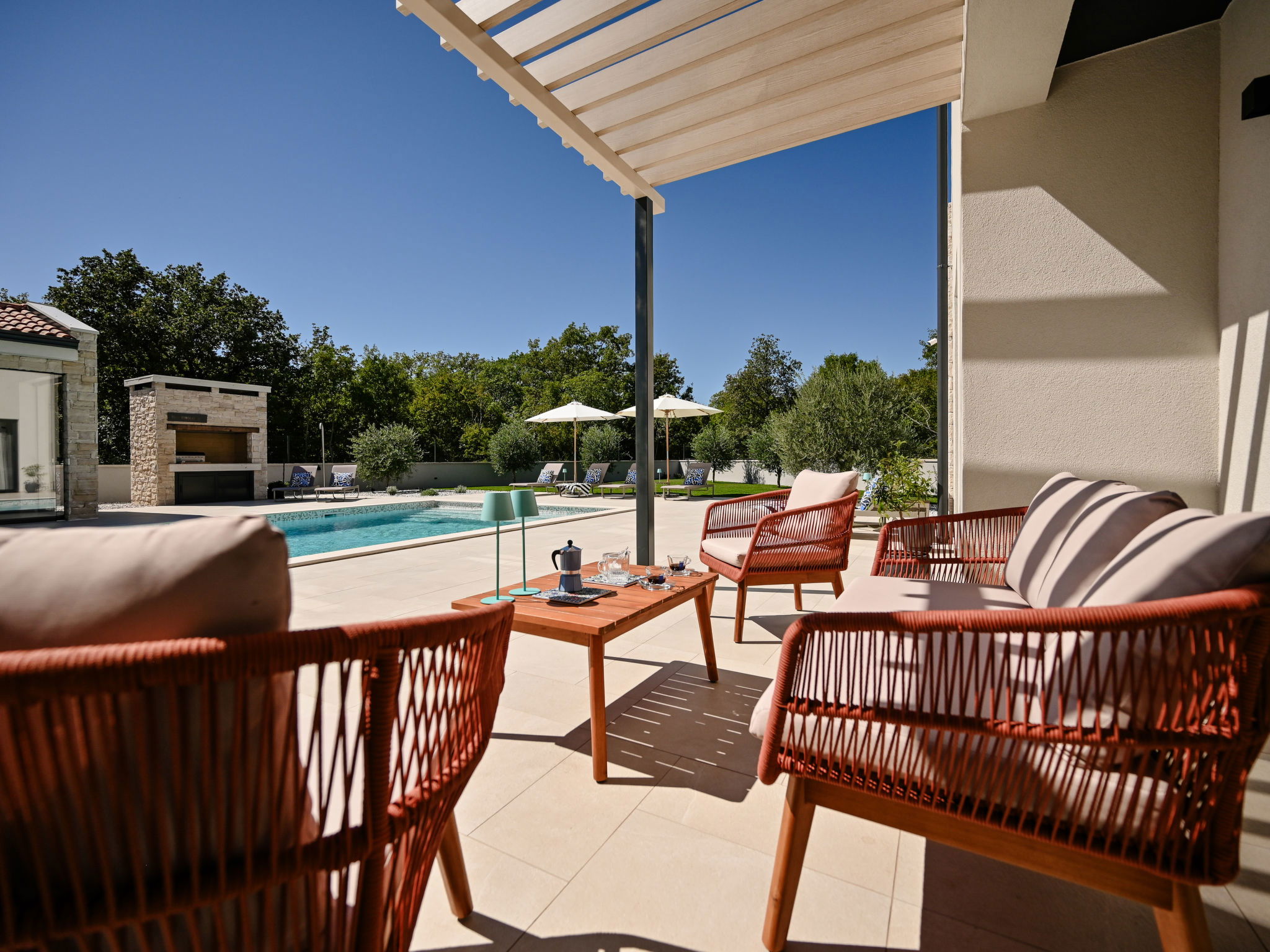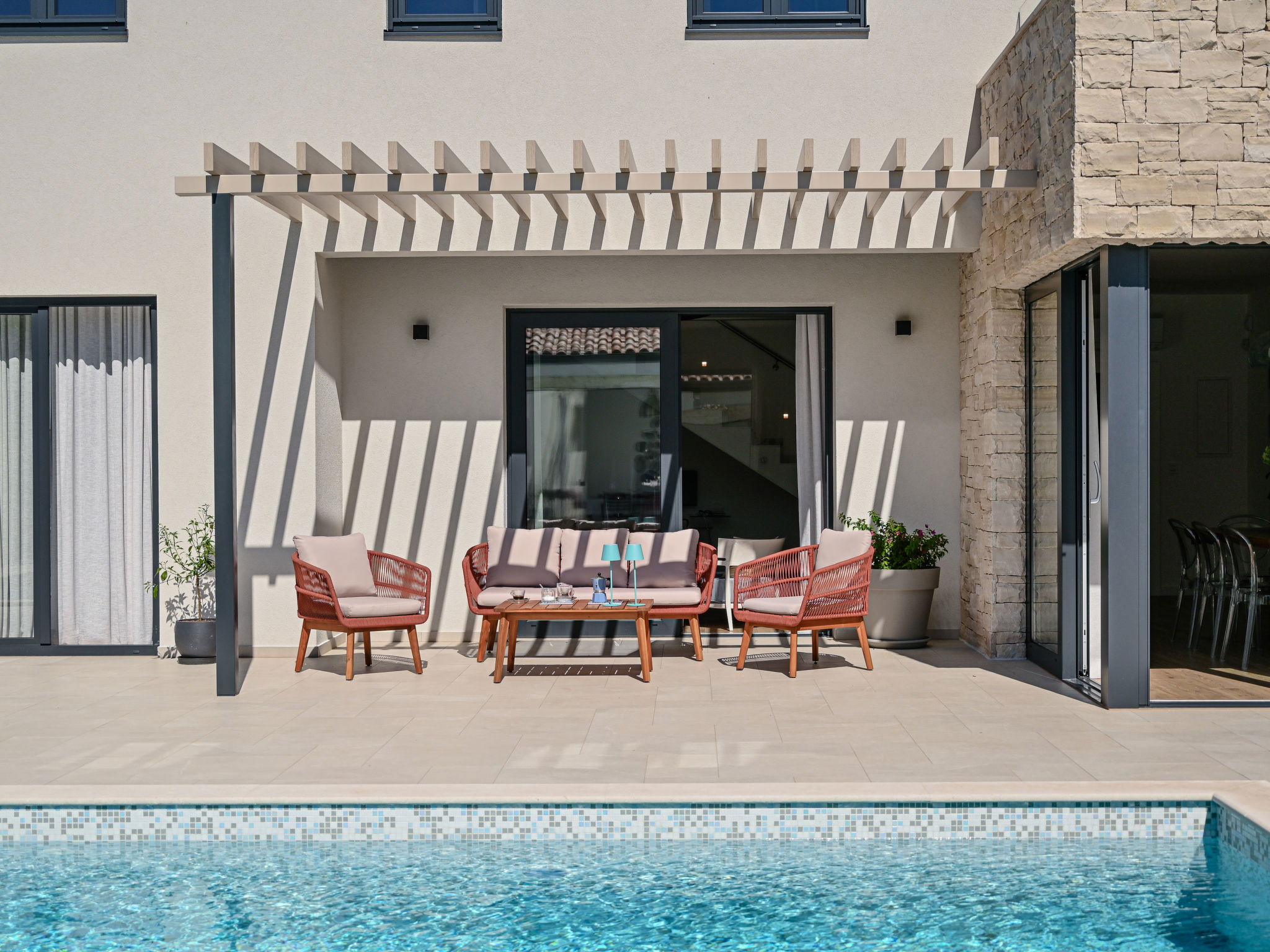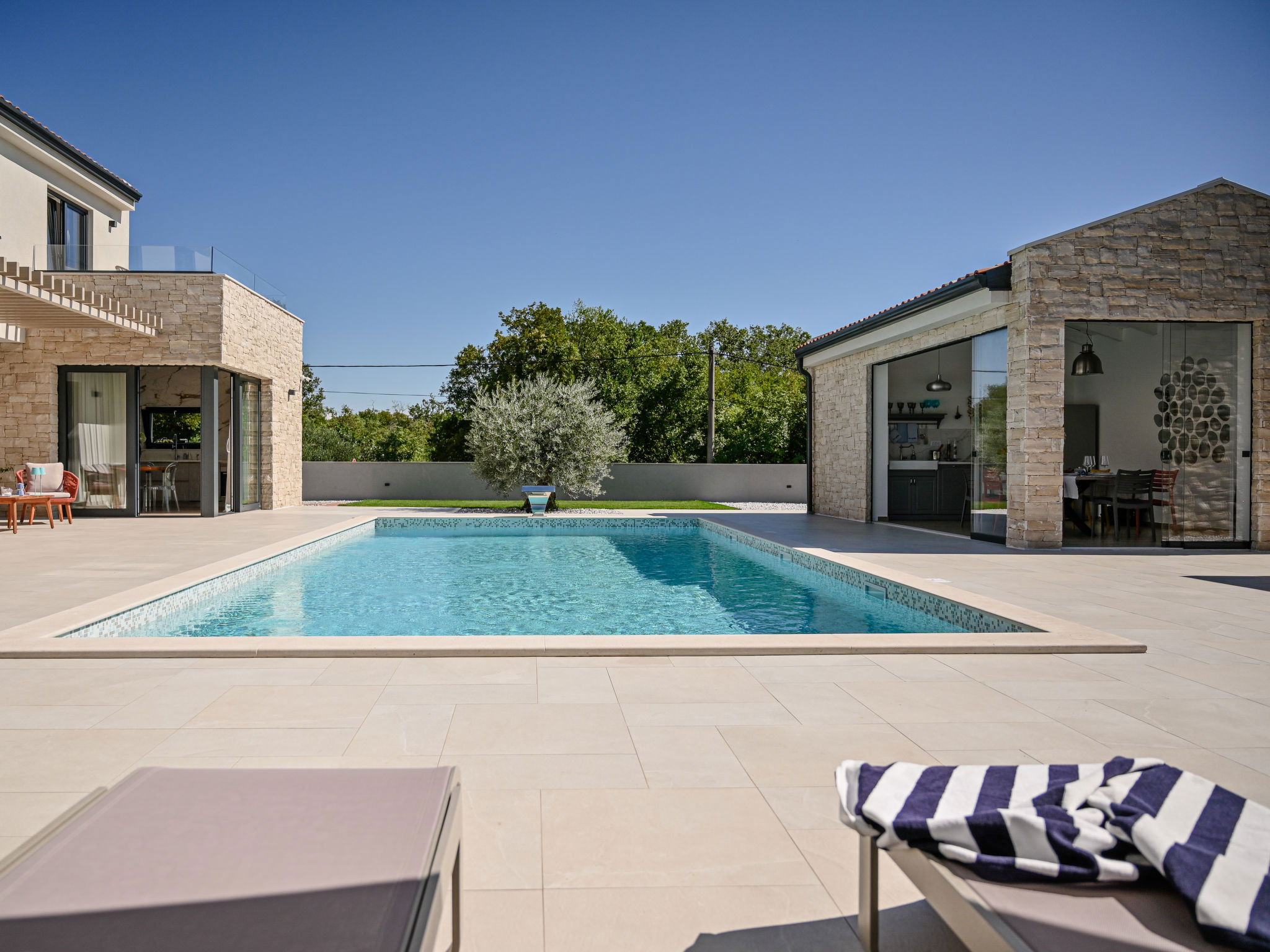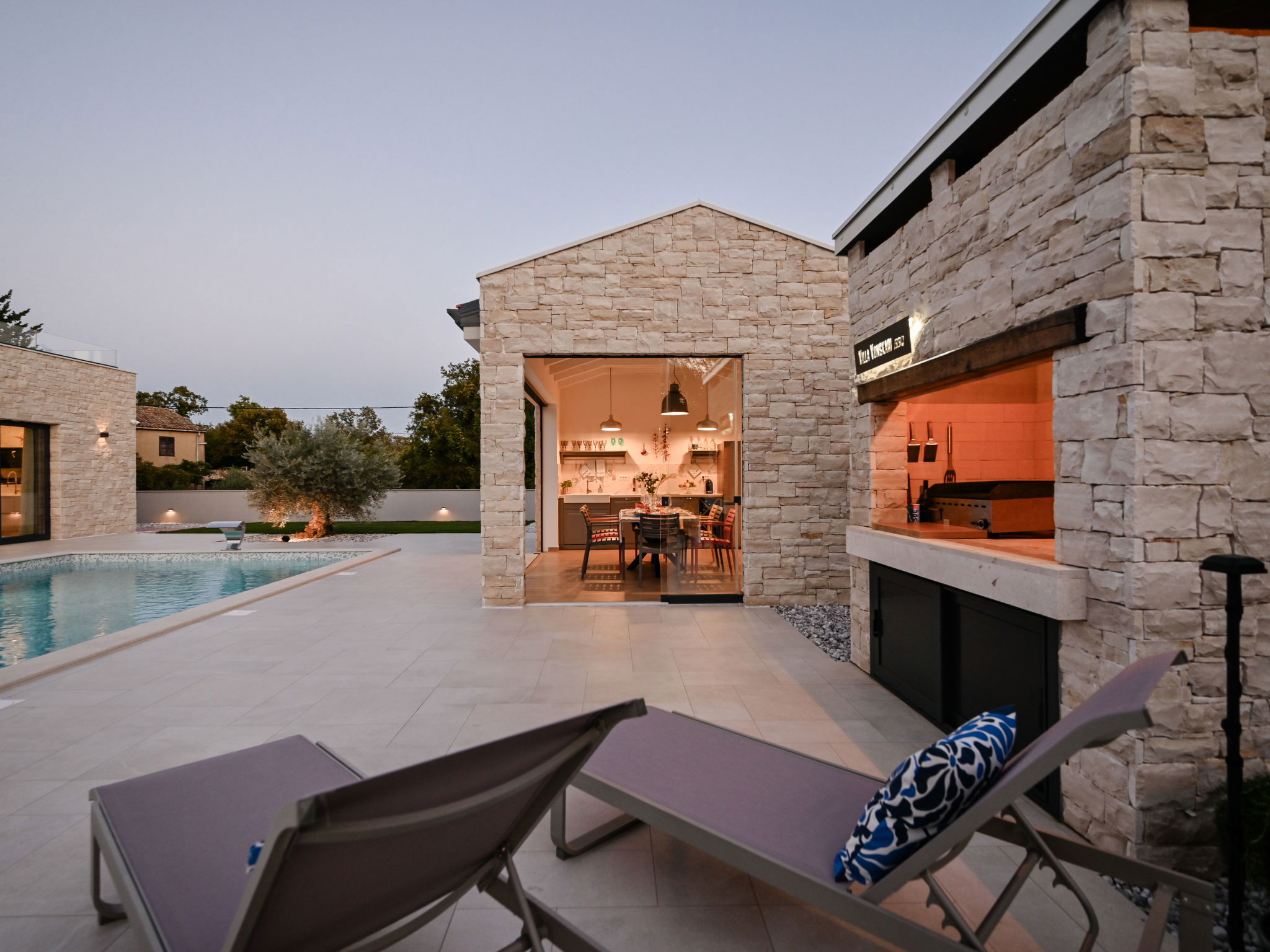 Kras: Modern, luxurious villa "Vonskari", 2 storeys, built in 2025. 3.5 km from the centre of Dobrinj, 7 km from the centre of Malinska, 8 km from the centre of Krk, 6 km from the sea, 6 km from the beach, in the countryside. Private: property 1'177 m2 (fenced), well-kept garden with lawn, swimming pool angular, heated (50 m2, depth 140 cm, seasonal availability: 25.Apr. - 01.Oct.) with internal staircase and salt-electrolysis pool-cleaning system. WC in the pool area, outdoor shower, pool house with fridge, WC and cooking stove, garden furniture, barbecue, pool maintenance by the owner/gardener. In the house: internet access, air conditioning, washing machine. Parking (for 3 cars) at the house on the premises. E-charging station. Shop 500 m, supermarket 5 km, bus stop 500 m, pebble beach 6 km. Please note: airfield 20 km from the property.
