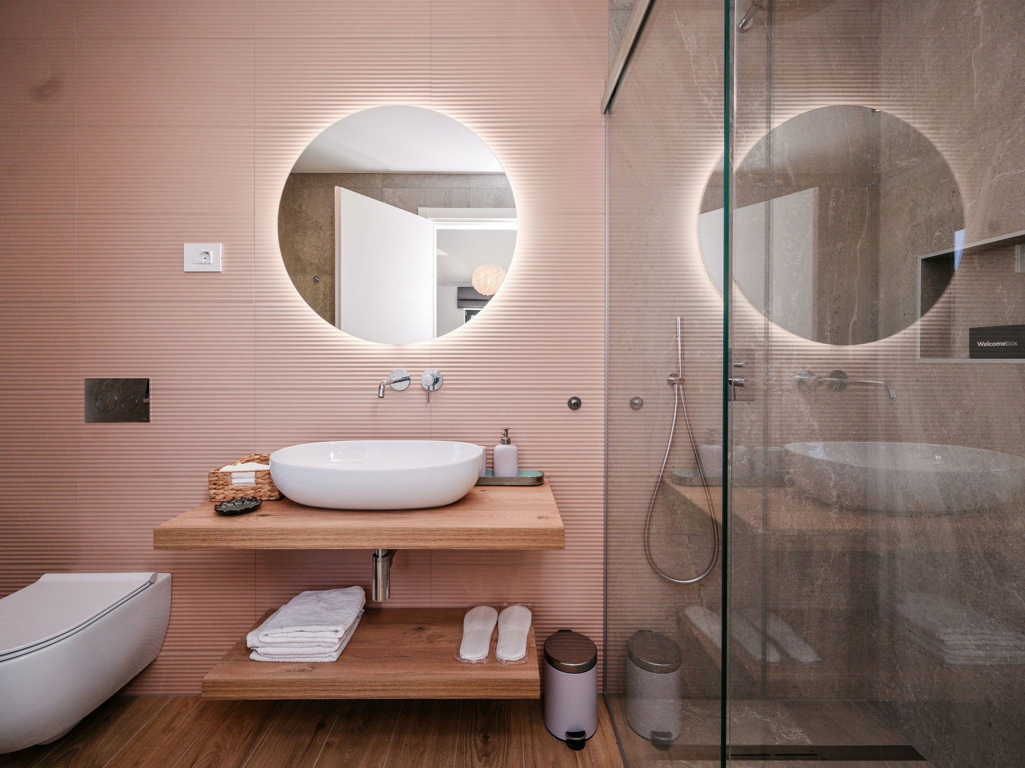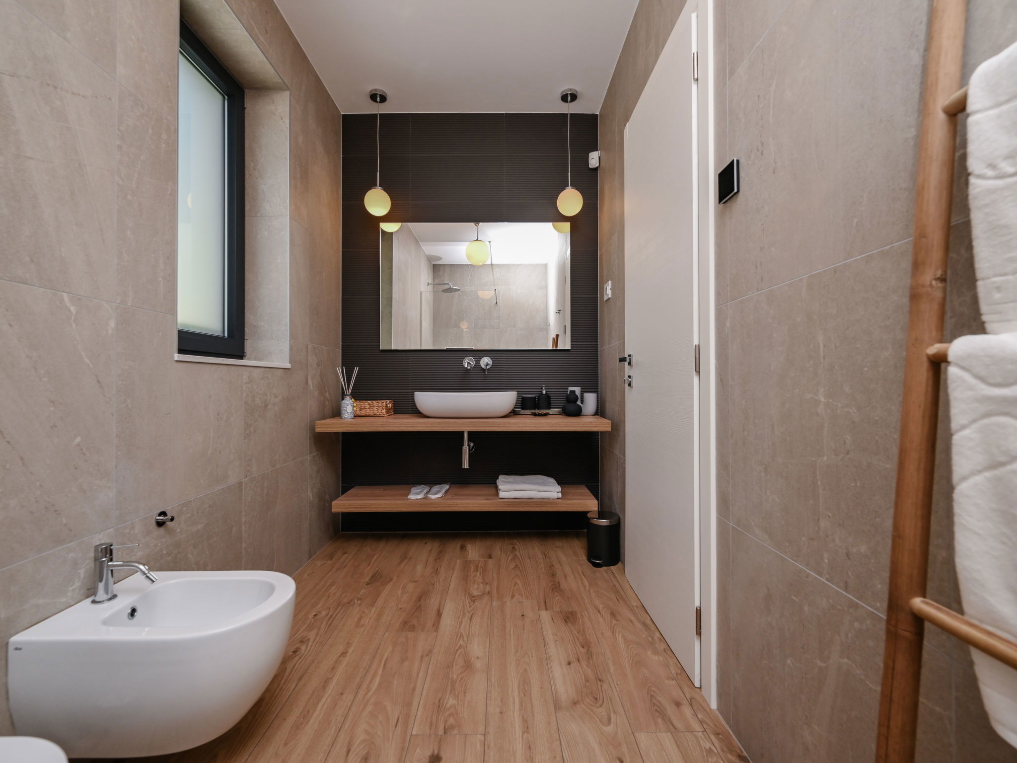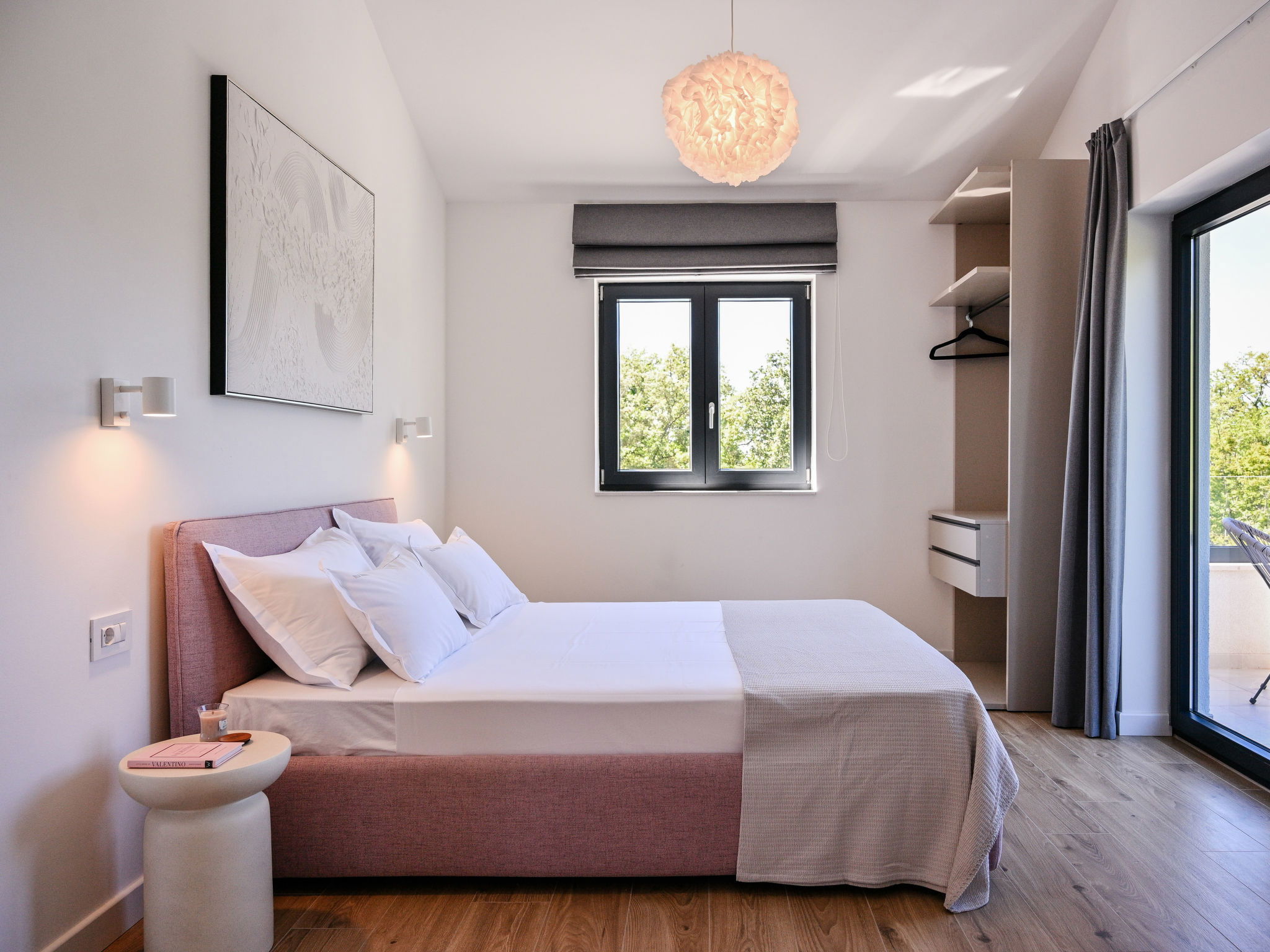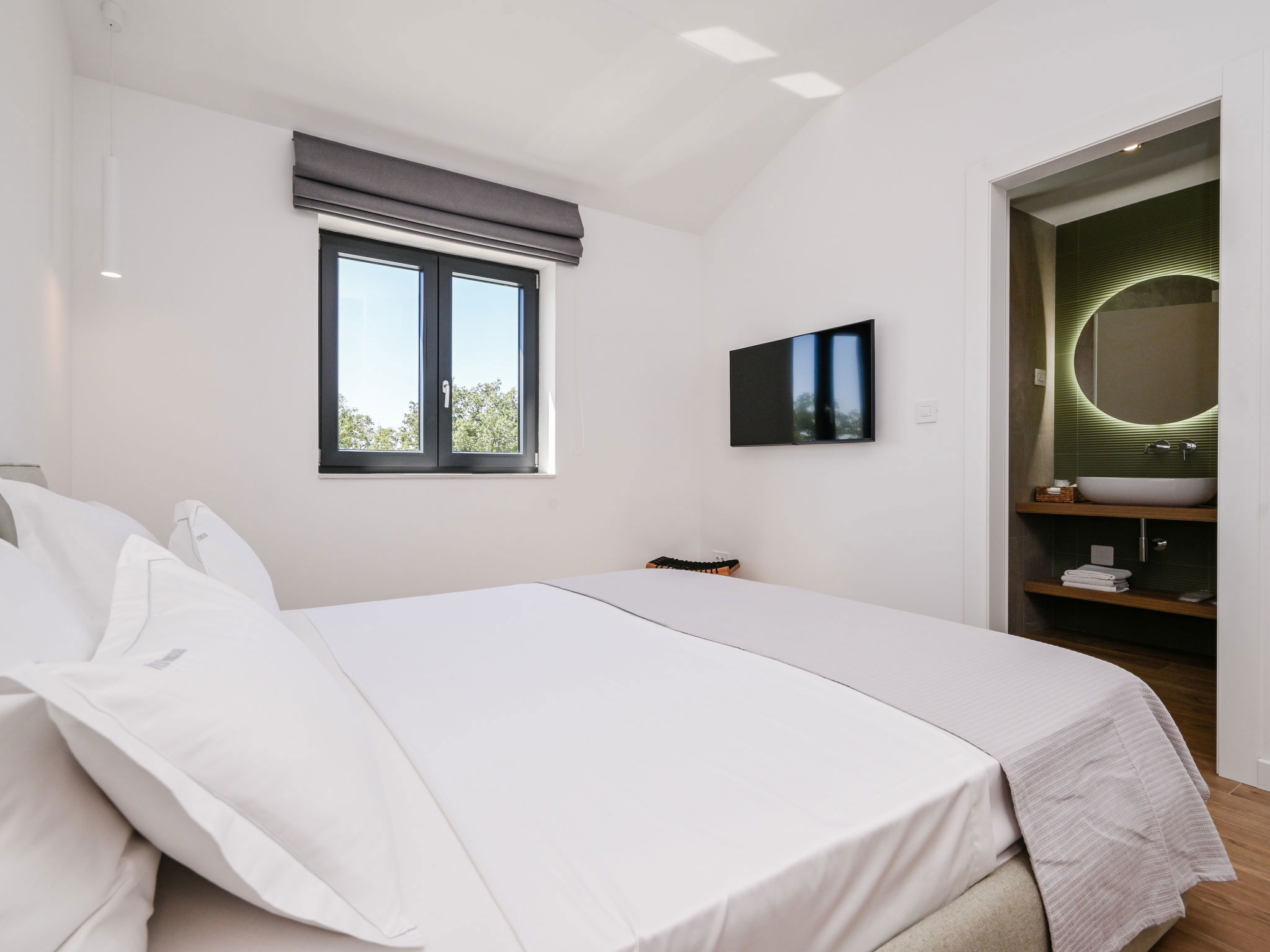 Kras: Modern, luxurious villa "Vonskari", 2 storeys, built in 2025. 3.5 km from the centre of Dobrinj, 7 km from the centre of Malinska, 8 km from the centre of Krk, 6 km from the sea, 6 km from the beach, in the countryside. Private: property 1'177 m2 (fenced), well-kept garden with lawn, swimming pool angular, heated (50 m2, depth 140 cm, seasonal availability: 25.Apr. - 01.Oct.) with internal staircase and salt-electrolysis pool-cleaning system. WC in the pool area, outdoor shower, pool house with fridge, WC and cooking stove, garden furniture, barbecue, pool maintenance by the owner/gardener. In the house: internet access, air conditioning, washing machine. Parking (for 3 cars) at the house on the premises. E-charging station. Shop 500 m, supermarket 5 km, bus stop 500 m, pebble beach 6 km. Please note: airfield 20 km from the property.