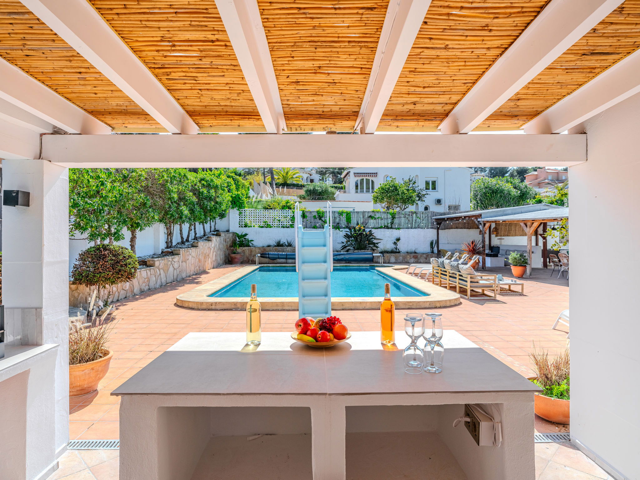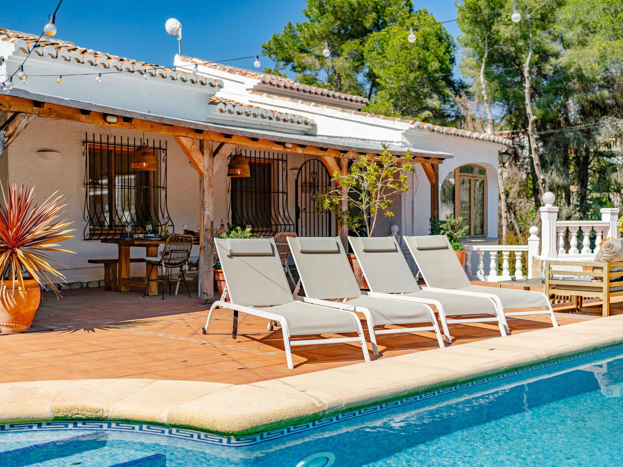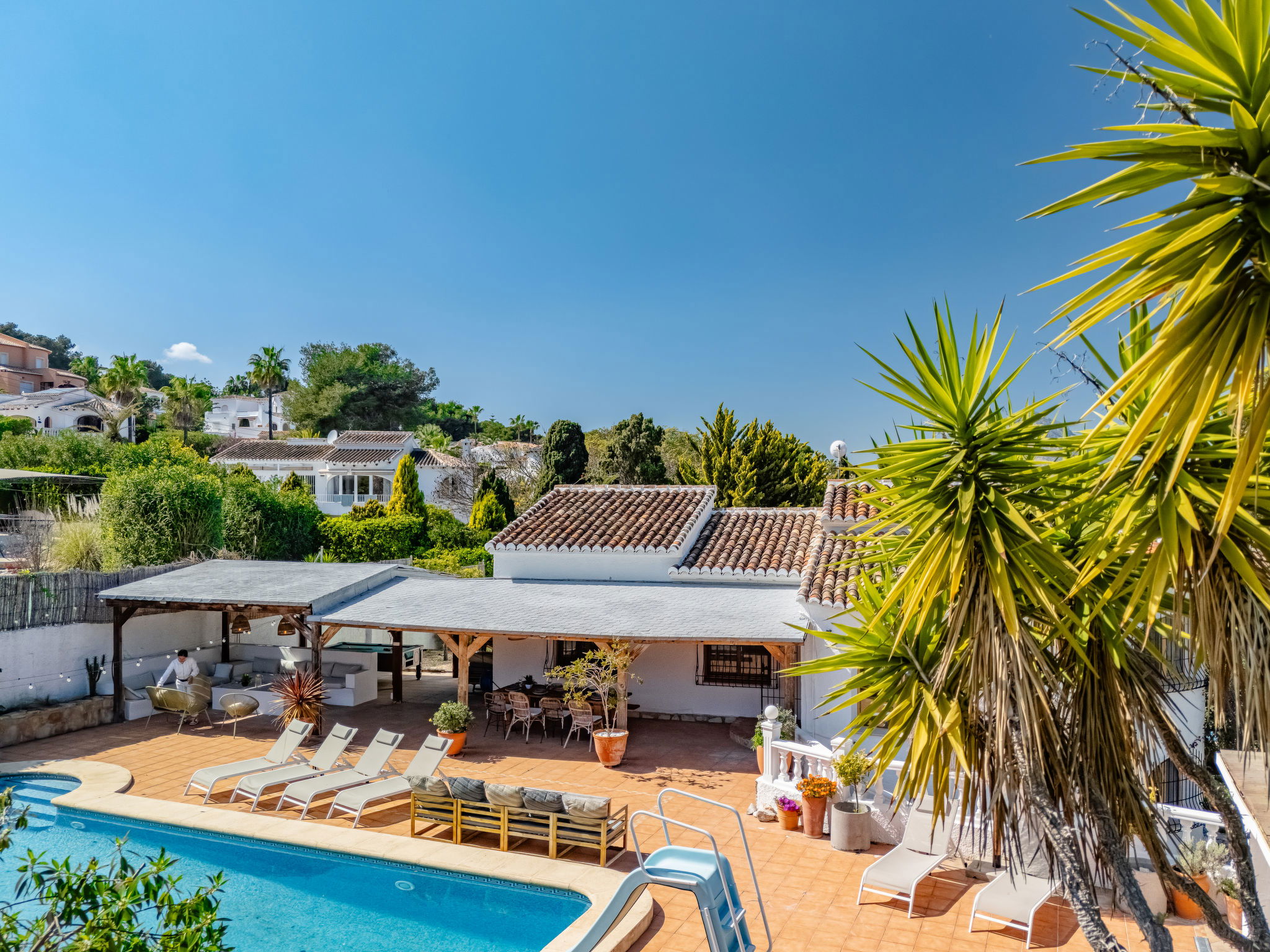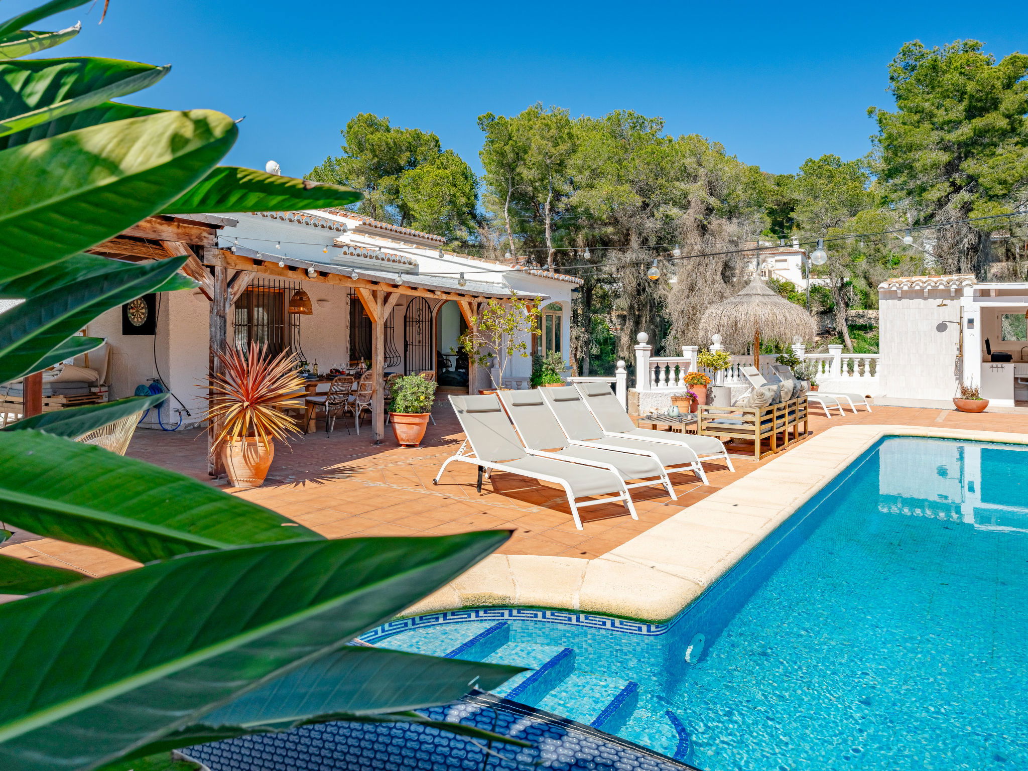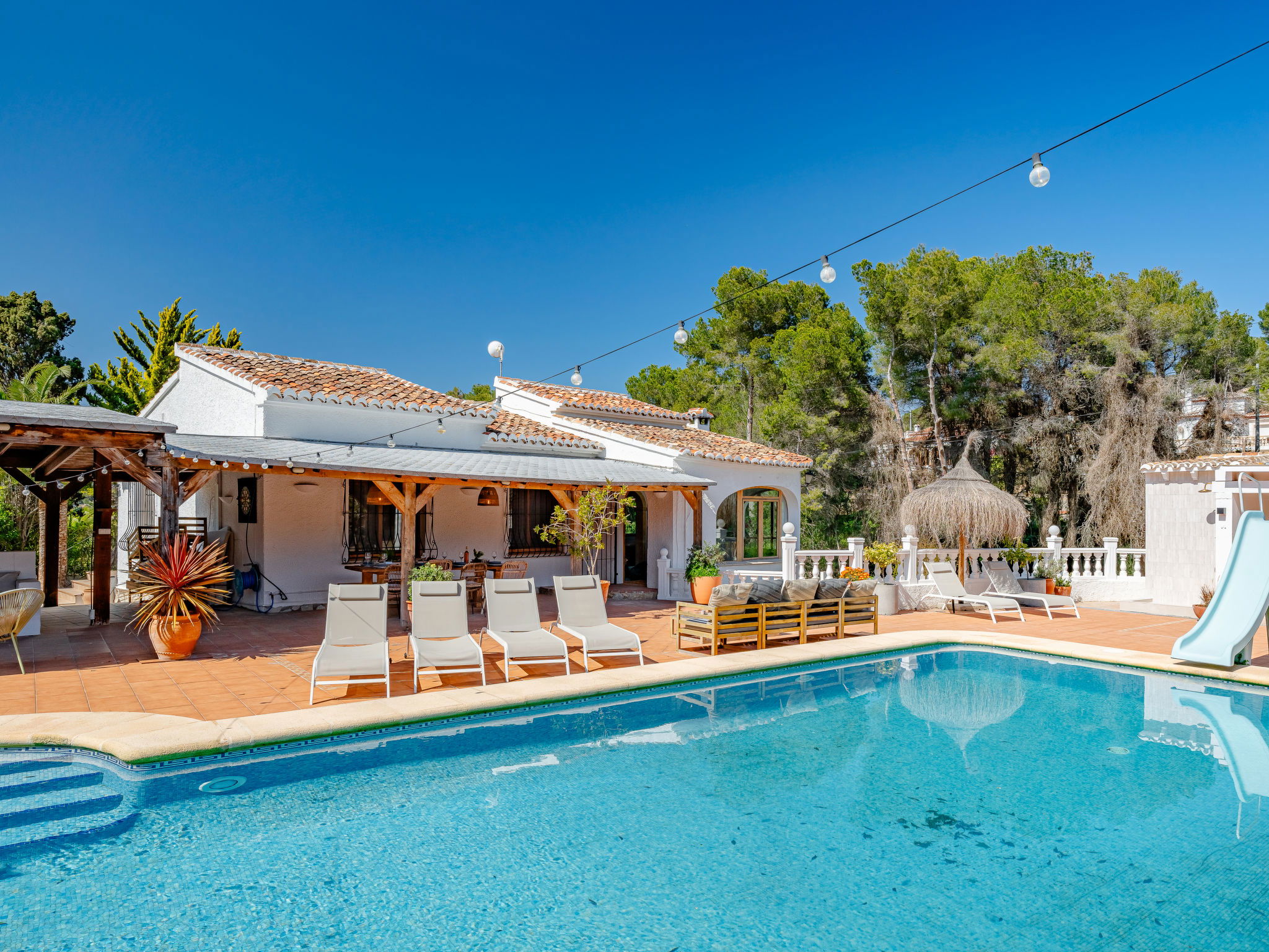 "Casa Sierra Pinos Plus", 6-room villa 320 m2 on 2 levels. Spacious and bright, renovated, very beautiful and stylish furnishings: living/dining room with satellite TV, air conditioning and forced-air heating. Exit pergola, to the swimming pool. 1 room with 1 french bed (160 cm, length 200 cm), shower/WC, air conditioning and forced-air heating. 1 room with 1 french bed (160 cm, length 200 cm), air conditioning and forced-air heating. 1 room with 1 x 2 bunk beds (90 cm, length 200 cm), air conditioning and forced-air heating. Kitchen (oven, dishwasher, 5 gas rings, toaster, kettle, microwave, freezer, electric coffee machine, Capsules for coffee machine (Nespresso) extra). Bath/WC. On the lower ground floor: 1 room with 1 french bed (180 cm, length 200 cm), bath/WC, air conditioning and forced-air heating. 1 room with 1 french bed (180 cm, length 200 cm), shower/WC, air conditioning and forced-air heating. Exit to the patio. Small kitchen (toaster, kettle, microwave, freezer, electric coffee machine, Capsules for coffee machine (Nespresso) extra). Large garden, lawn. Terrace furniture, barbecue, deck chairs (6), covered balcony, sitting area. Facilities: washing machine, iron, children's high chair, baby cot, hair dryer. Internet (WiFi, free). Parking, garage. VT-496994-A // Reg. Nr.: ESFCTU00000307100037223400000000000000000VT-496994-A0