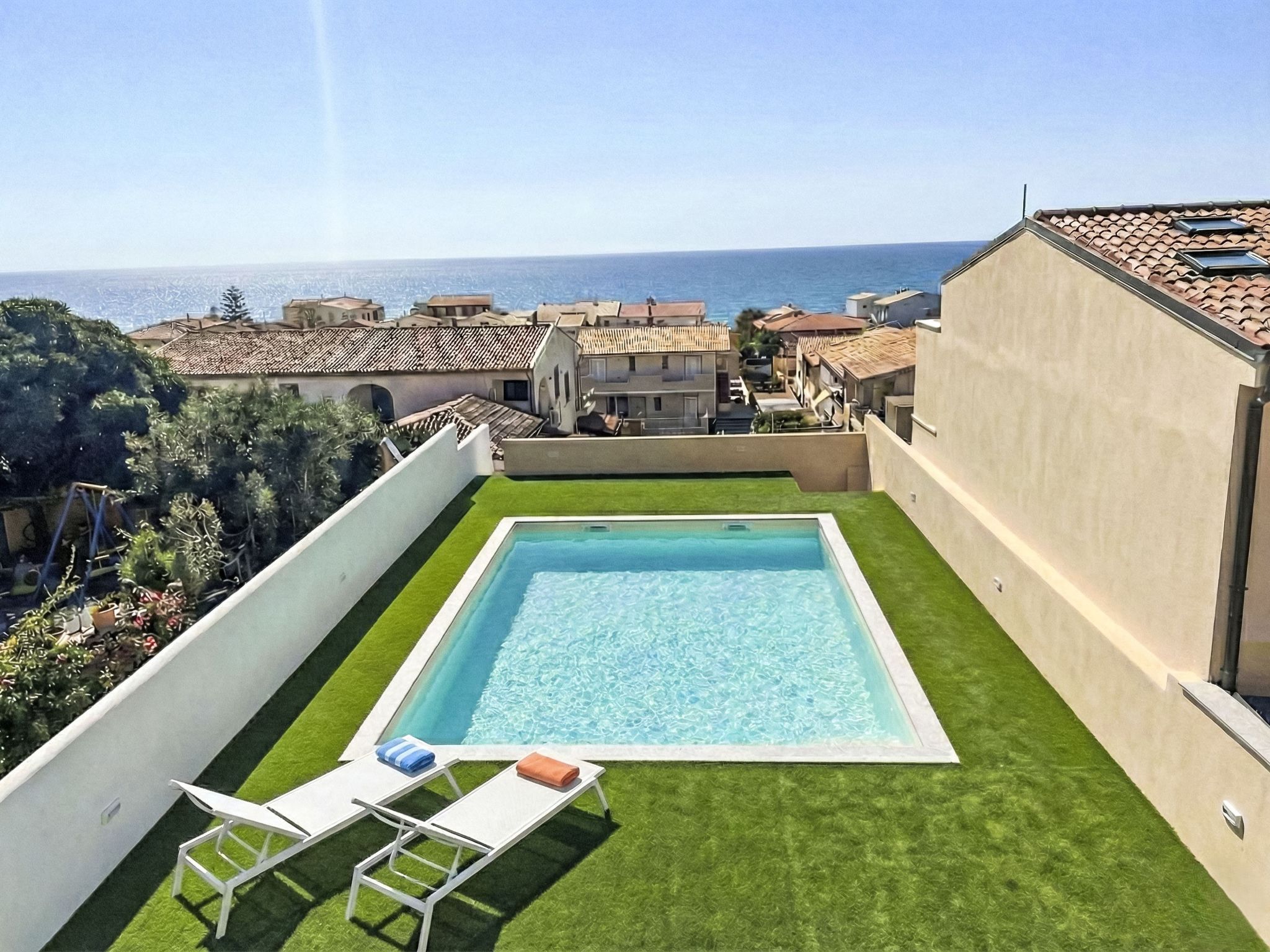 "Cristallo di mare", 3-room penthouse 64 m2 on 1st floor. Bright, modern and cosy furnishings: living/dining room with satellite TV. Exit to the terrace. 2 rooms, each room with 1 double bed and satellite TV. Kitchenette (oven, dishwasher, 4 induction hot plates, toaster, kettle, microwave). Shower/bidet/WC. Air-conditioning, forced-air heating. Partly. Terrace furniture, sitting area. Very beautiful view of the sea and the swimming pool. Facilities: iron, mosquito net, hair dryer. Internet (WiFi, free). Parking (1 car) at the house. Maximum 1 small pet/ dog allowed. IT090079C2000U1841