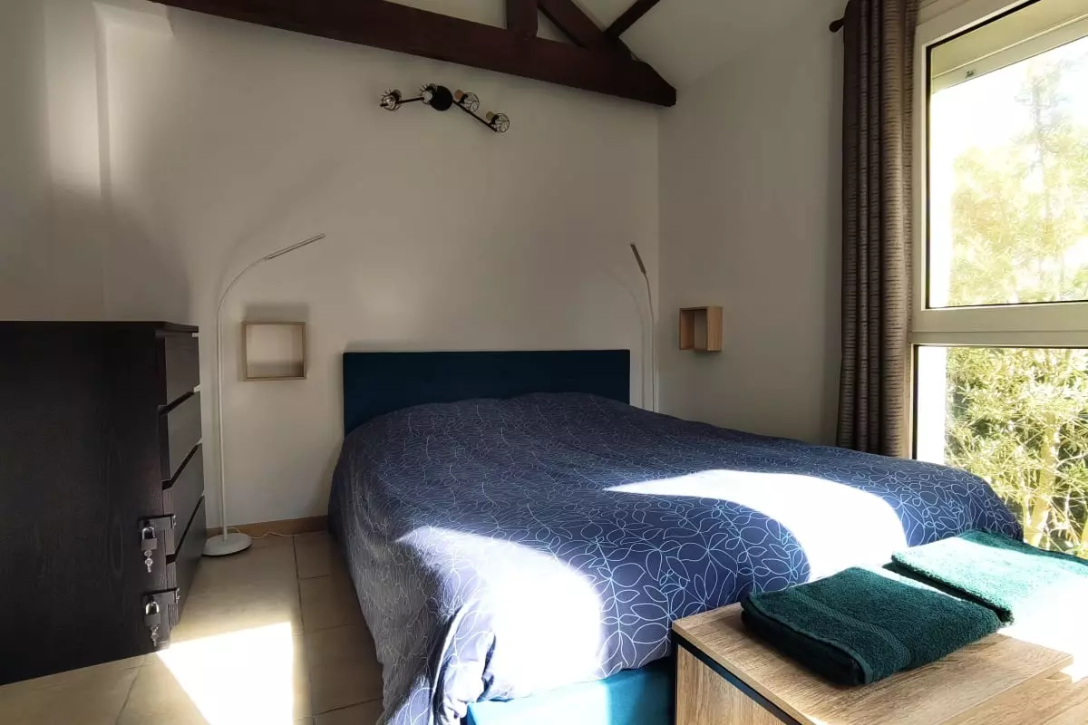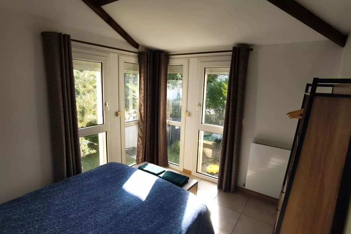 The sleeping area consists of a welcoming bedroom with a 160x190 double bed and a standard-sized travel cot for young children.