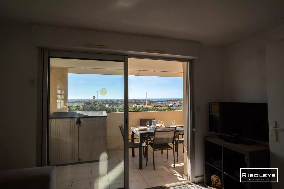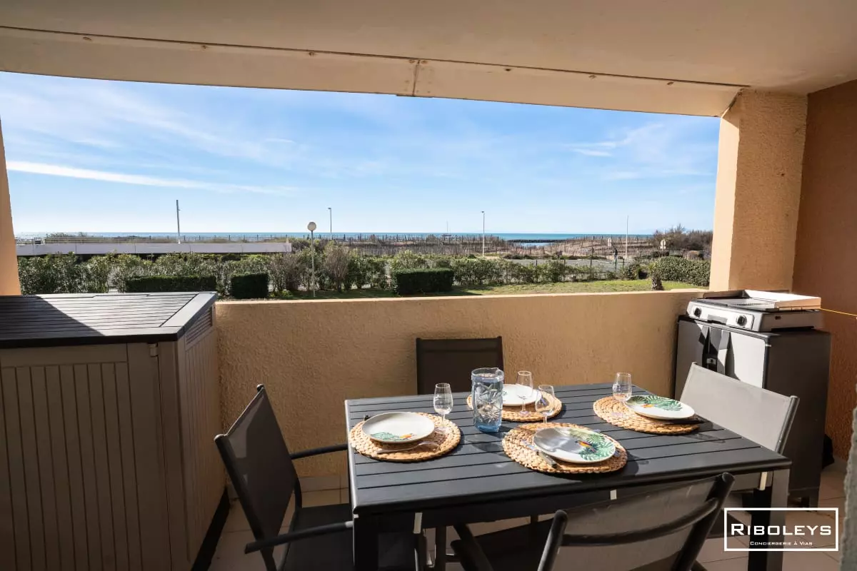 The living room opens onto a furnished balcony with a dining area facing the sea, ideal for enjoying meals outdoors.