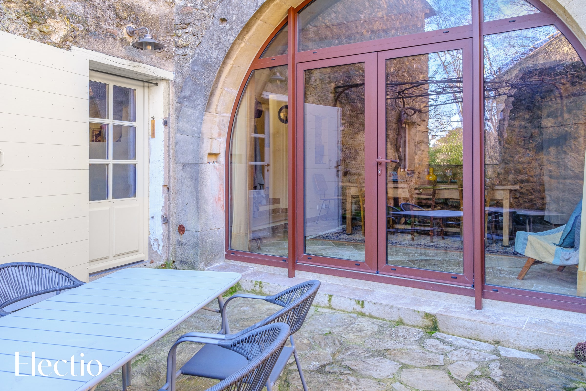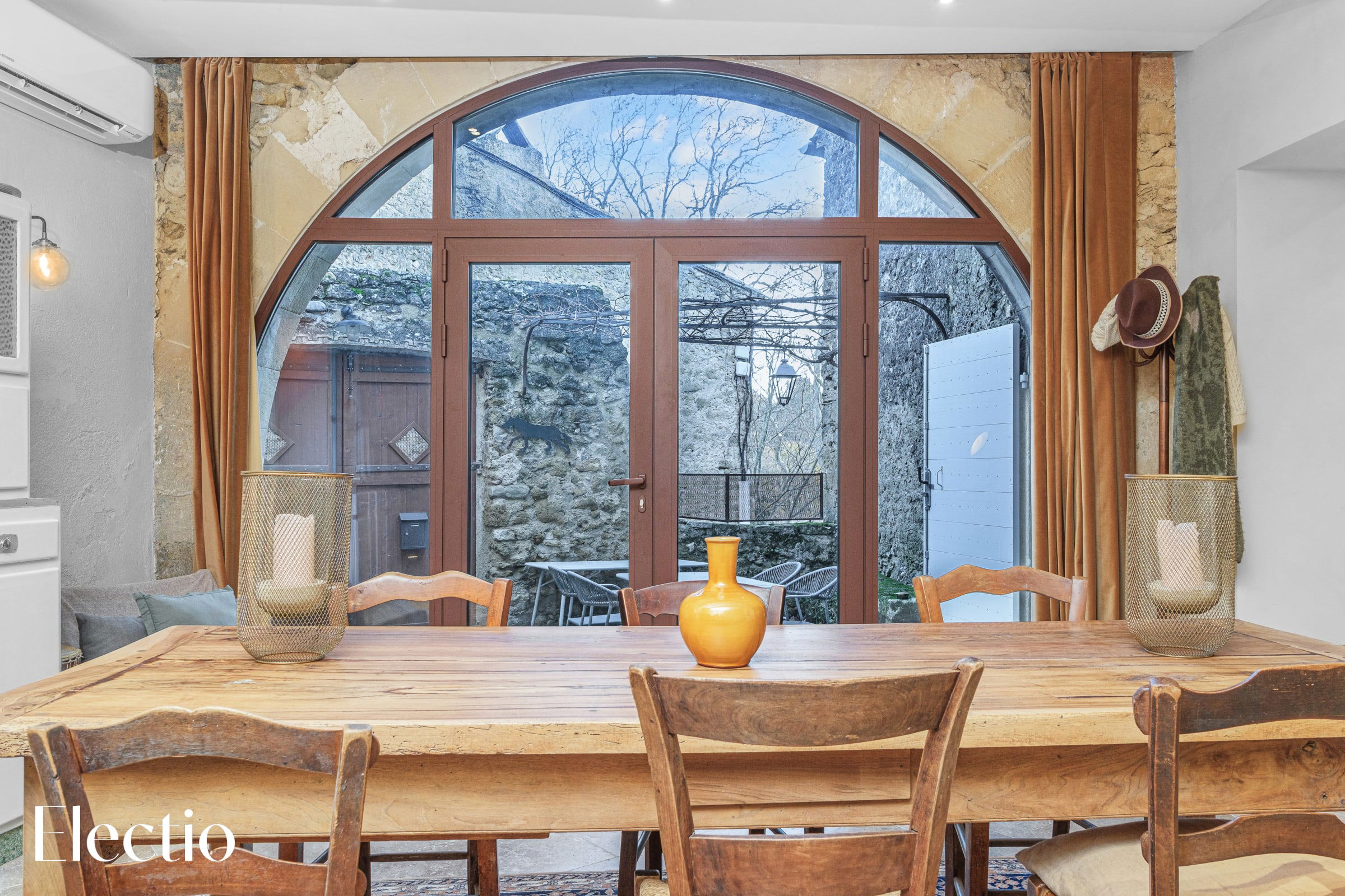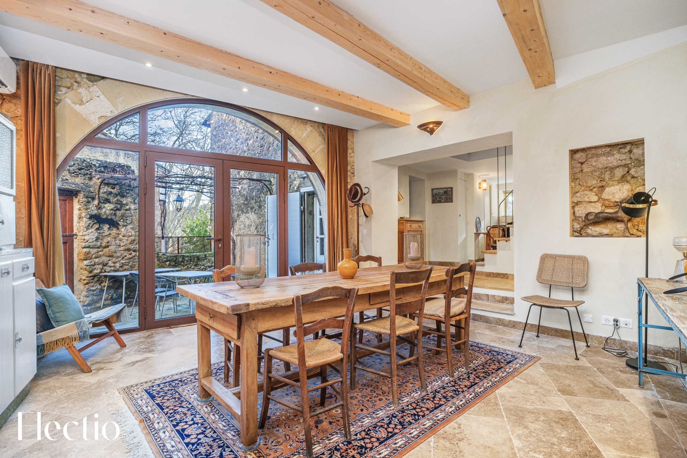 Behind the dining table, a glass door reveals a renovated former indoor cellar, adding a rustic and distinctive touch while recalling the history of the property and emphasizing its unique character.