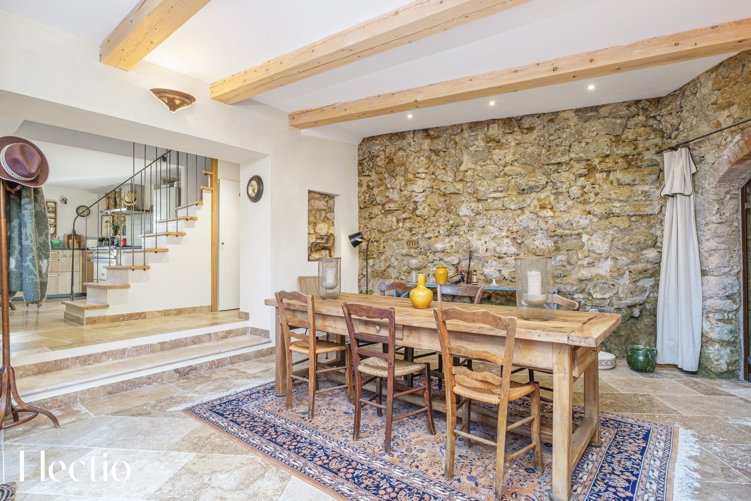 The preserved and highlighted natural stone wall gives the room its full charm and warm atmosphere.