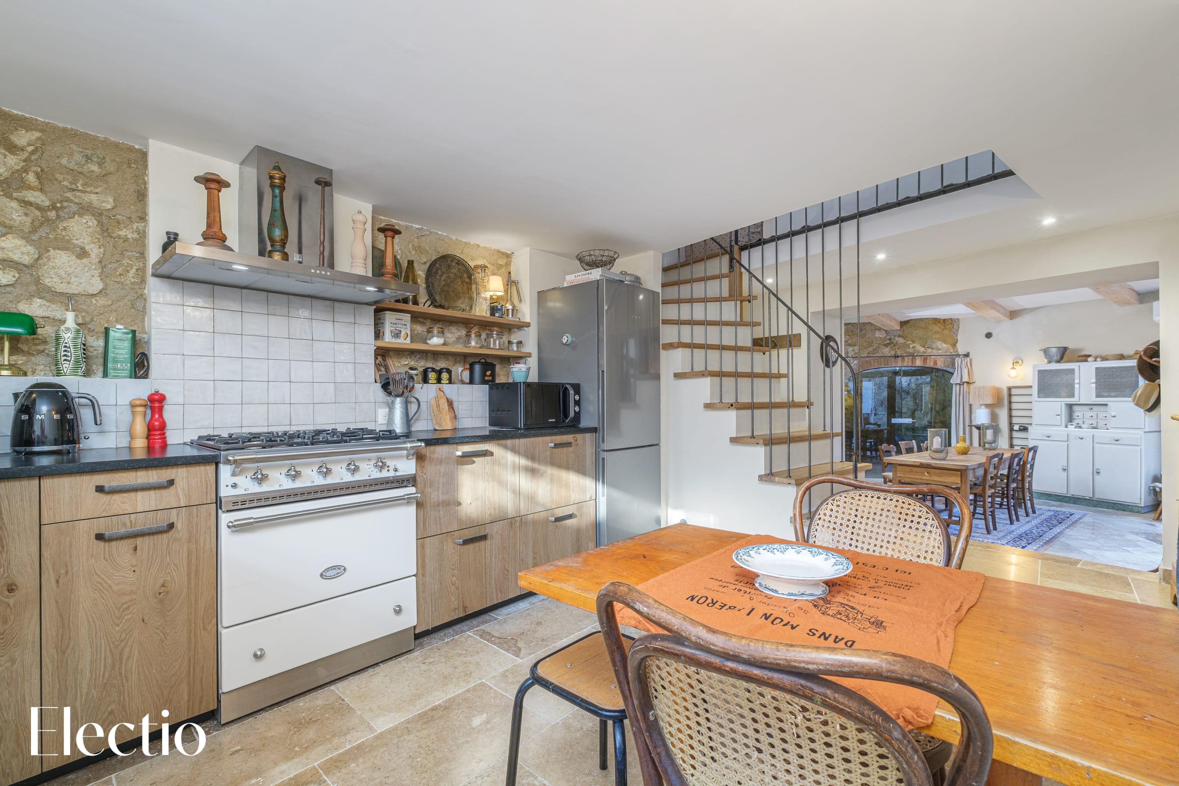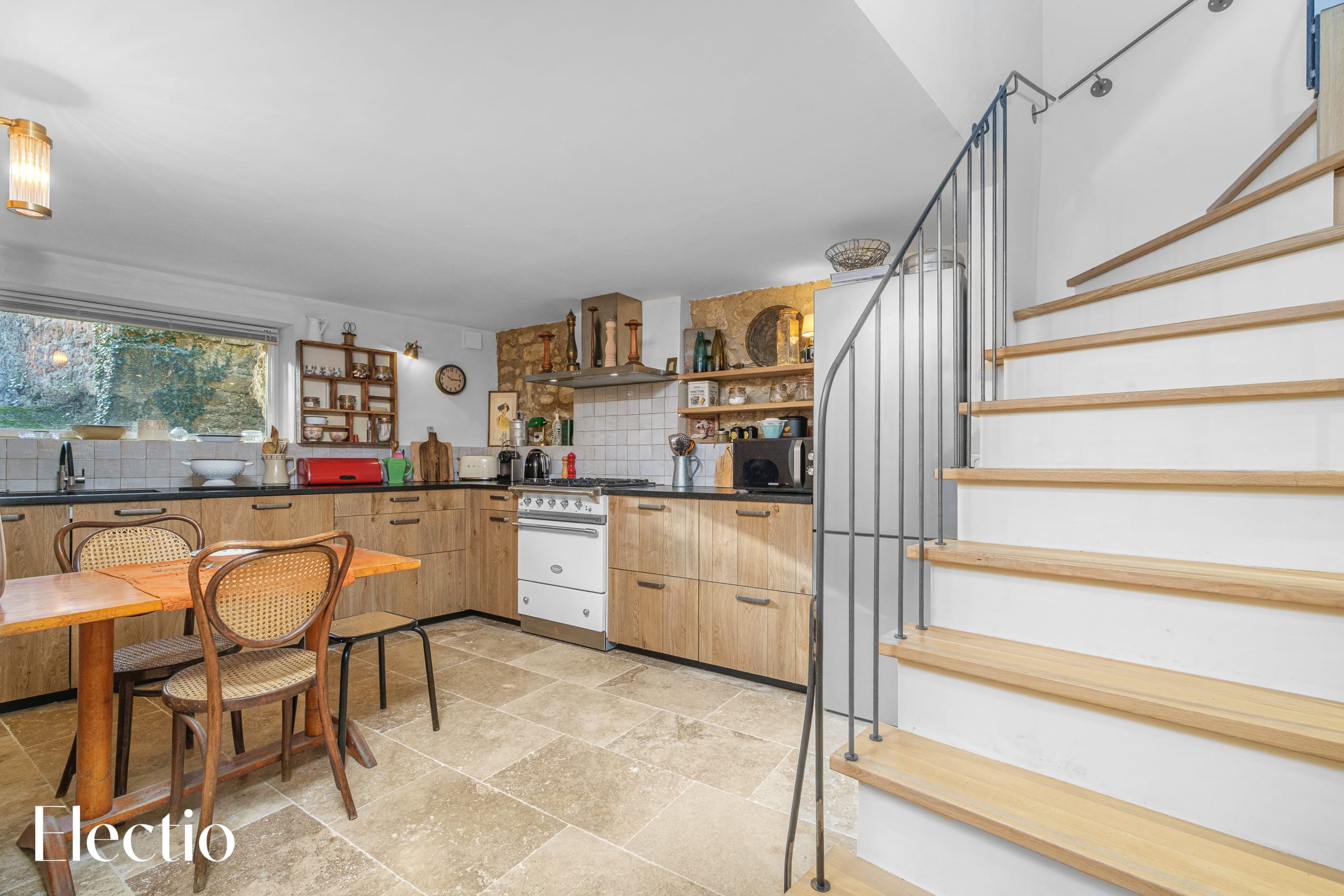 🍽️ Just next door, the fully equipped kitchen charms with its authentic character. It features a Lacanche range cooker, a fridge-freezer, a microwave, a kettle, and a complete set of tableware. A large window above the sink allows natural light to flood in, making the space particularly pleasant for everyday living. A small table also provides the perfect spot for a quick meal or a relaxed moment together.