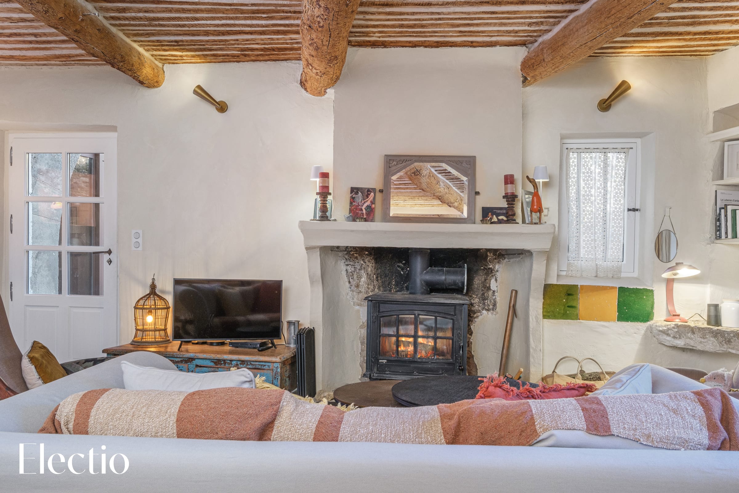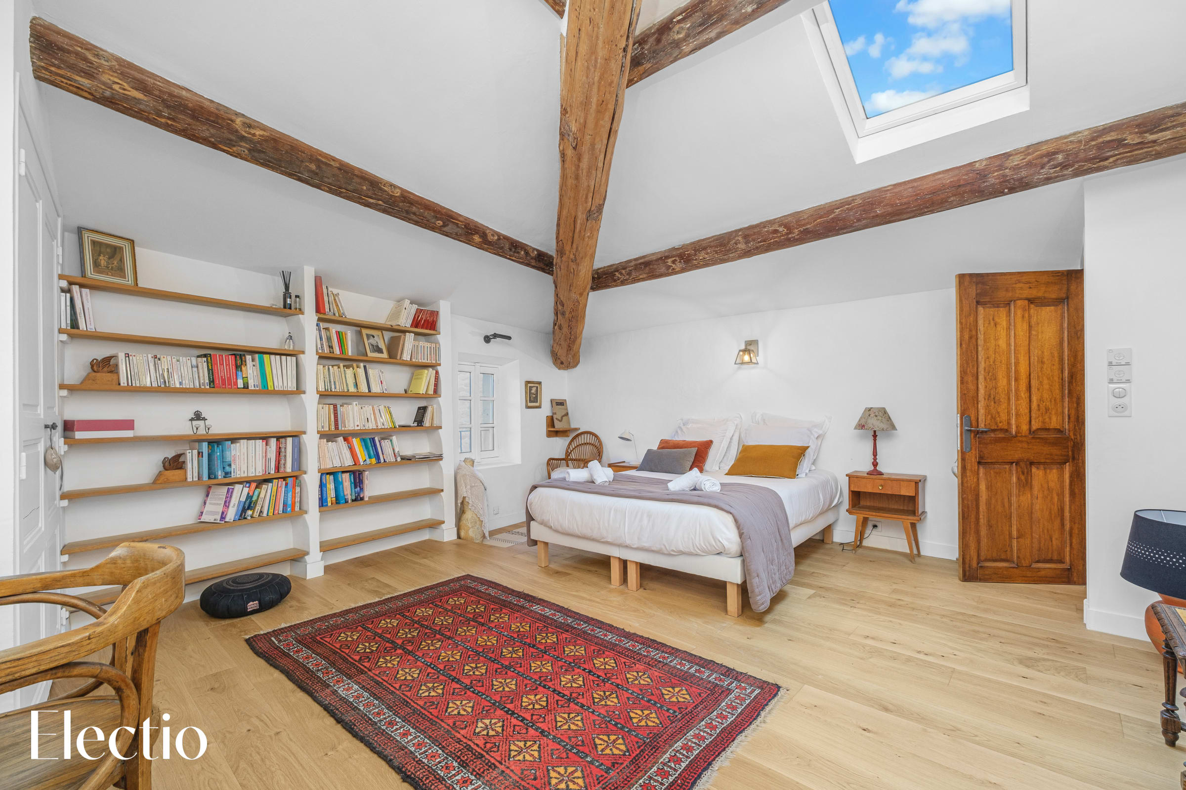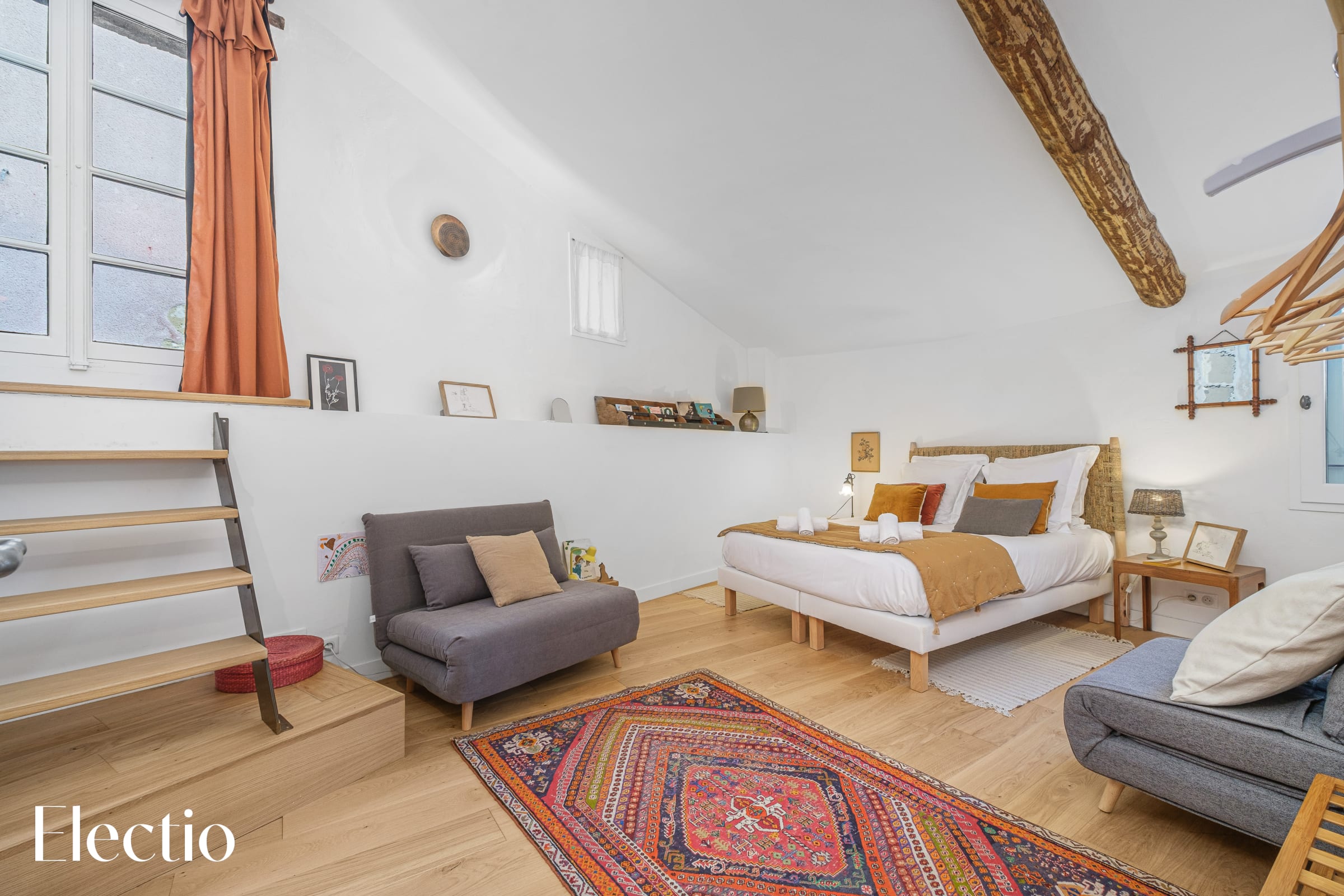 The exposed beams emphasize the room’s authentic character and contribute to its warm atmosphere. A small interior staircase leads to a high window overlooking the surrounding streets, bringing lovely natural light into the room.