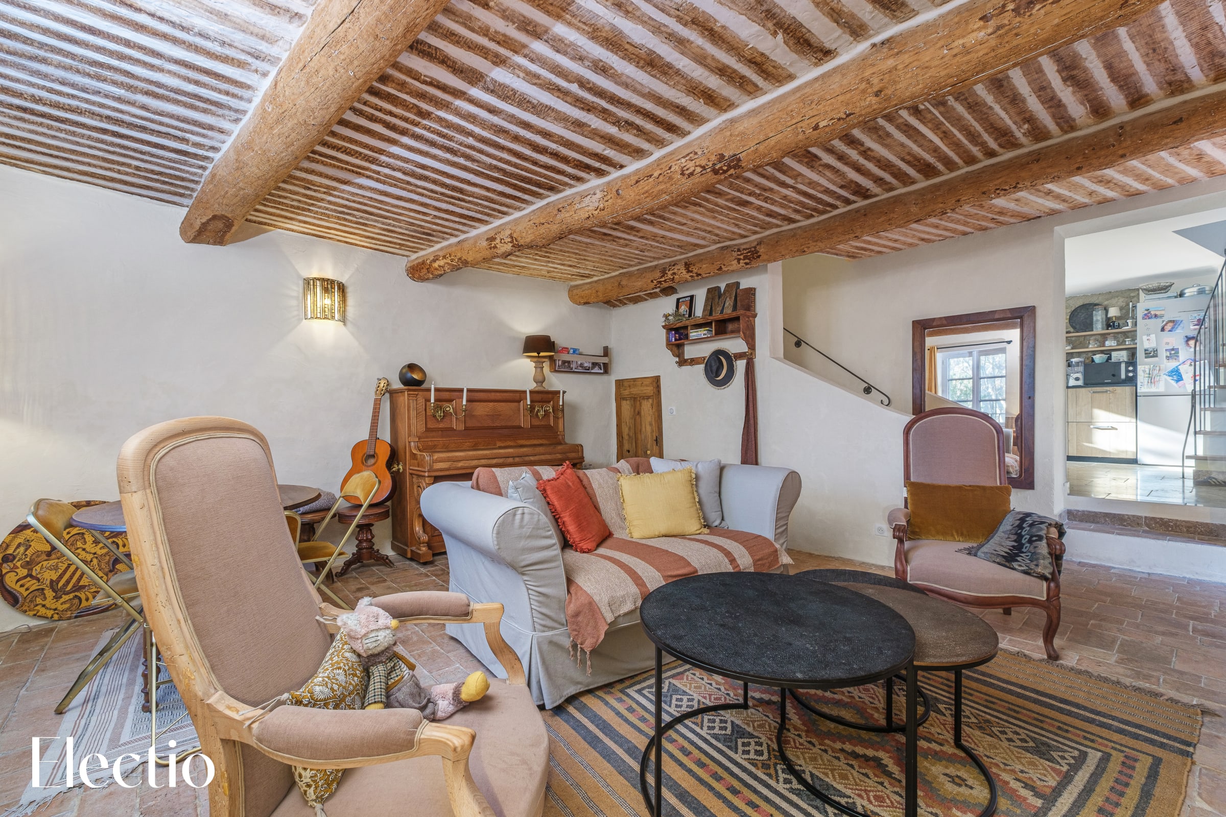 🏡 Once you step through the front door, you enter an elegant and welcoming living room, furnished with a sofa and two armchairs arranged near a wood-burning stove, inviting you to enjoy cooler evenings in a soothing atmosphere by the fire. For music lovers, a piano is available in the living room, offering the opportunity to share and enjoy delicate melodies.