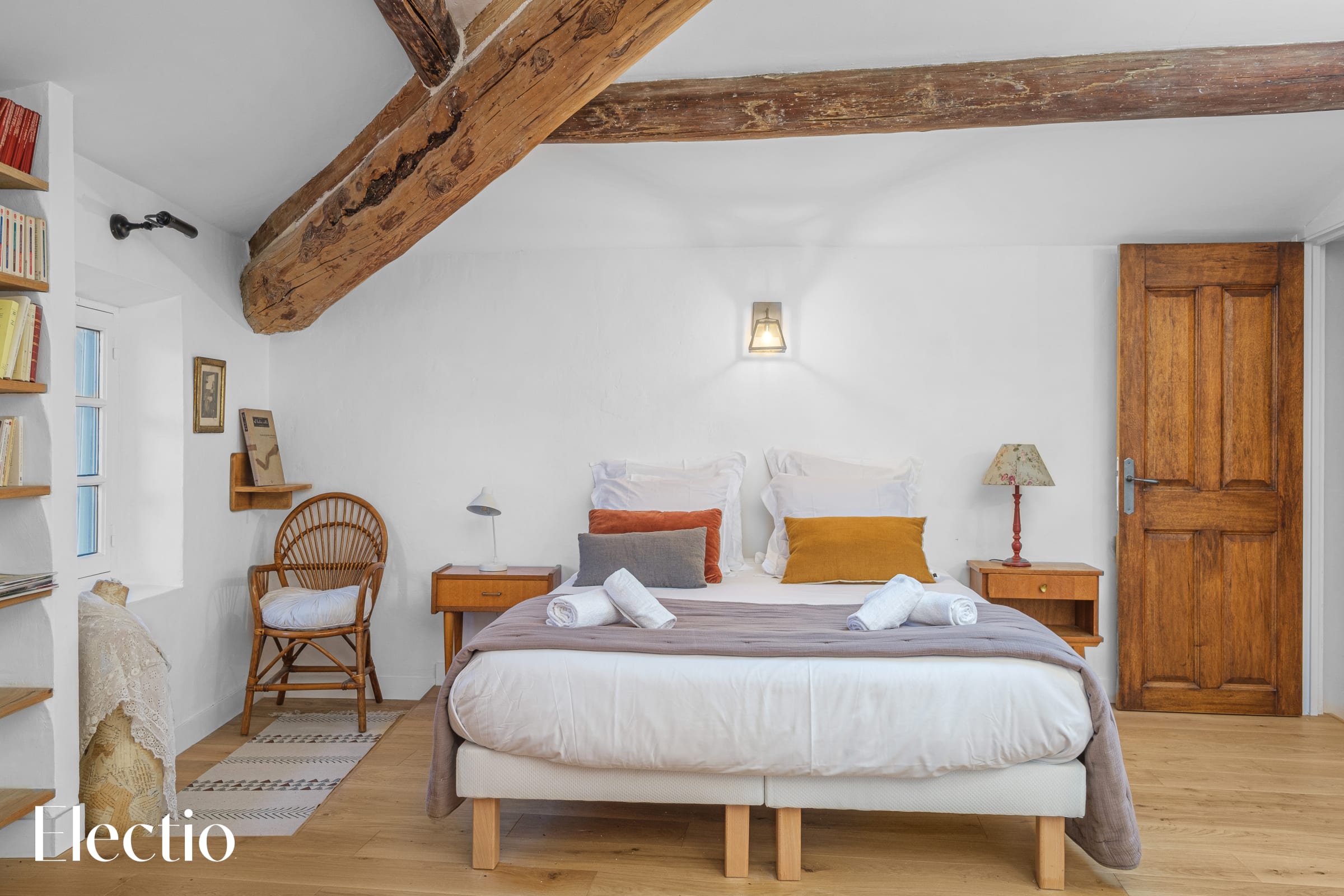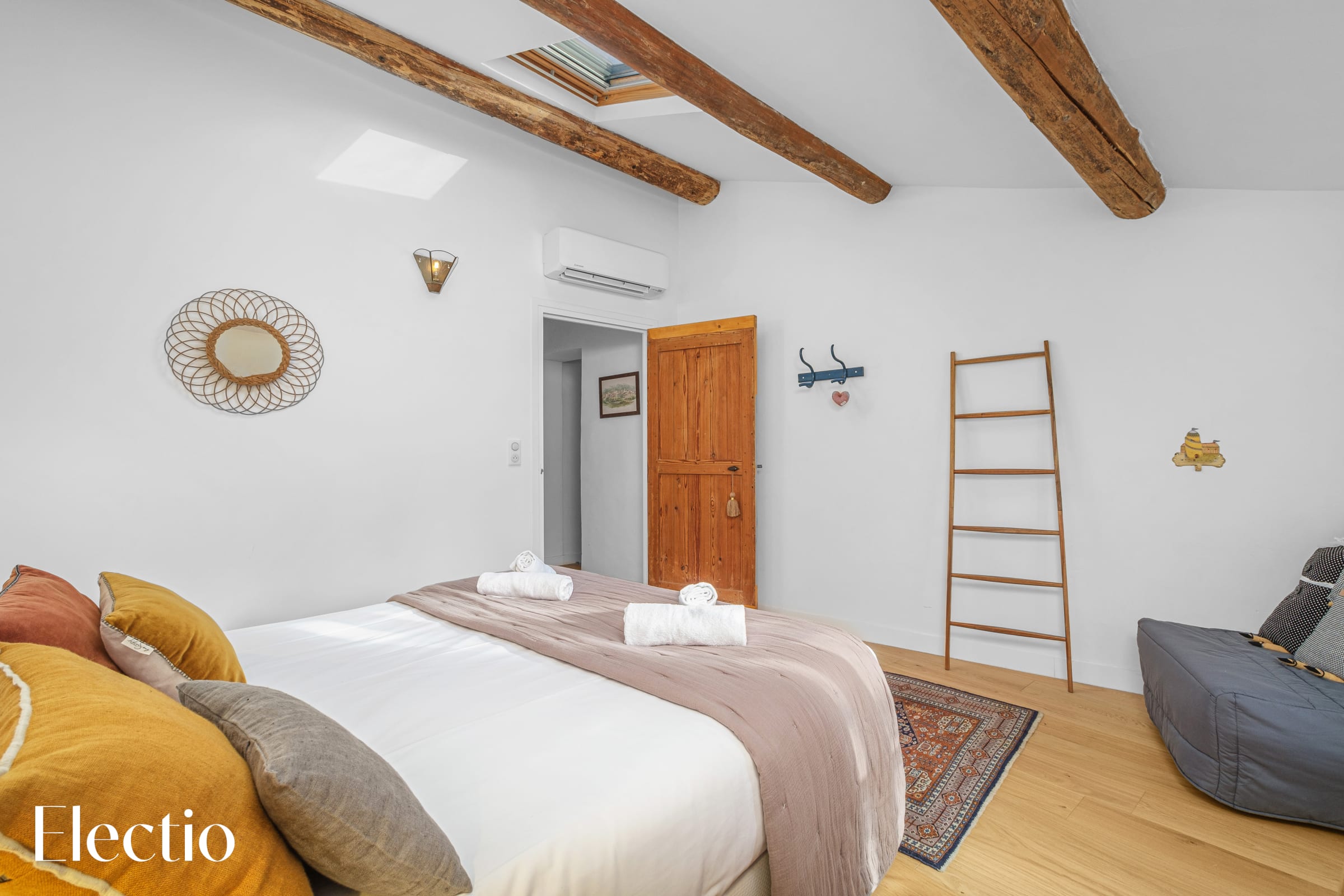 The beautifully preserved exposed beams give the room all its charm. A window near the bed, offering a glimpse of Saint Barthélemy Church, combined with a skylight, fills the room with natural light throughout the day, creating a soft, bright, and peaceful atmosphere.