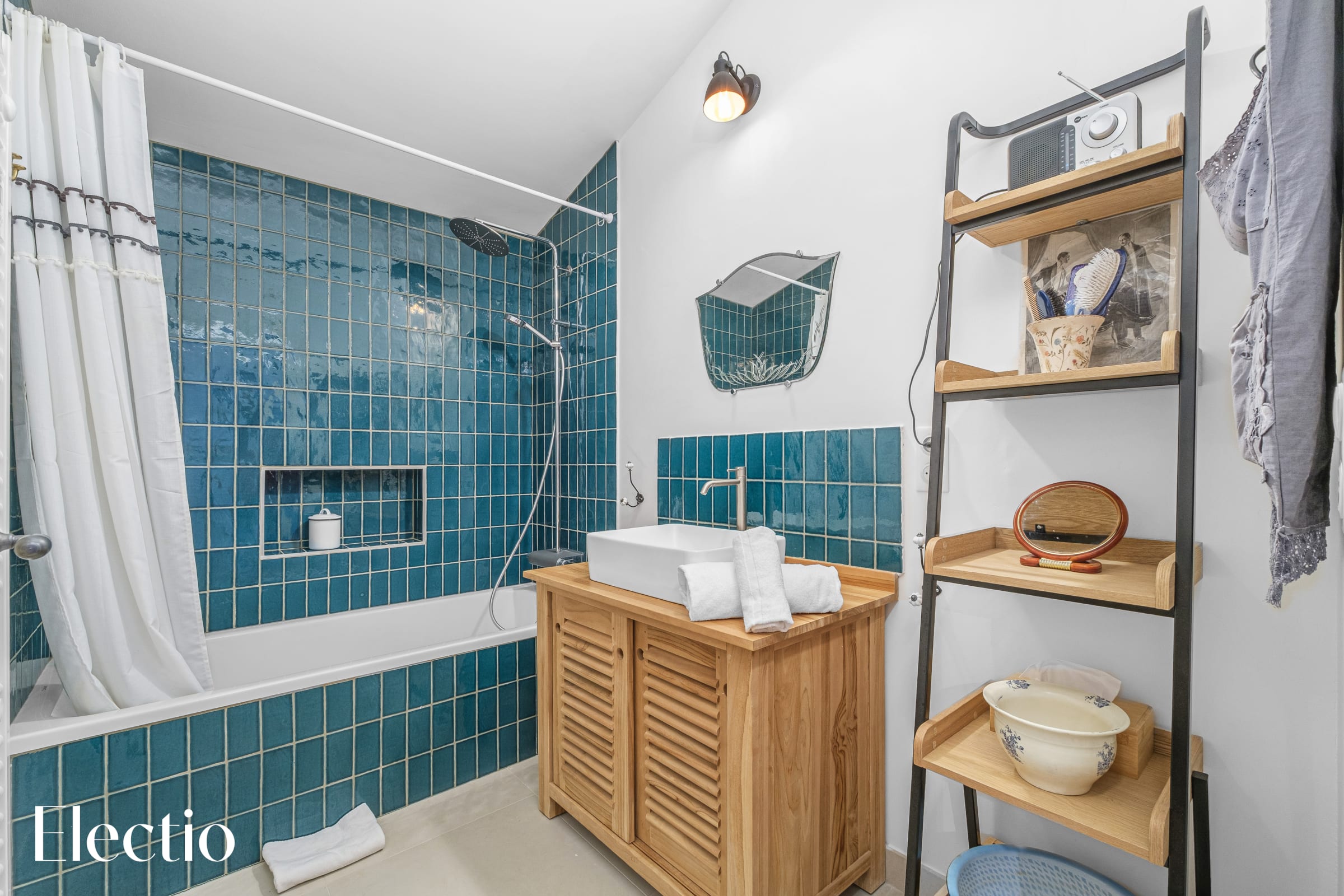 Deep blue tiles adorn the walls, giving the room a unique and refined character. Open shelving and carefully selected decorative elements complete the space, creating a bathroom that is both pleasant and perfectly suited for everyday comfort.