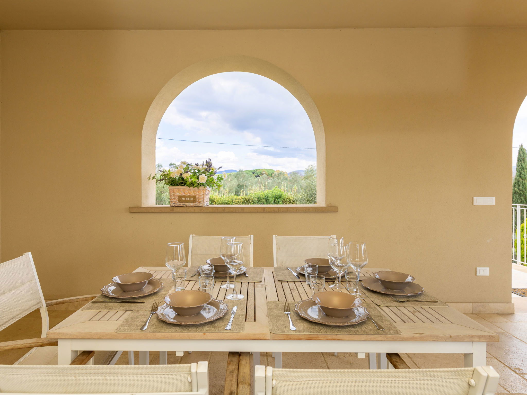 Comfortable house "Villa gli Olivi", 2 storeys. 4 km from the centre of Bibbona, 8 km from the centre of Cecina, in an elevated position, 5 km from the sea, 5 km from the beach. Private: property 4'700 m2 (fenced), well-kept garden, lawn for sunbathing, swimming pool (12 x 6 m, depth 80 - 140 cm, seasonal availability: 01.May. - 31.Oct.). Paddling pool, outdoor shower, pergola, barbecue. Linen change (suppl. charge extra). Towel change (suppl. charge extra). Motor access (1.5 km via unmade road). Roofed, parking. Shop 3.5 km, grocery 3.5 km, supermarket 4 km, restaurant 100 m, bus stop 1.5 km, railway station 9 km, thermal baths "Calidario" 30 km. Golf course (9 hole) 900 m. Nearby attractions: Bolgerhi 6.5 km, Pisa 70 km, Lucca 90 km, Firenze 120 km. Please note: car recommended.
