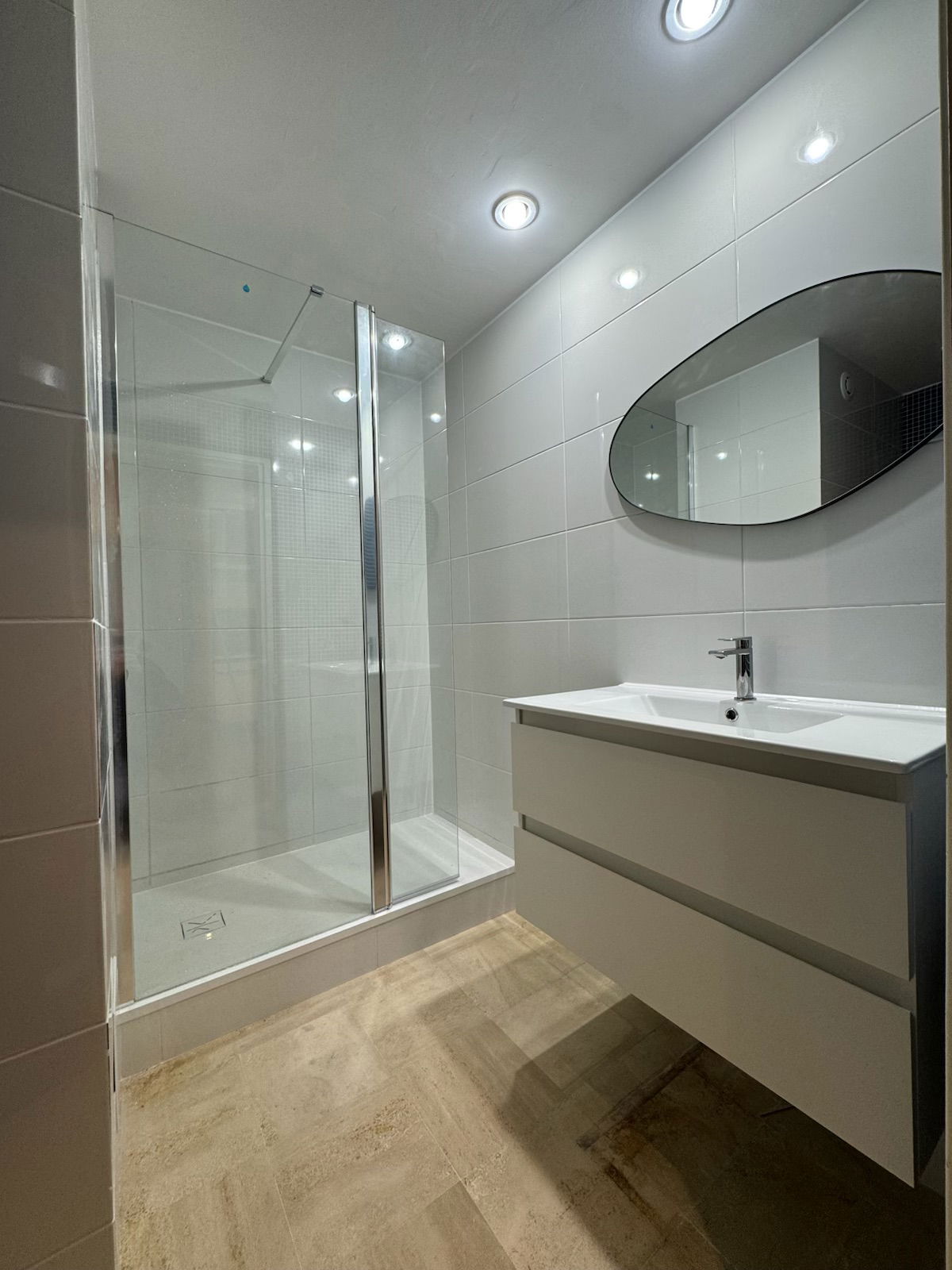 🚿 Modern bathroom with large shower, vanity unit and towel warmer