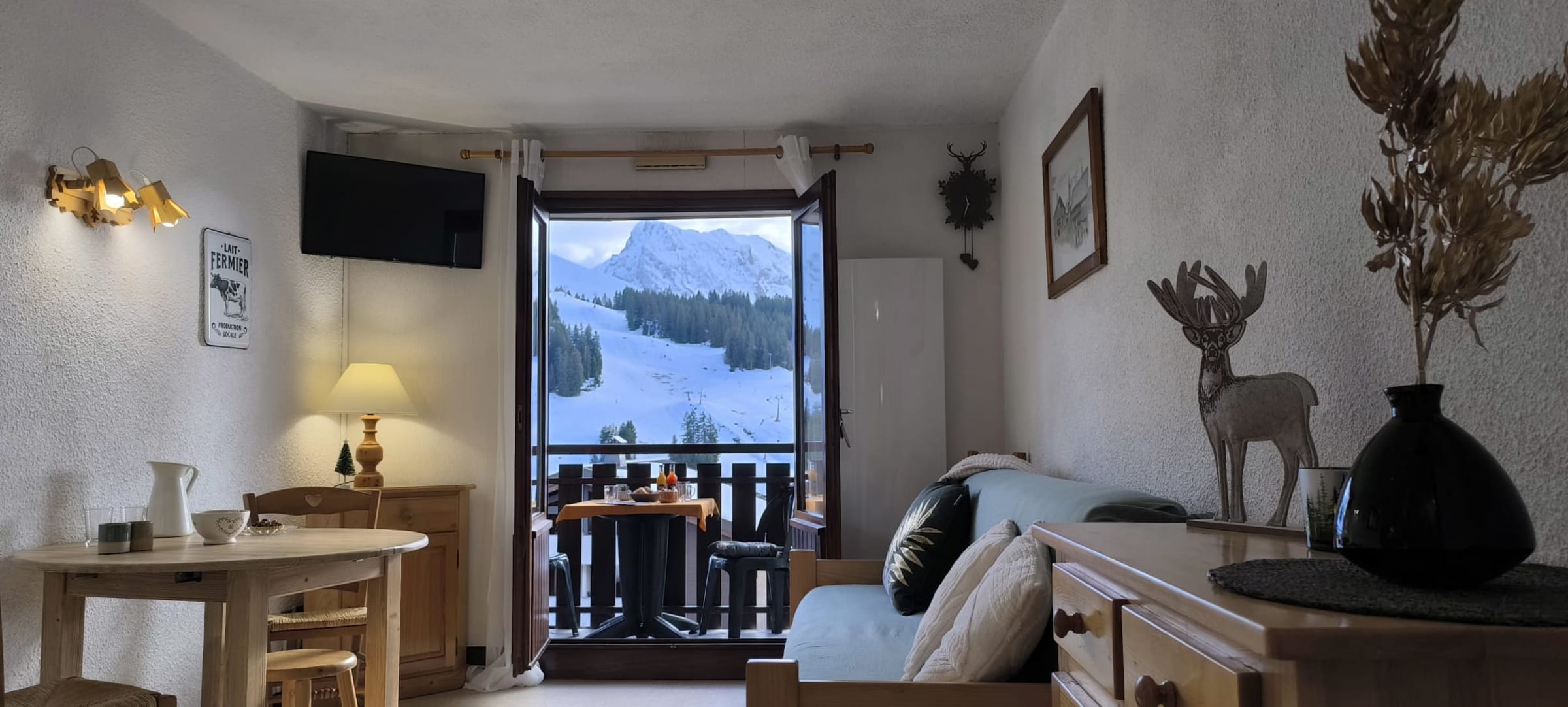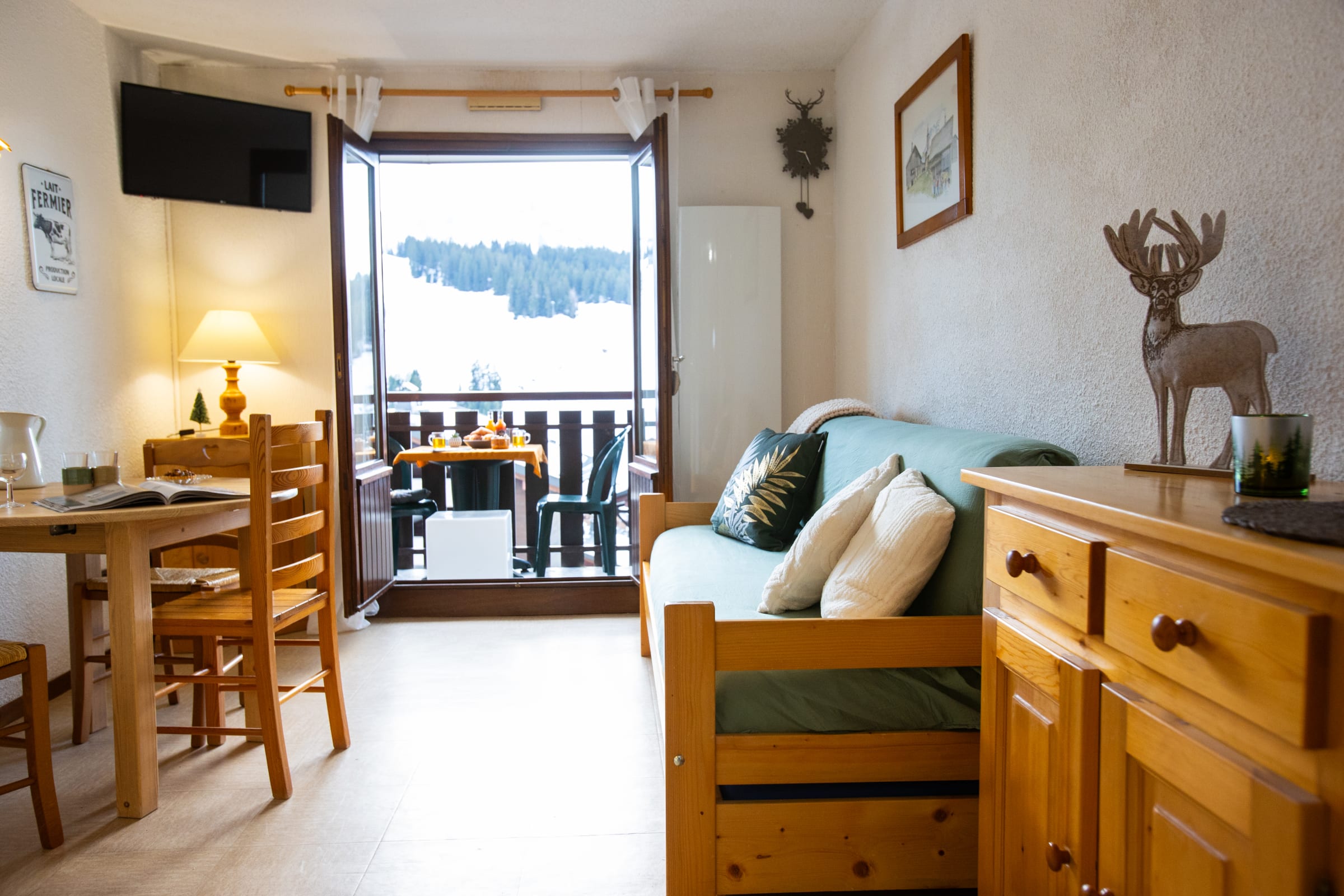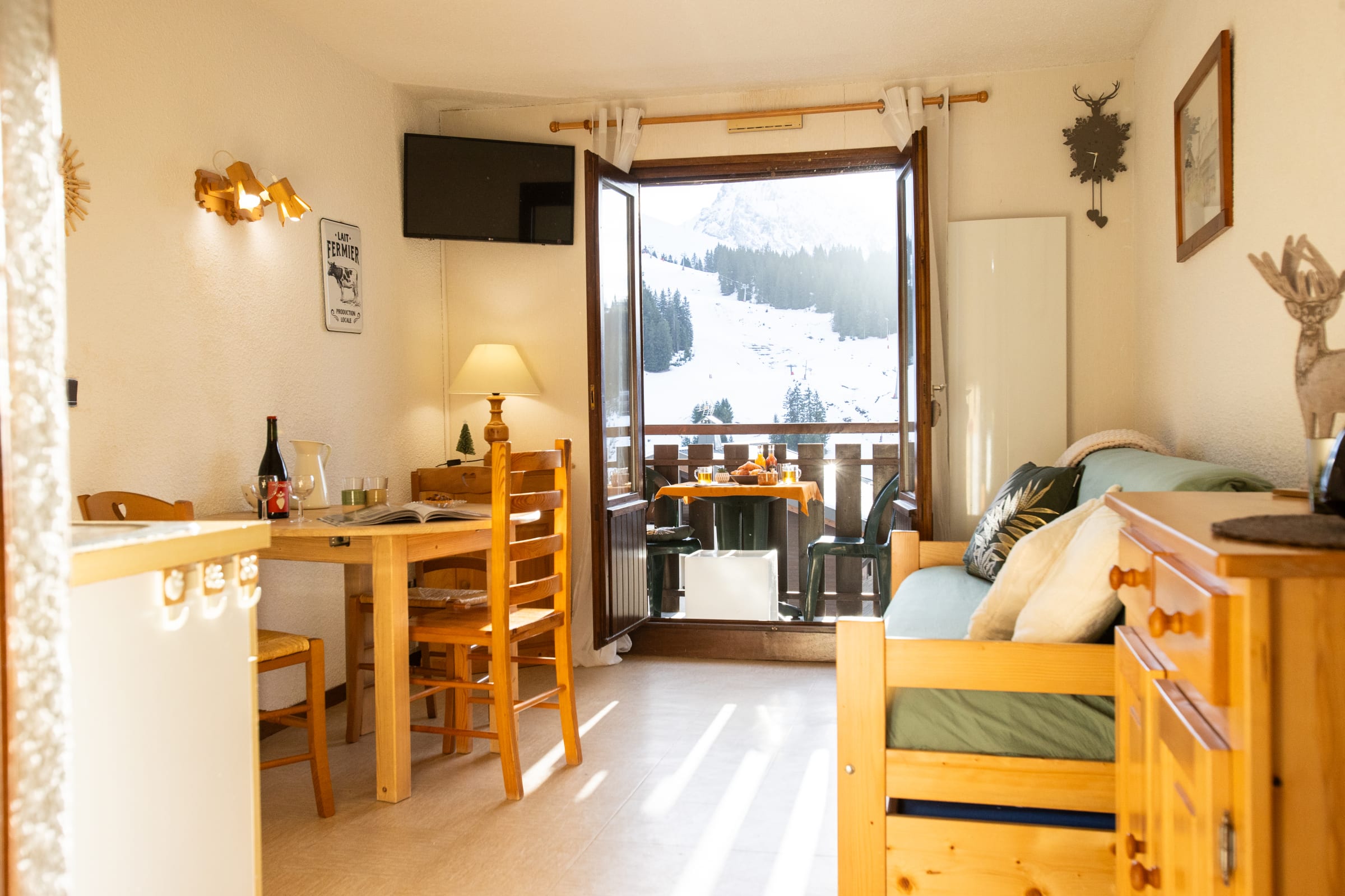 The apartment accommodates 4-5 persons : goup or a family with 2–3 children. It features a bright living area with a double sofa bed, a little bedroom "sleeping area in the entrance" with three single beds ( 1 bunkbed) , an open kitchenette, a bathroom with shower and separate toilets and a sunny balcony offering open views over the resort, the surrounding mountains, and—on clear days—Mont Blanc.