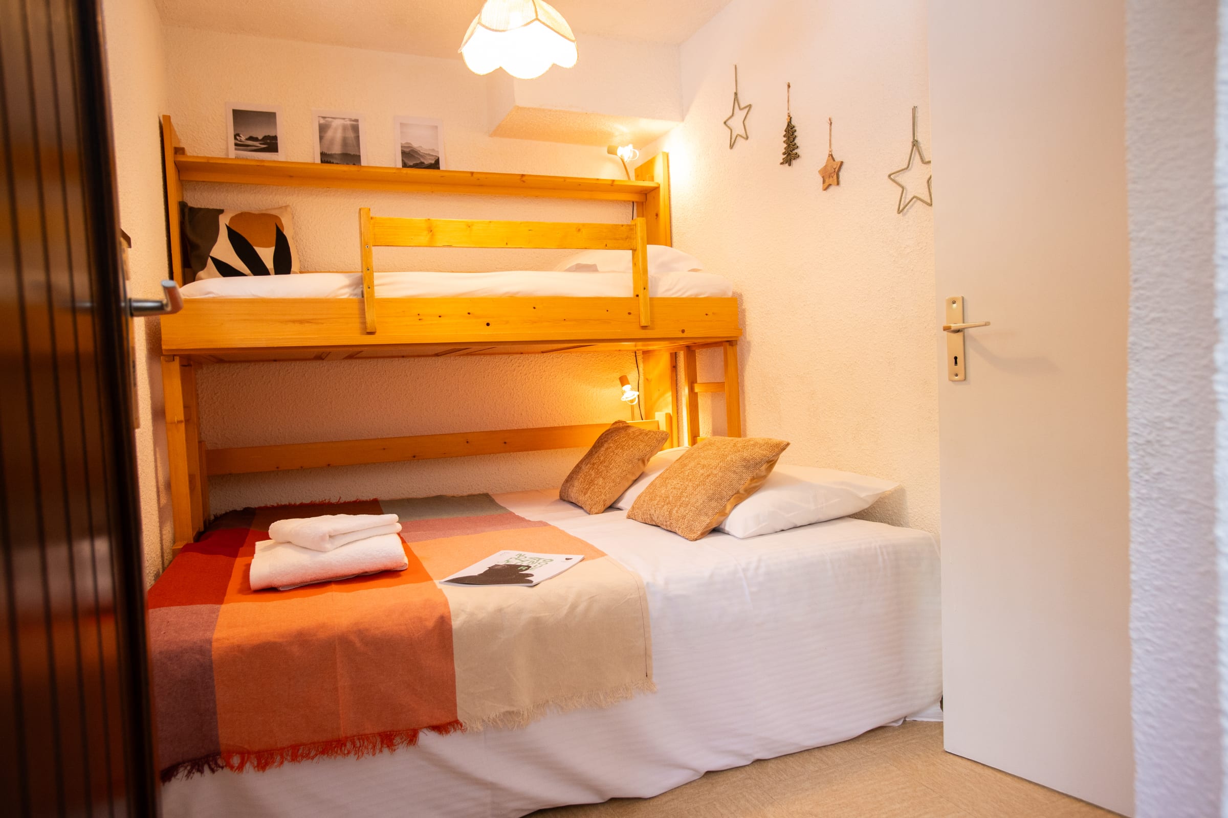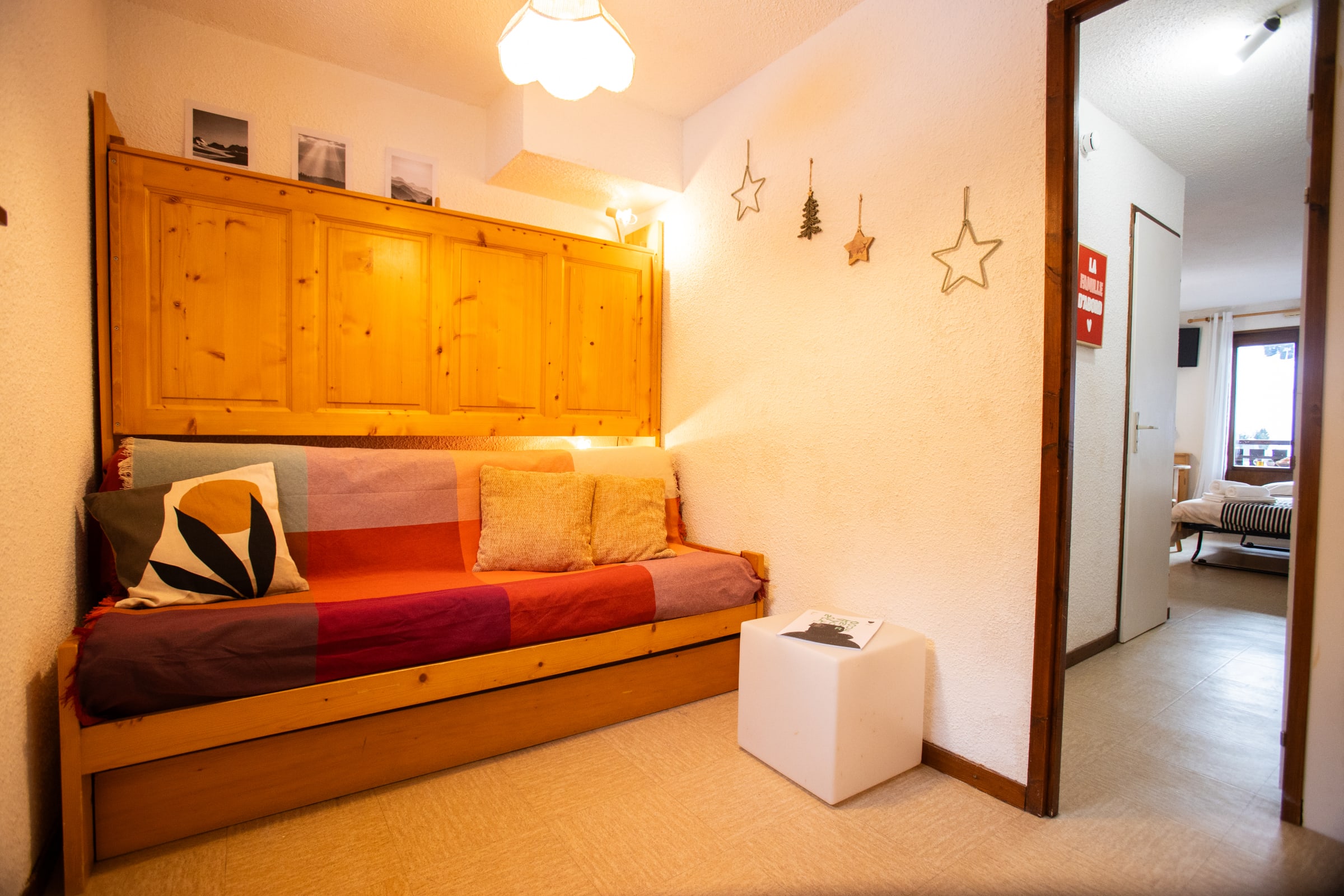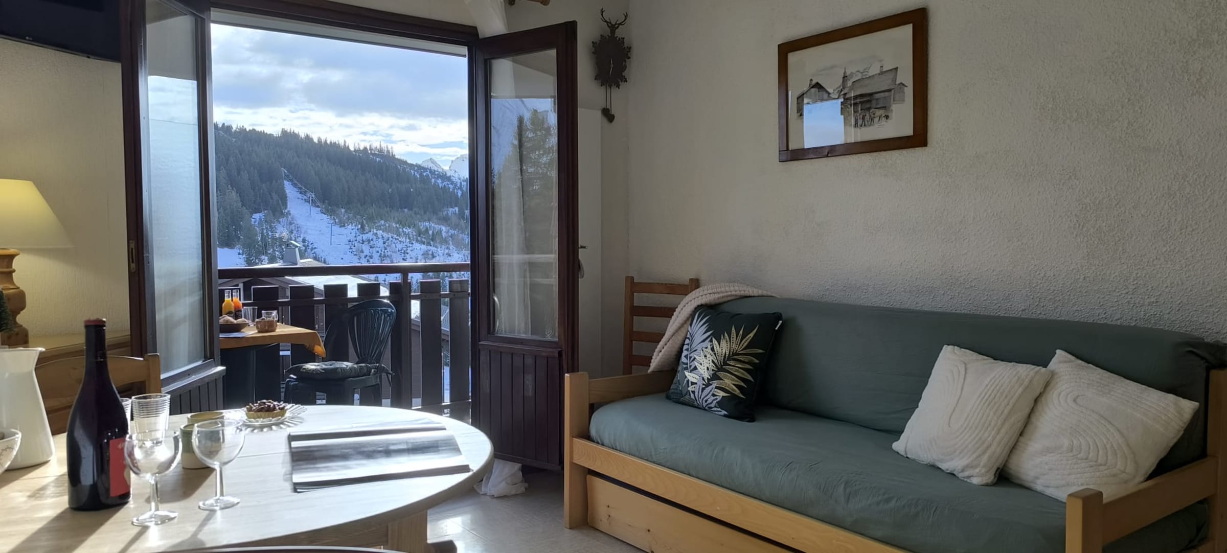 The apartment accommodates 4-5 persons : goup or a family with 2–3 children. It features a bright living area with a double sofa bed, a little bedroom "sleeping area in the entrance" with three single beds ( 1 bunkbed) , an open kitchenette, a bathroom with shower and separate toilets and a sunny balcony offering open views over the resort, the surrounding mountains, and—on clear days—Mont Blanc.