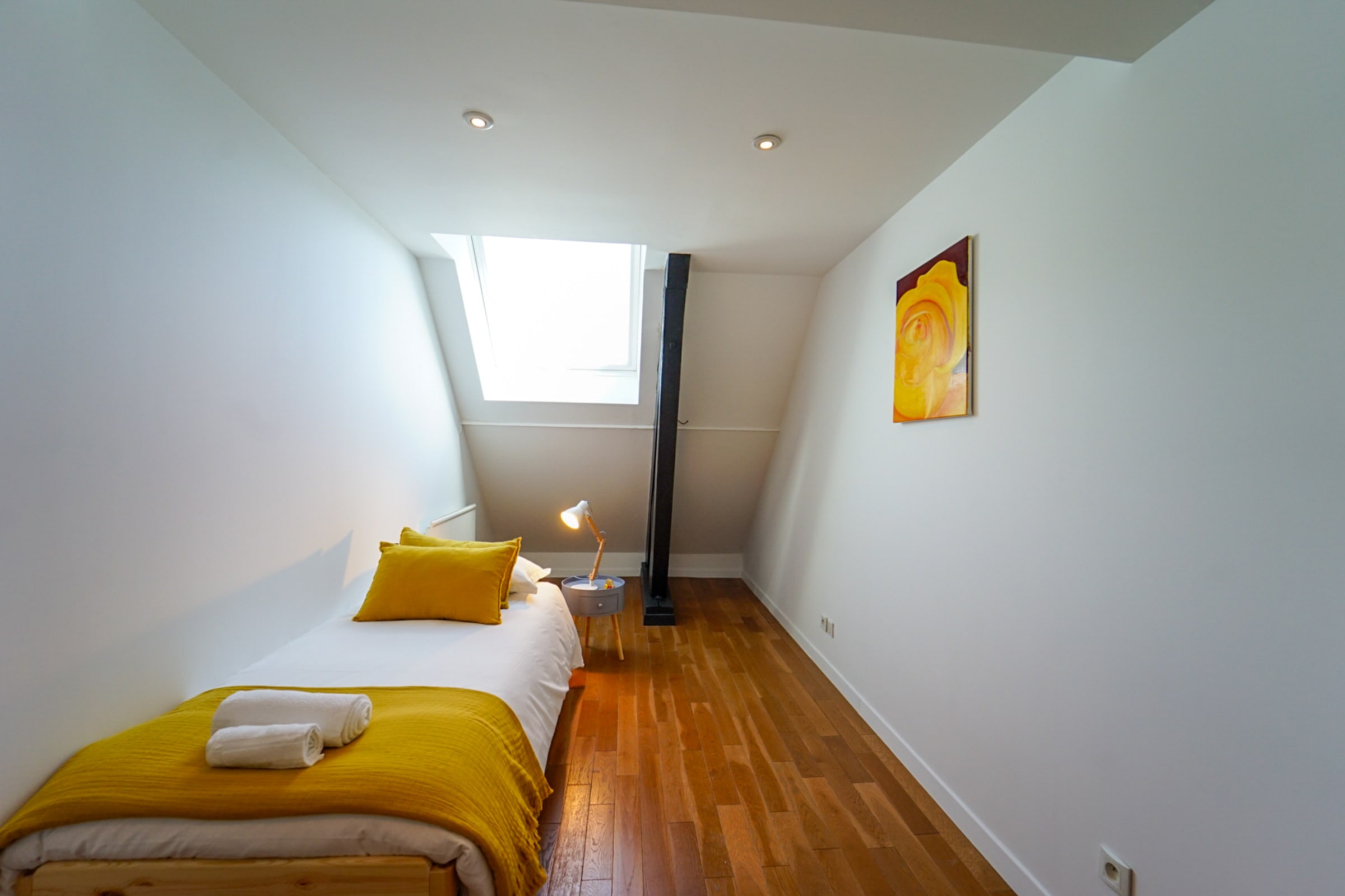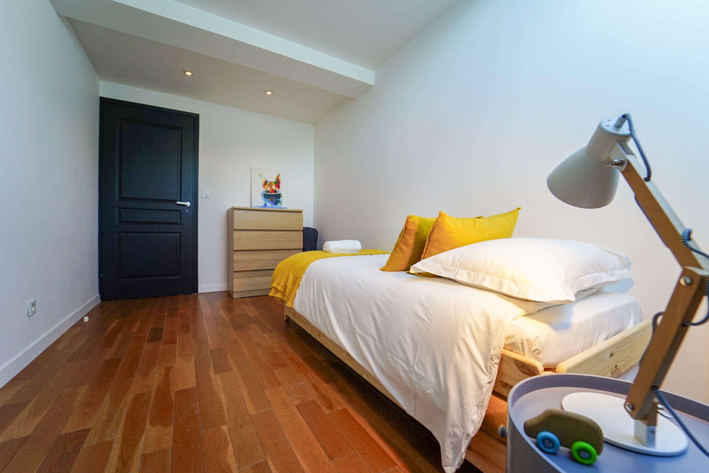 Deux chambres sont équipées d’un lit double 160x200cm, la troisième possède un lit simple 80x190cm. Toutes les chambres sont équipées de rangements pour vos effets personnels.