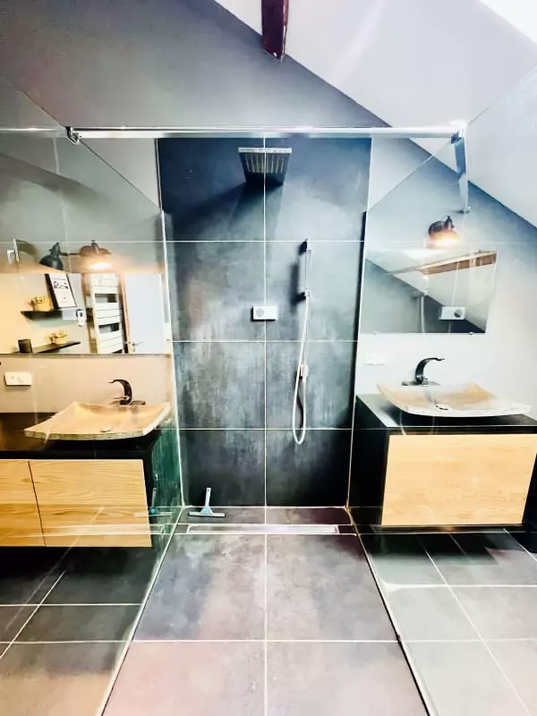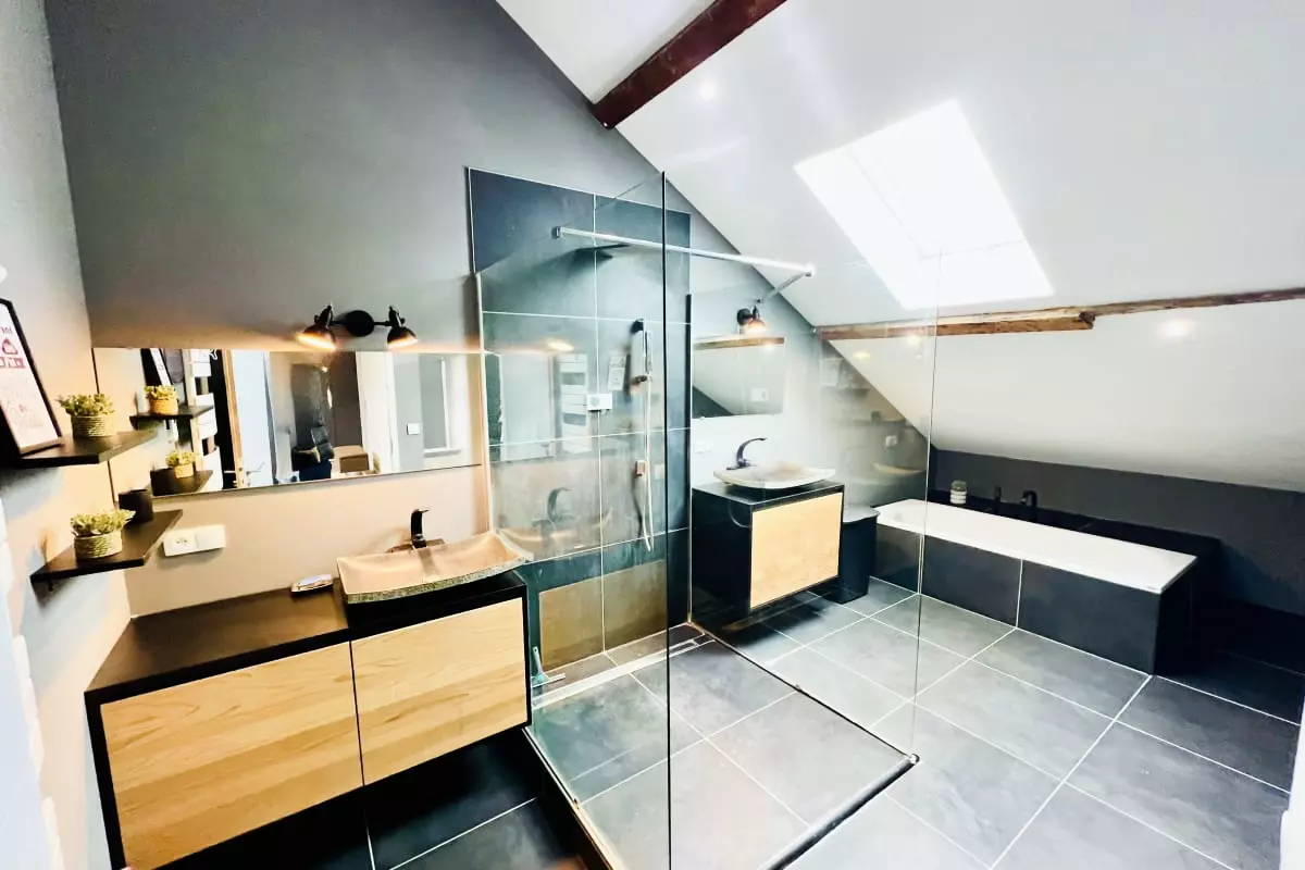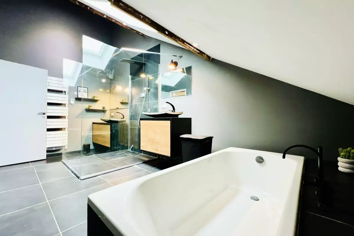 - Bathroom with hairdryer, two sinks, spacious shower and bathtub