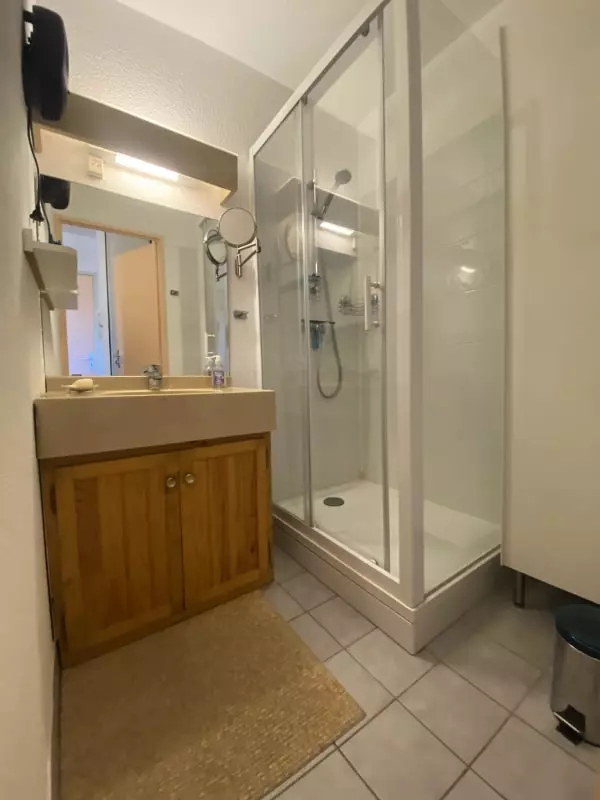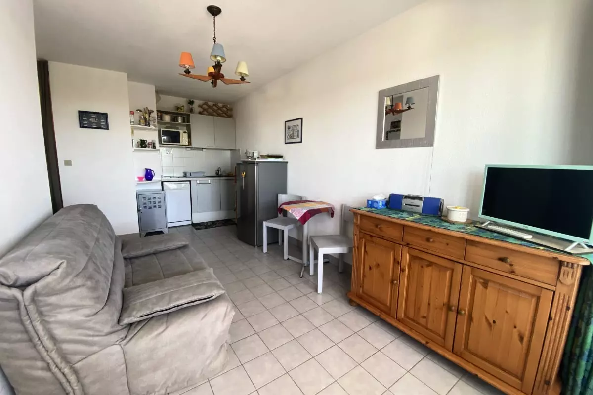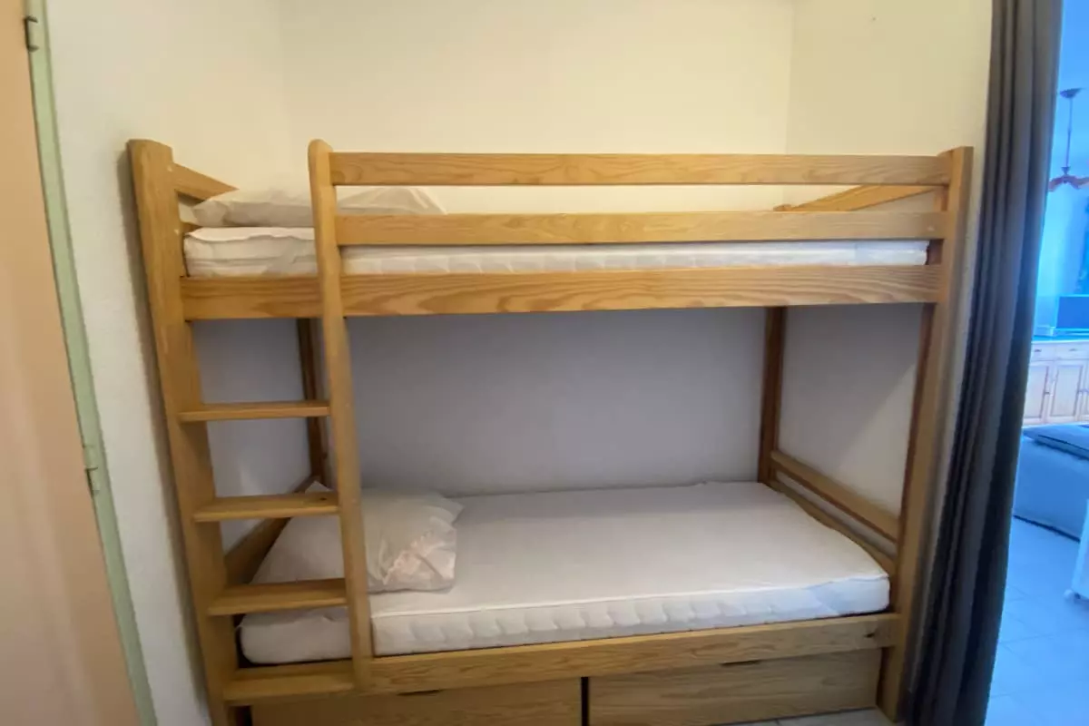 This apartment consists of a cabin area with bunk beds, a shower room, separate WC, a fitted kitchen, living room opening onto a loggia, a bedroom with a wardrobe.