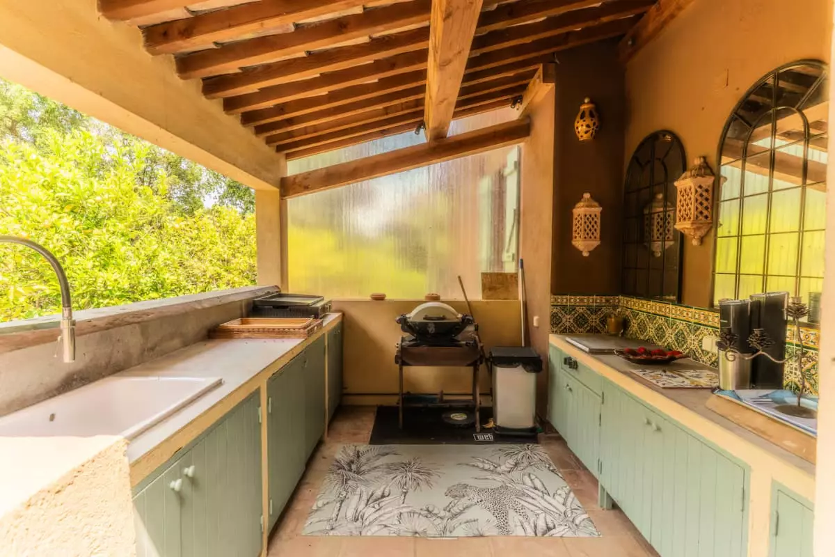 An outdoor kitchen is also available.