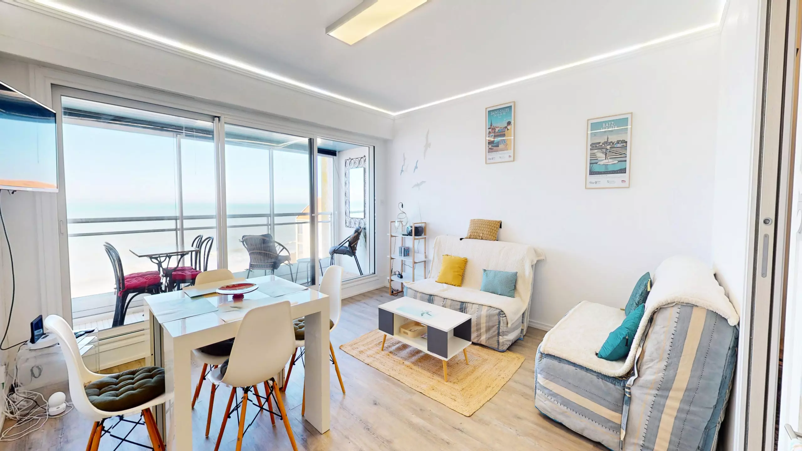 The living room is the true heart of the apartment. The moment you step inside, your gaze is drawn to the magnificent panoramic sea view. This harmonious space includes: