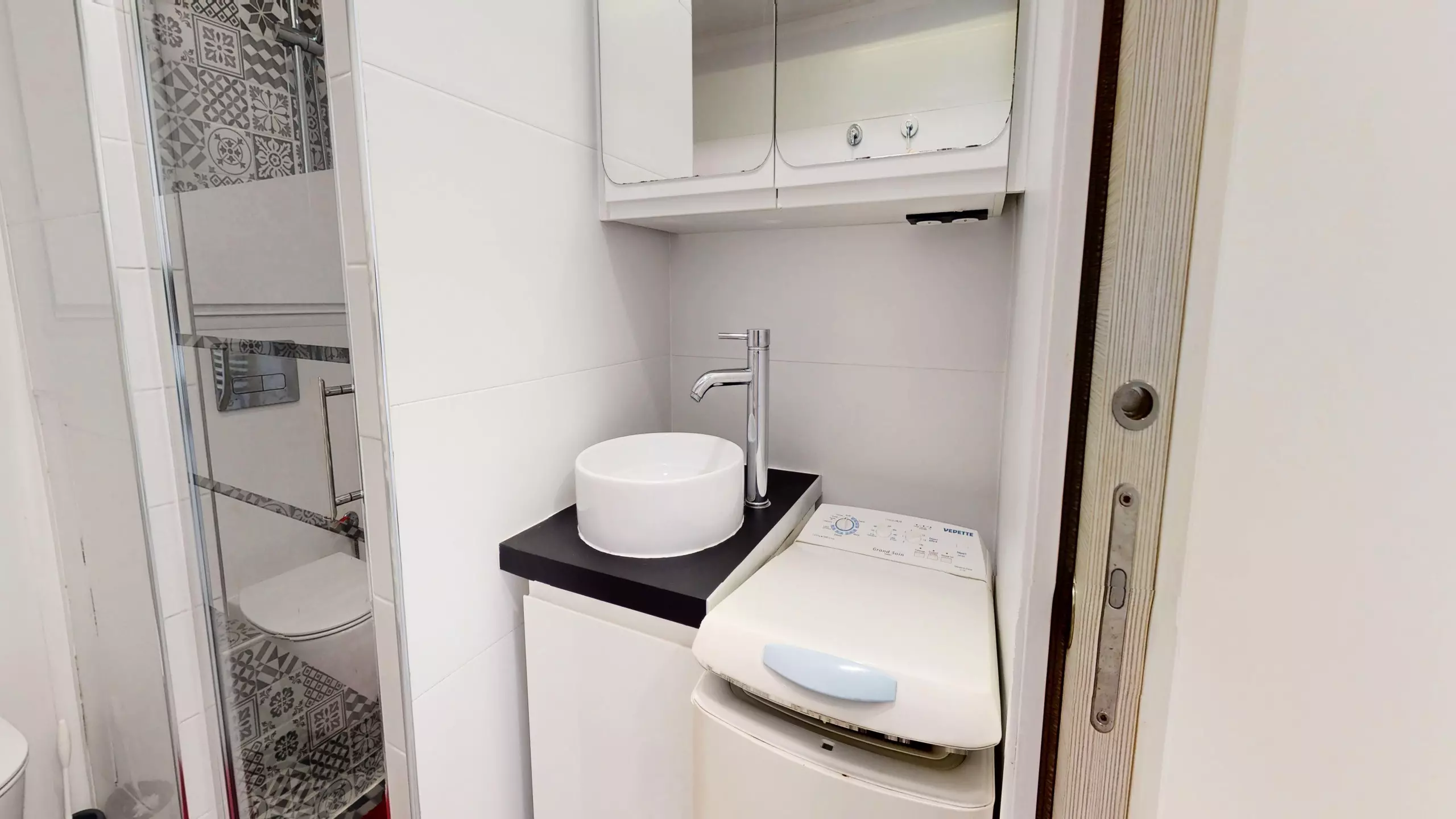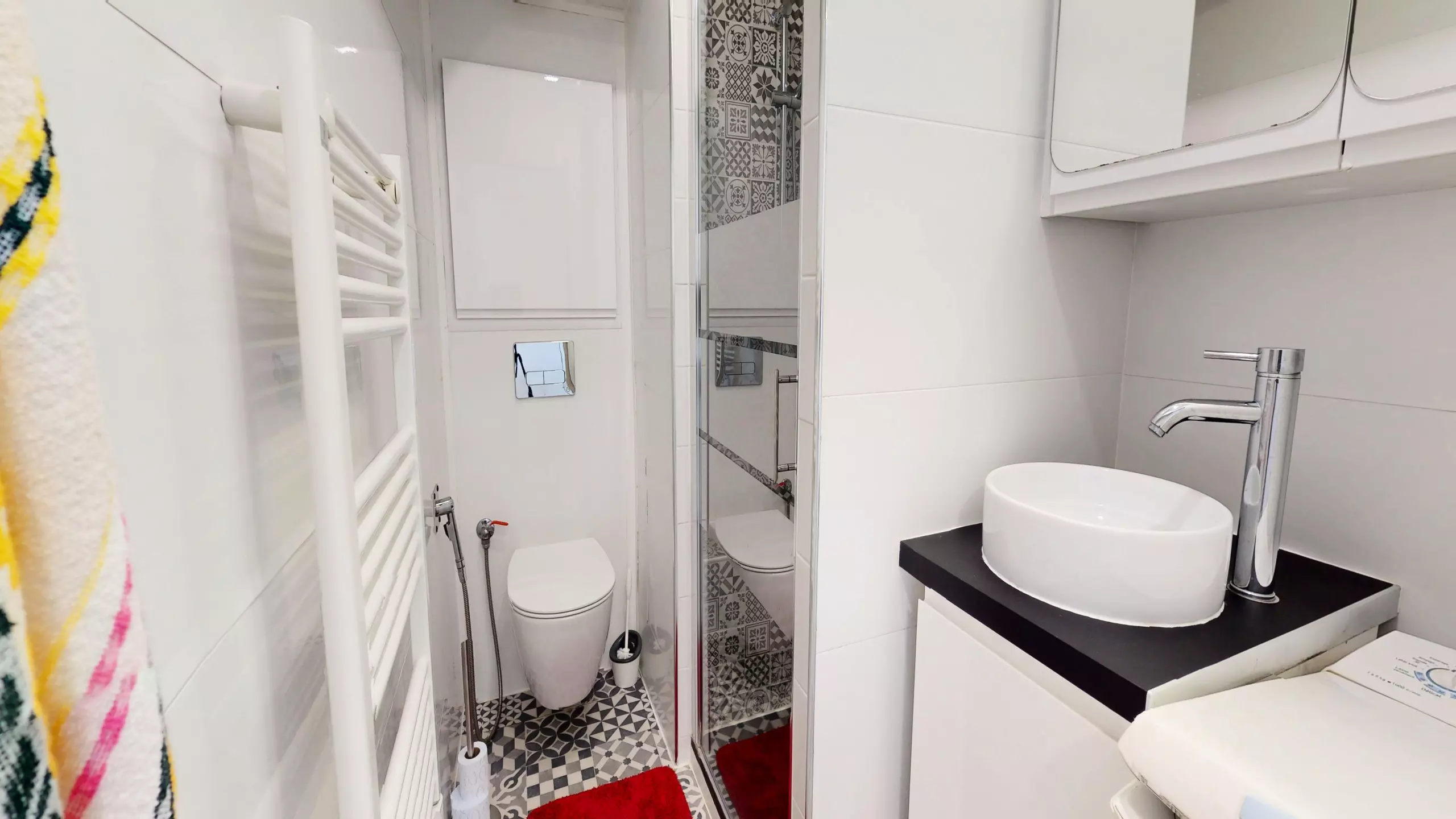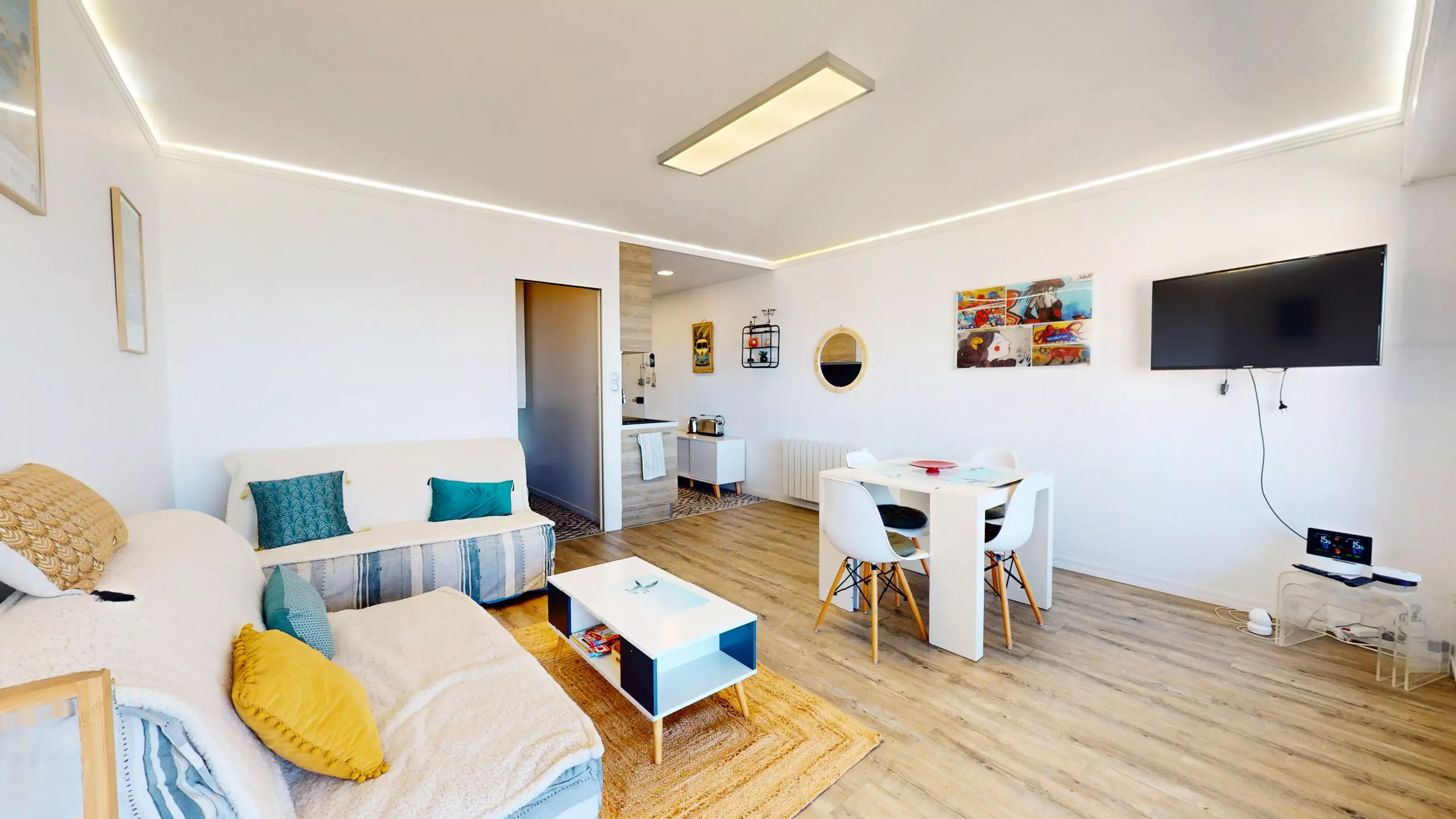From the moment you step inside, comfort is paramount: a contemporary bathroom with shower and toilet is located to your right. You'll then discover a beautiful open-plan kitchen, modernly designed and fully equipped with everything you need, including induction hobs for effortless meal preparation.