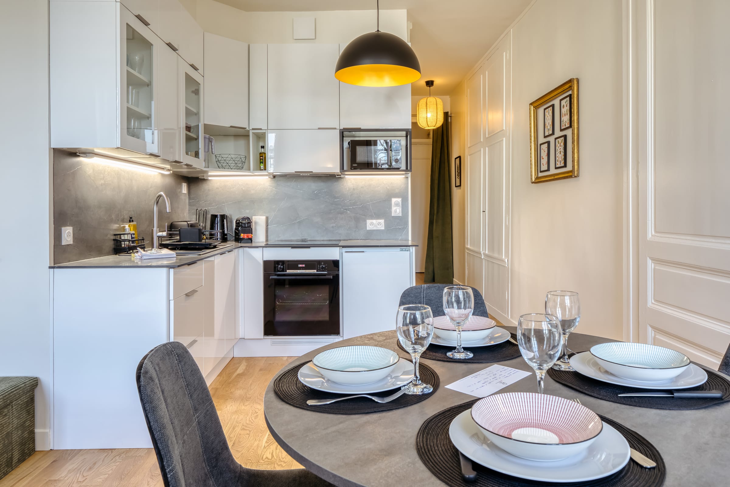 Facing south-west, the flat offers a beautiful living room with a sofa, coffee table and television, opening onto a fully equipped kitchen. You will find everything you need for a practical and comfortable stay: oven, hob, fridge-freezer, washing machine, Nespresso coffee machine, kettle, toaster, as well as all the equipment you need to cook just like at home.