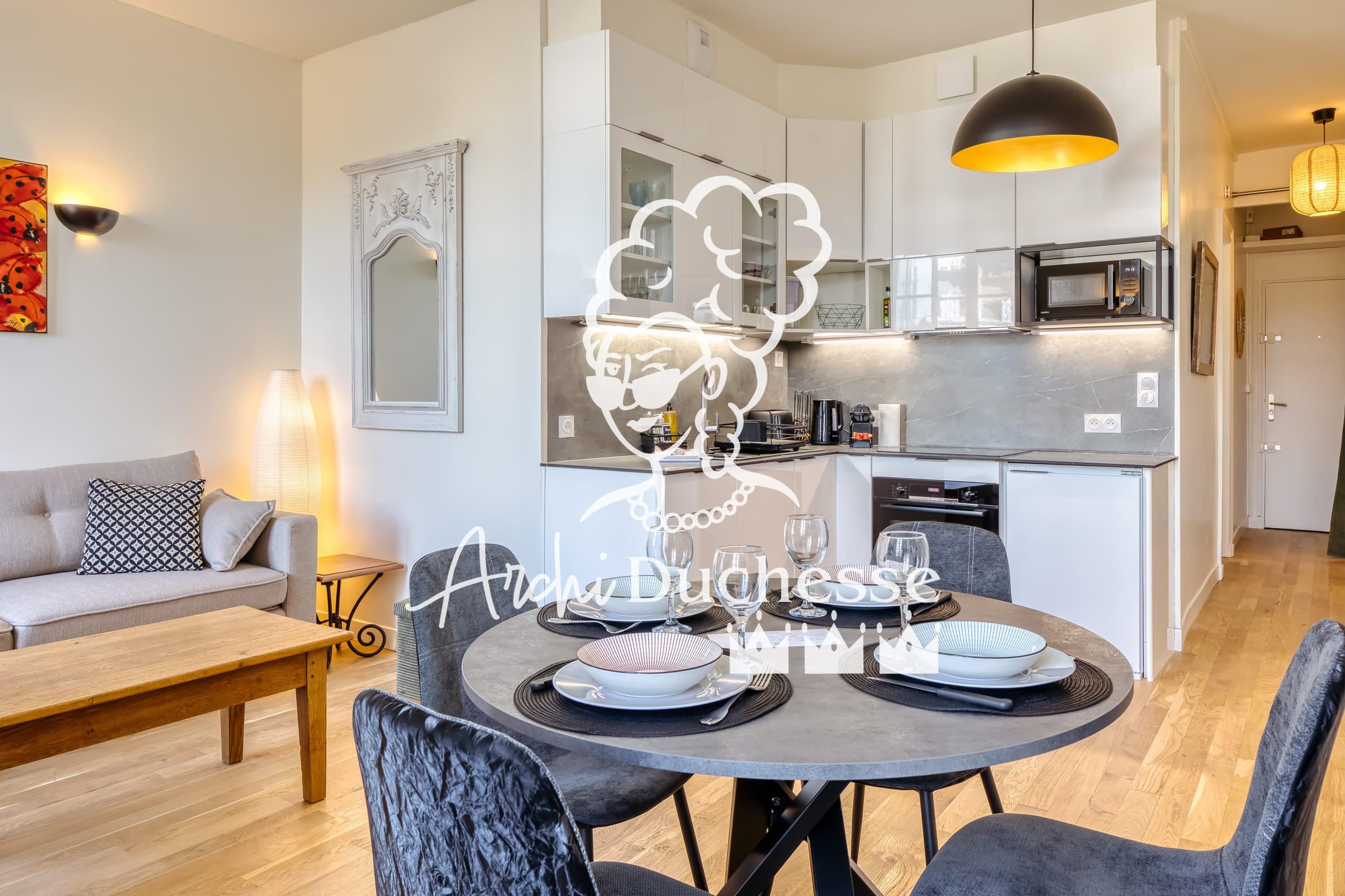 The accommodation is managed by the ArchiDuchesse concierge service, available 7 days a week (from 10:00 a.m. to 9:00 p.m.). All our guests receive household linen, essential items for the day (shampoo, shower gel, hand gel, toilet paper, etc.) and one large towel per person, along with tea towels and a bath mat per bathroom. A welcome kit with kitchen bin bags, bathroom bin bags, a sponge and washing-up liquid is provided free of charge on arrival for the duration of your stay.