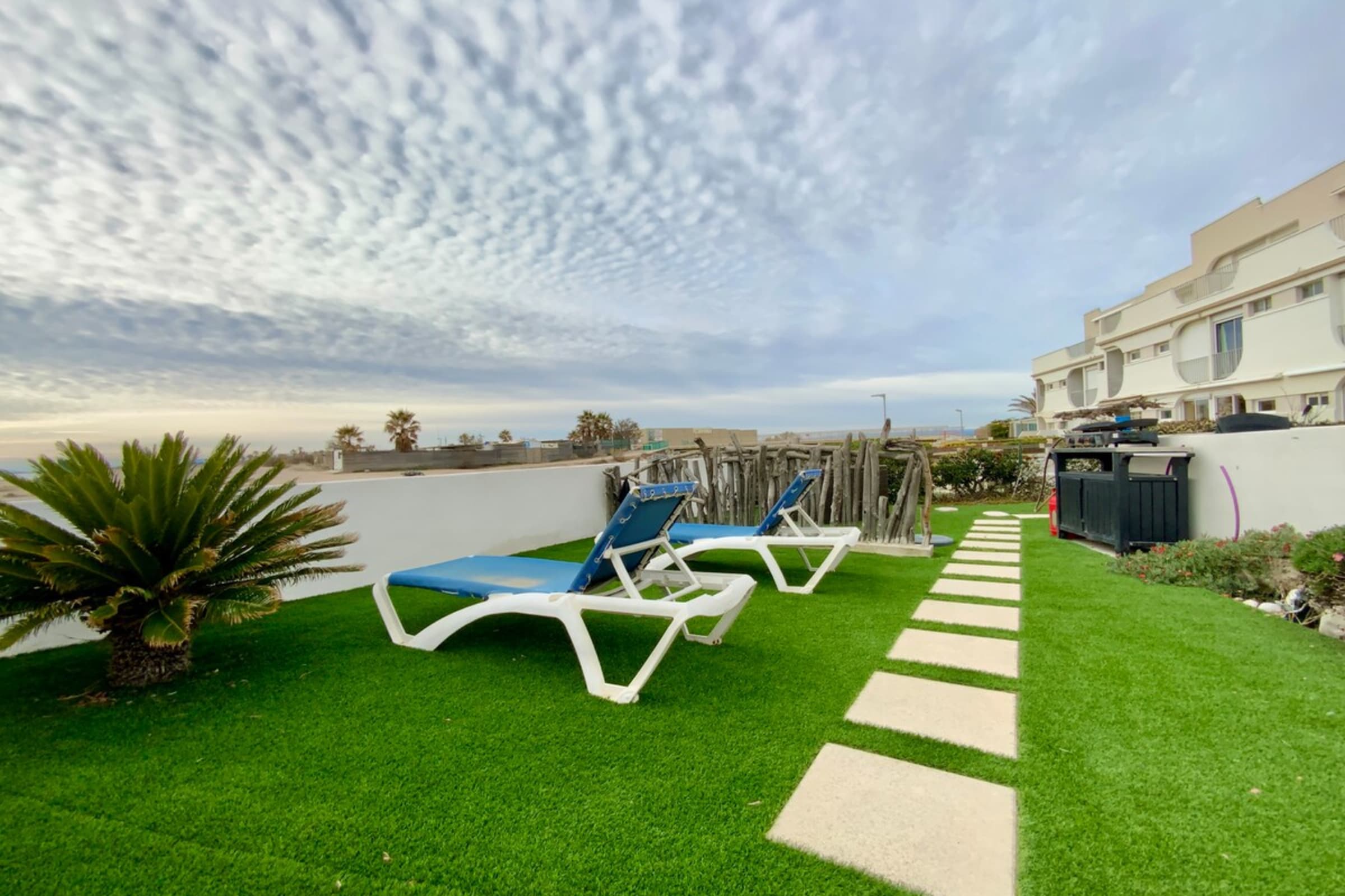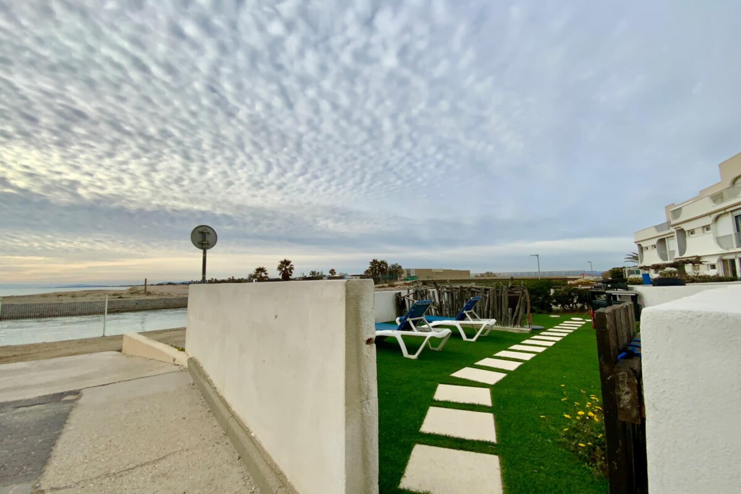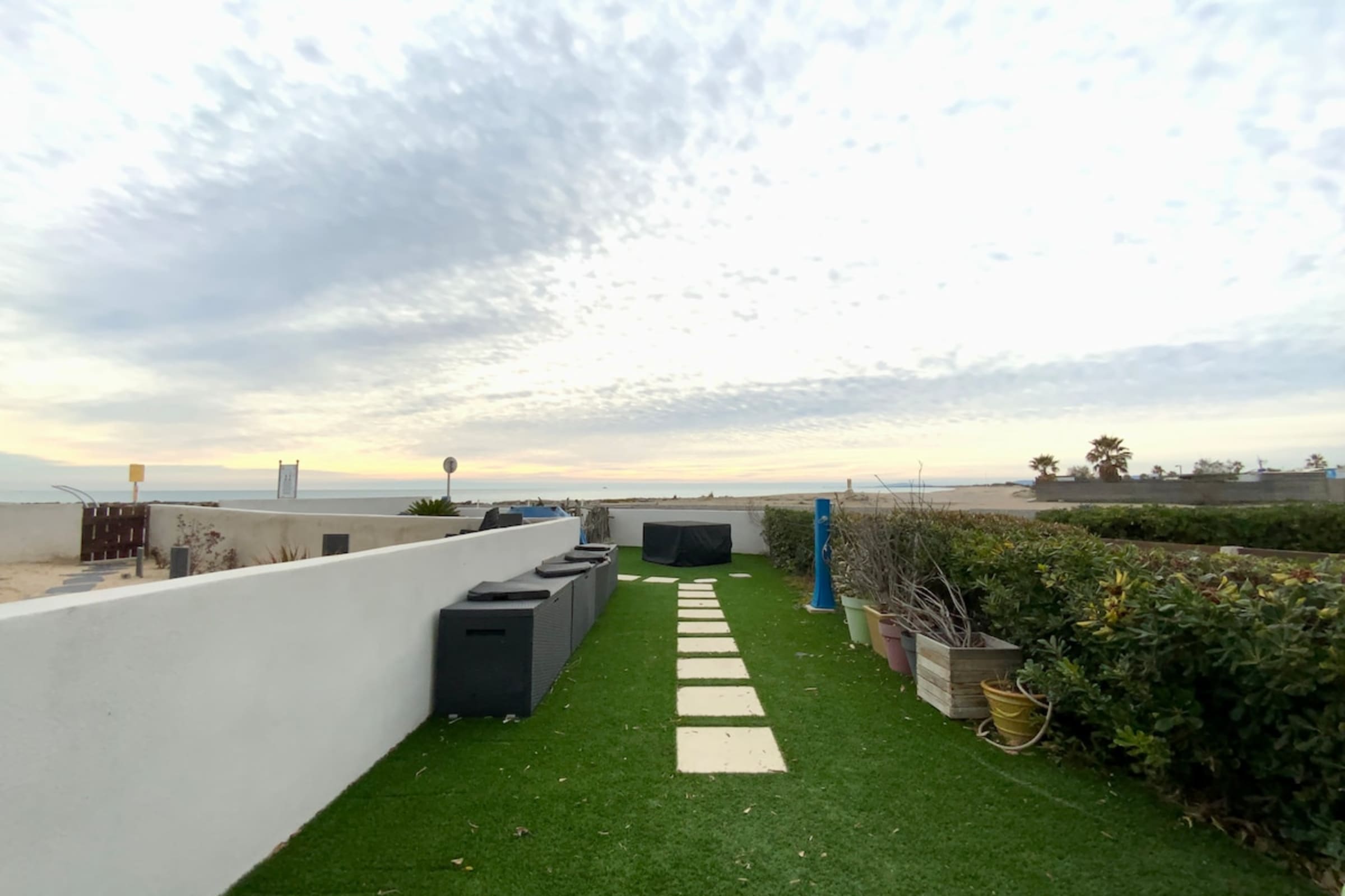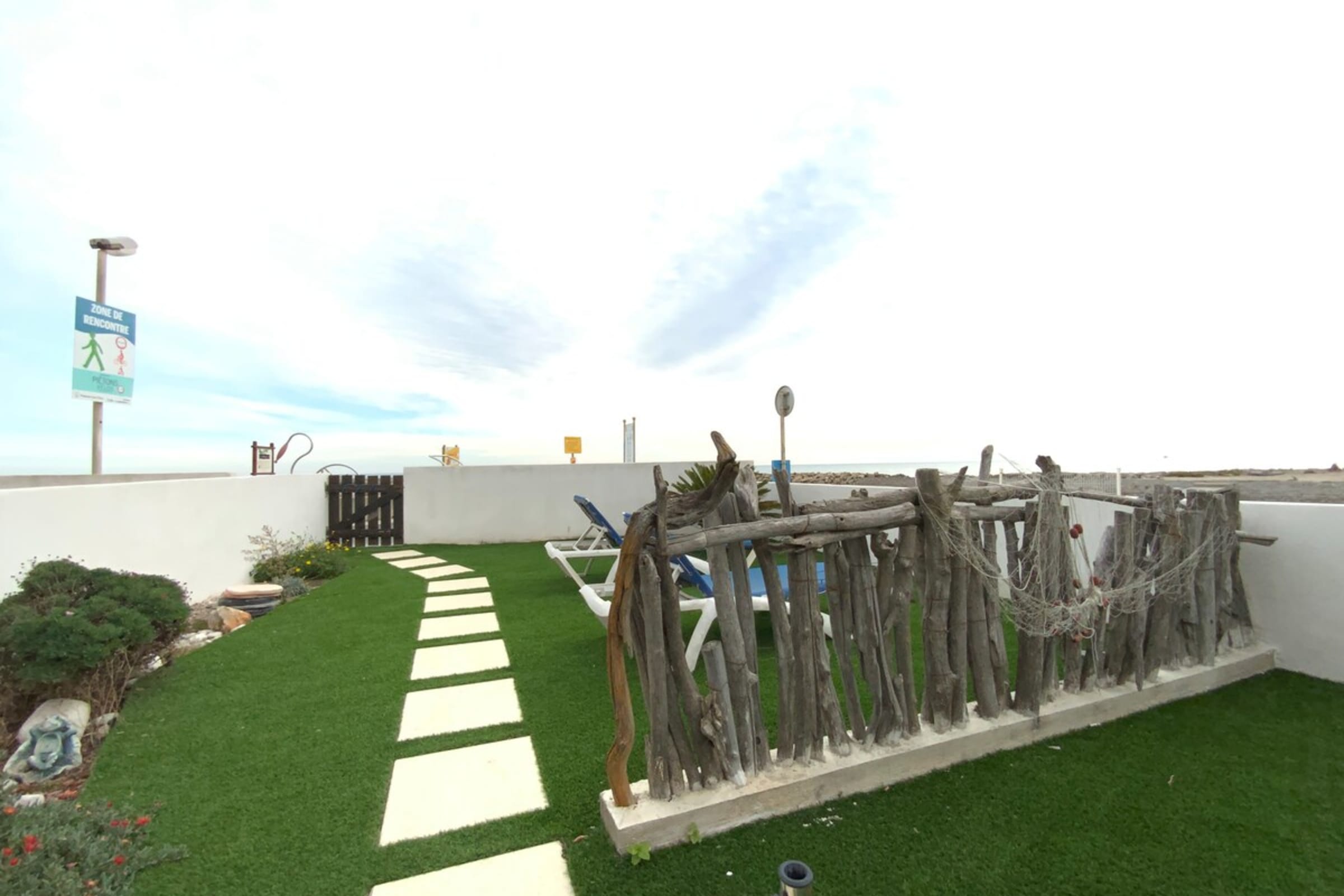 The exterior is an enclosed garden with plancha, electric awning, deckchairs, dining table, outdoor shower and direct and private access to the beach.