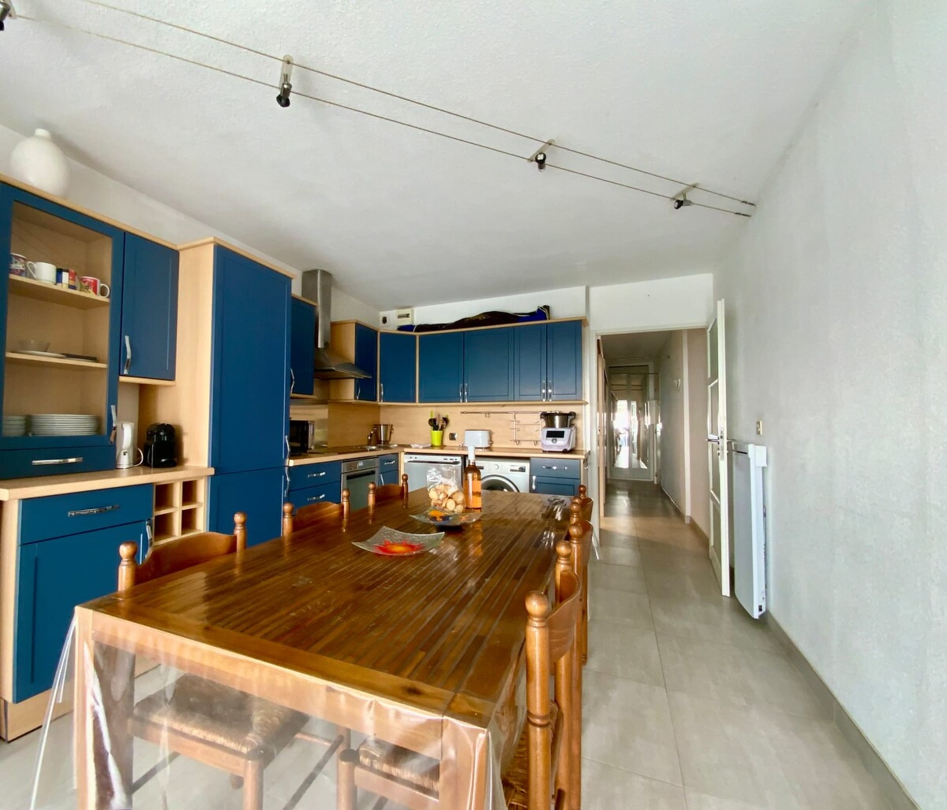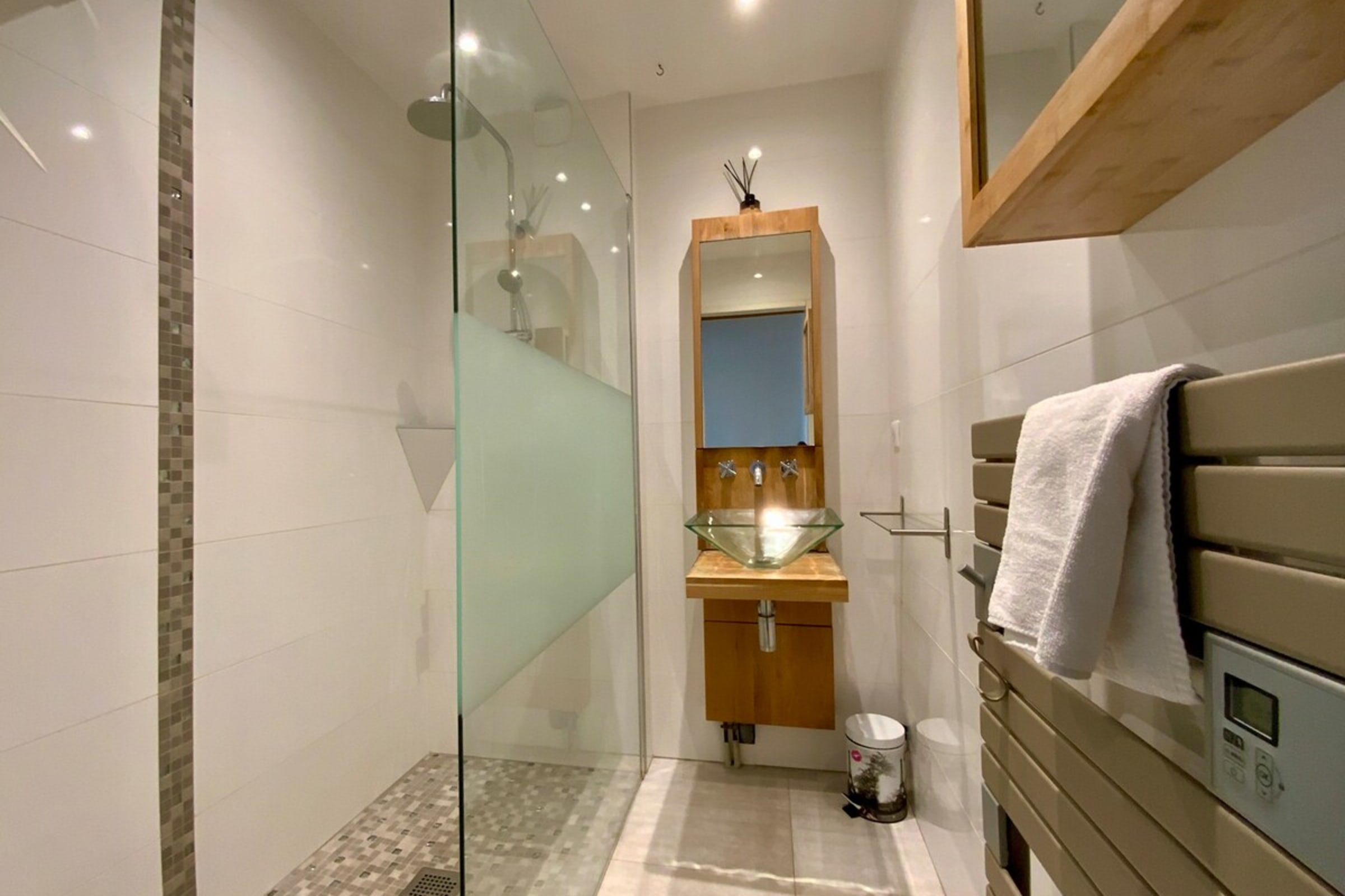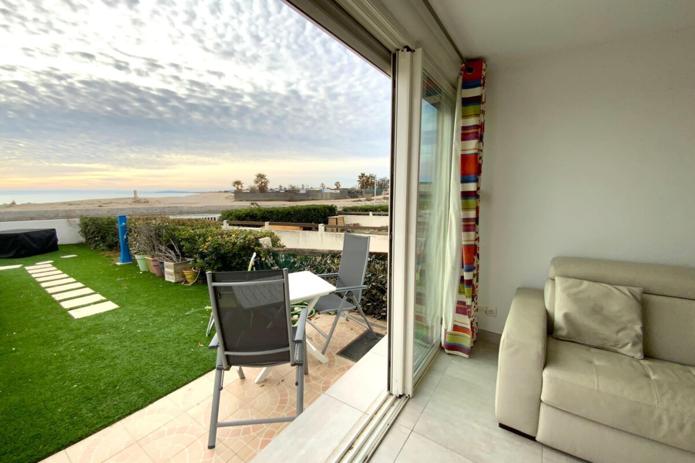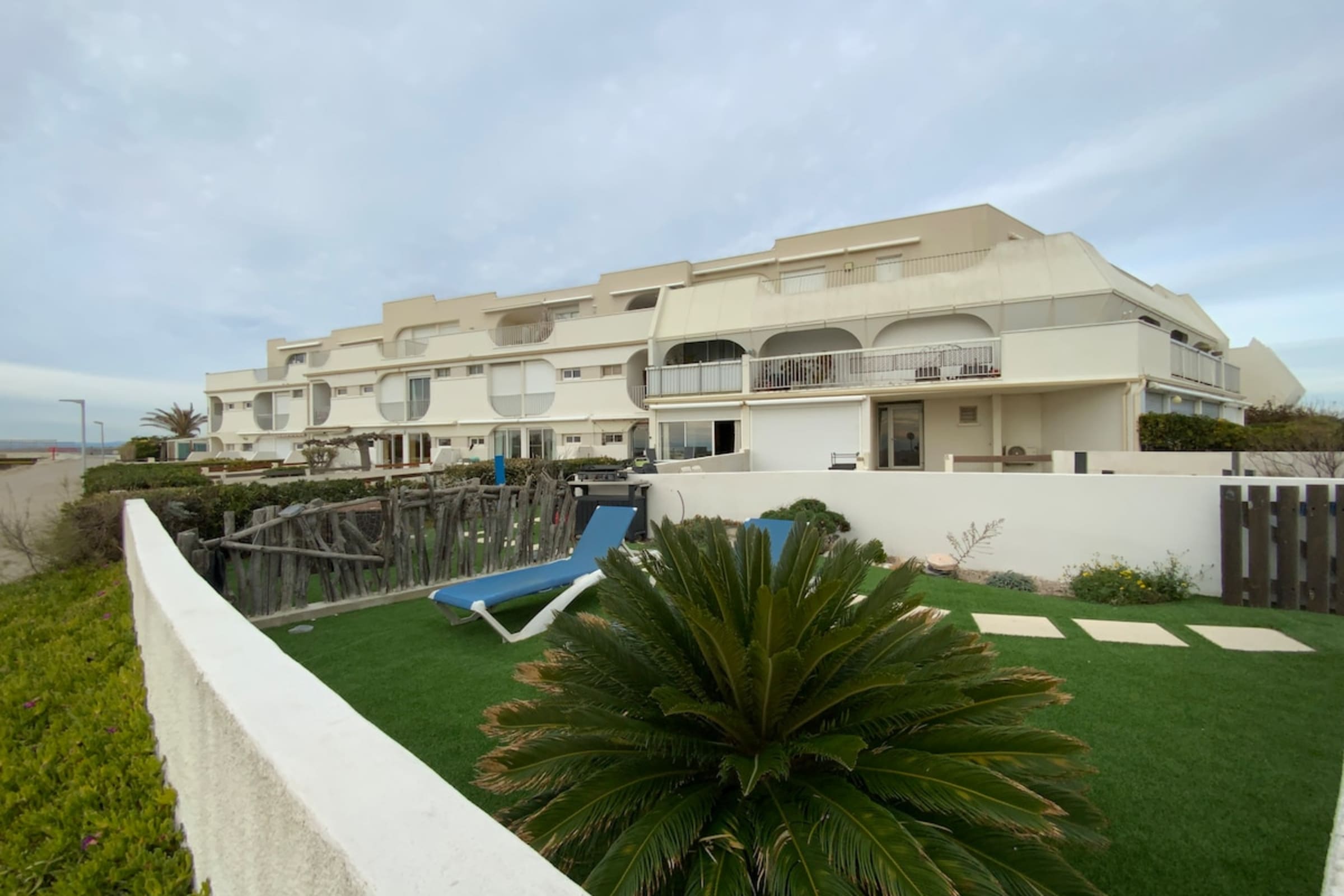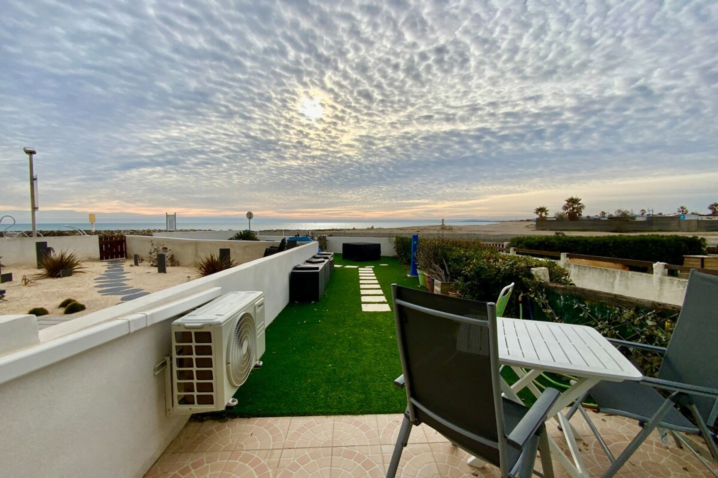 The exterior is an enclosed garden with plancha, electric awning, deckchairs, dining table, outdoor shower and direct and private access to the beach.