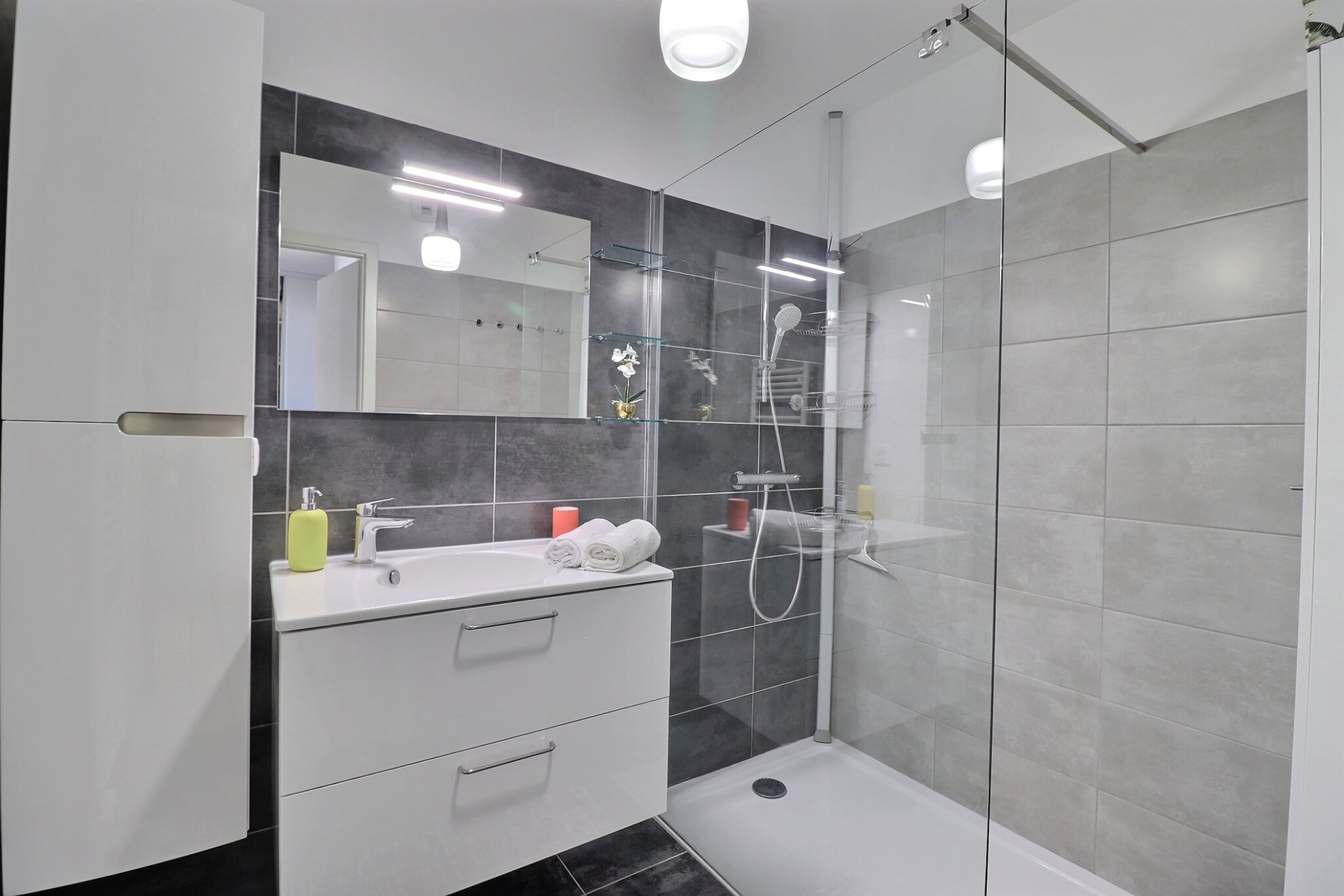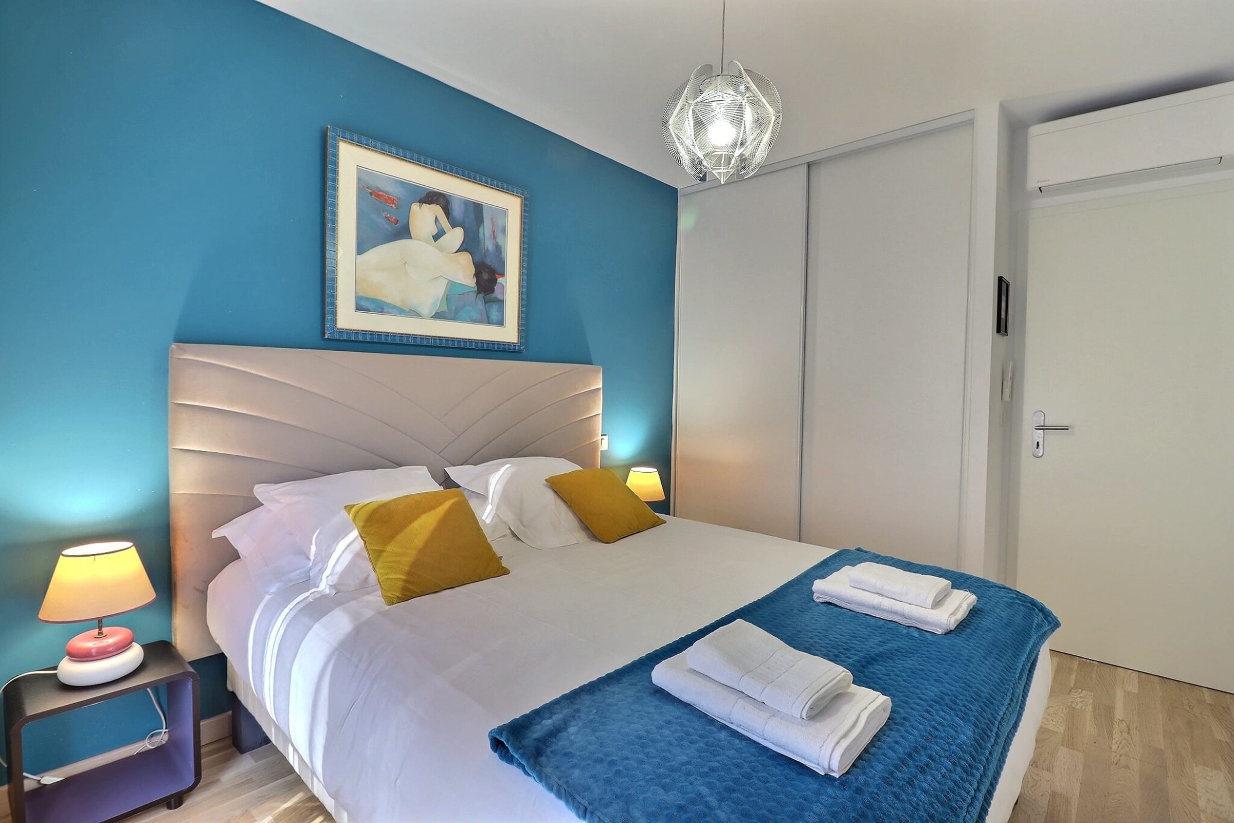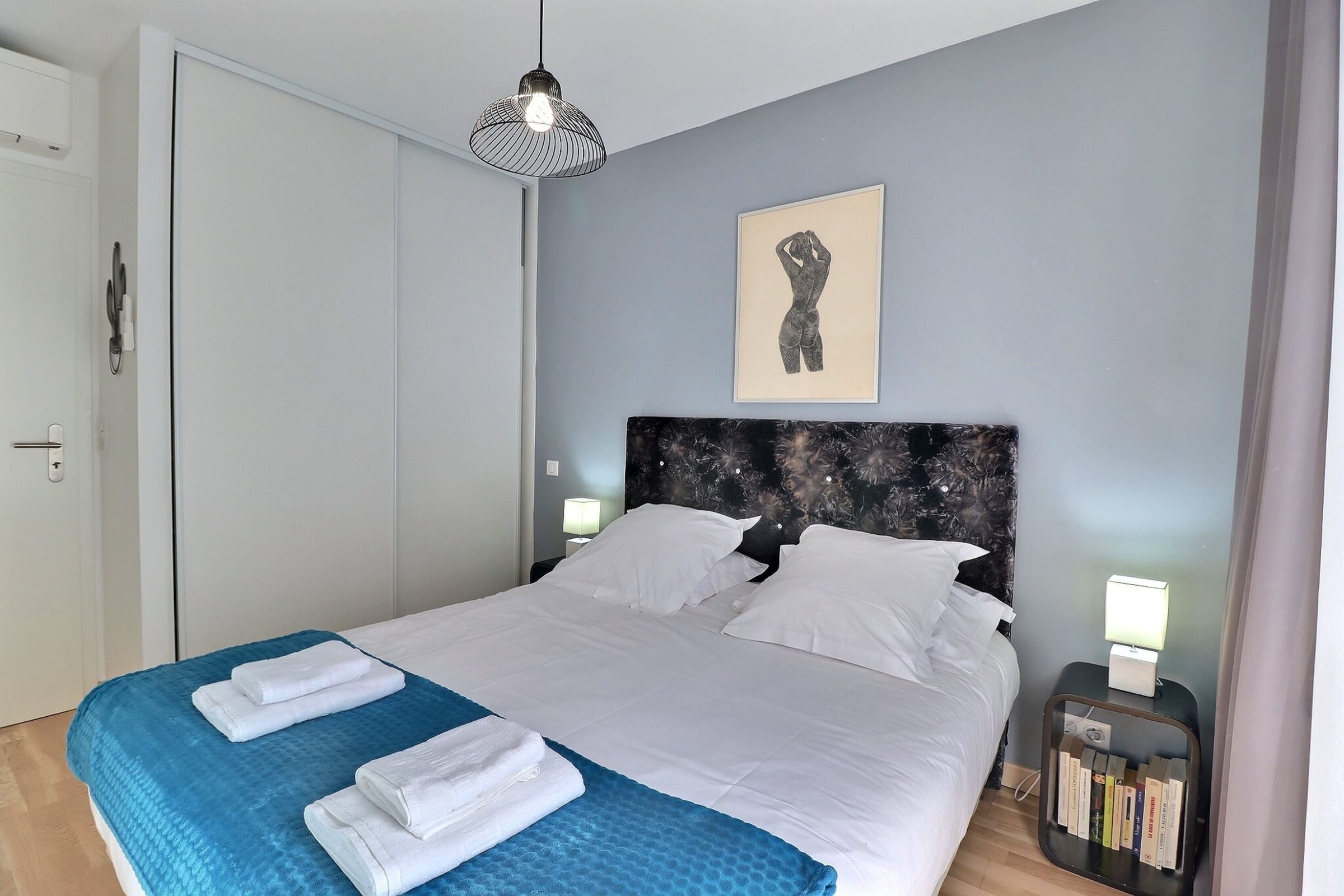 The sleeping area features two welcoming bedrooms, each furnished with a 160 cm queen-size bed and designed to ensure optimal comfort. The layout is well balanced, with built-in storage and a soothing ambiance. Every detail has been carefully considered to guarantee une conciergerie and quality throughout your stay.