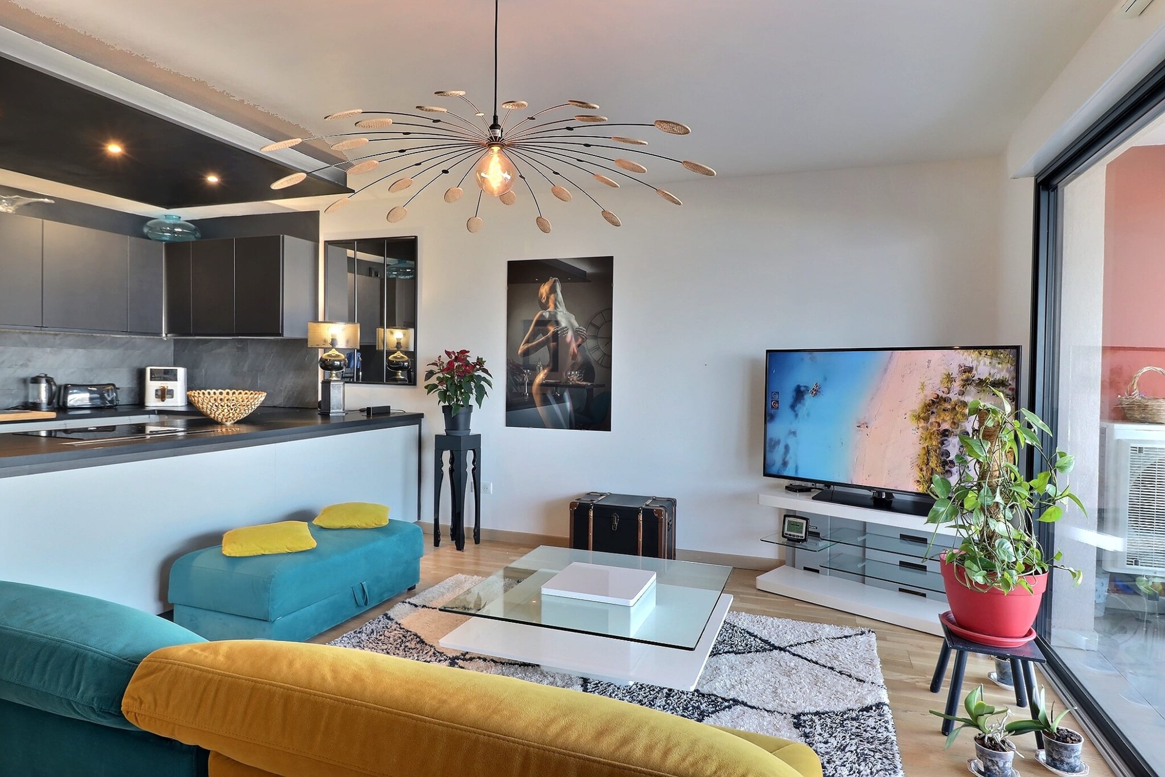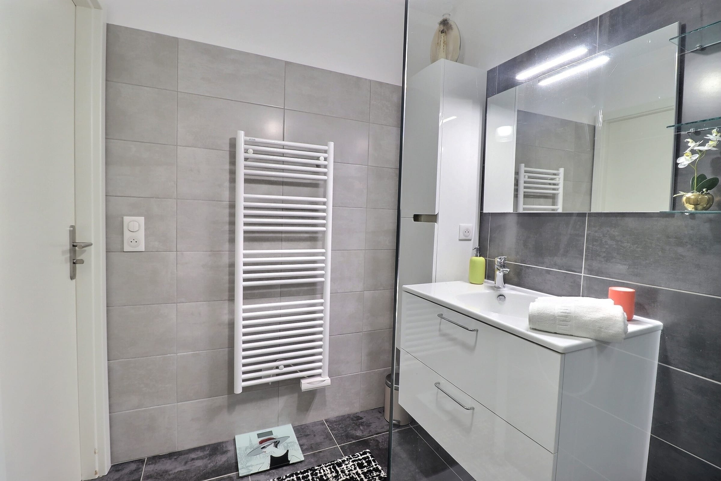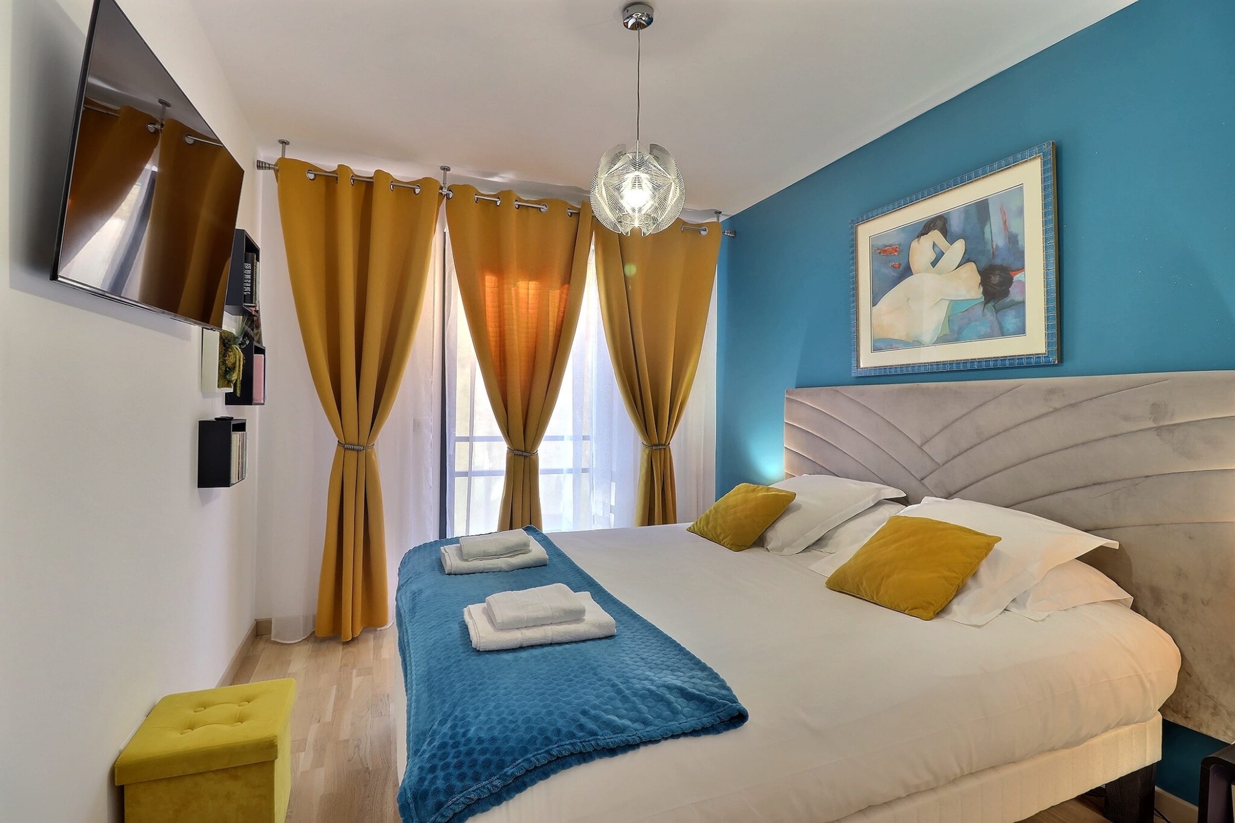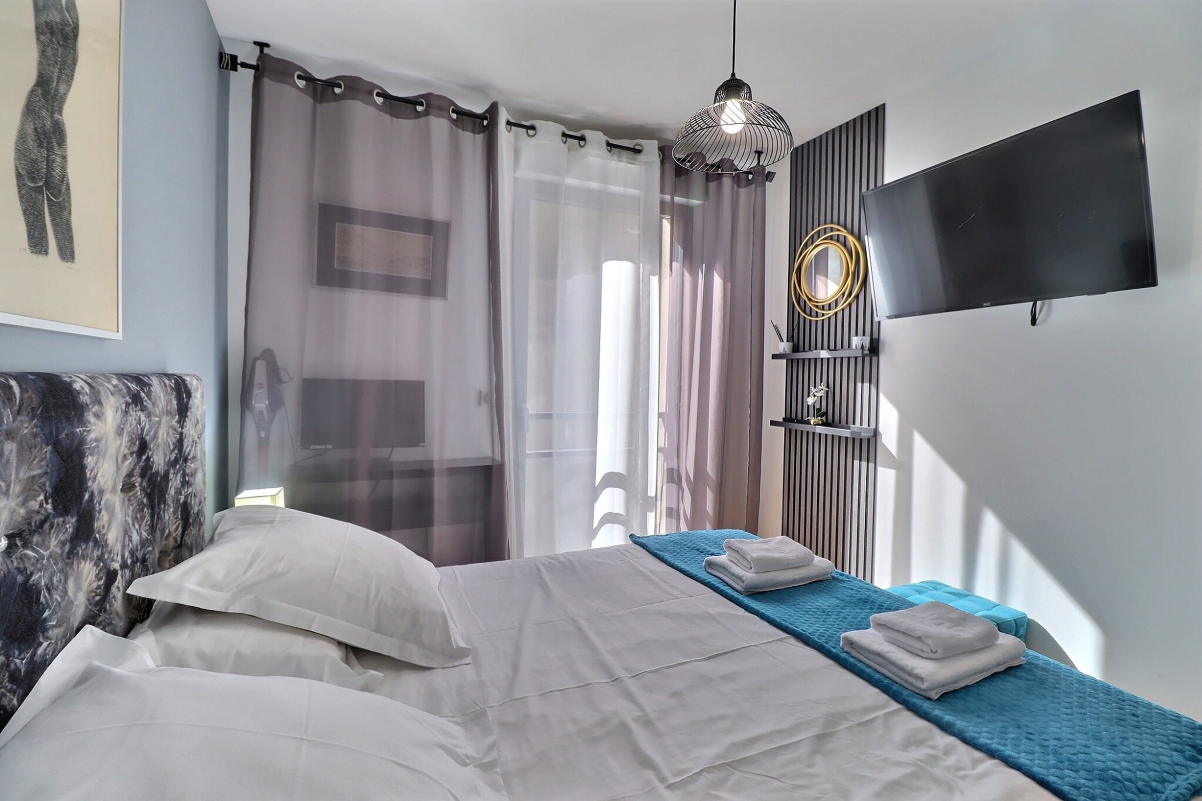 The sleeping area features two welcoming bedrooms, each furnished with a 160 cm queen-size bed and designed to ensure optimal comfort. The layout is well balanced, with built-in storage and a soothing ambiance. Every detail has been carefully considered to guarantee une conciergerie and quality throughout your stay.