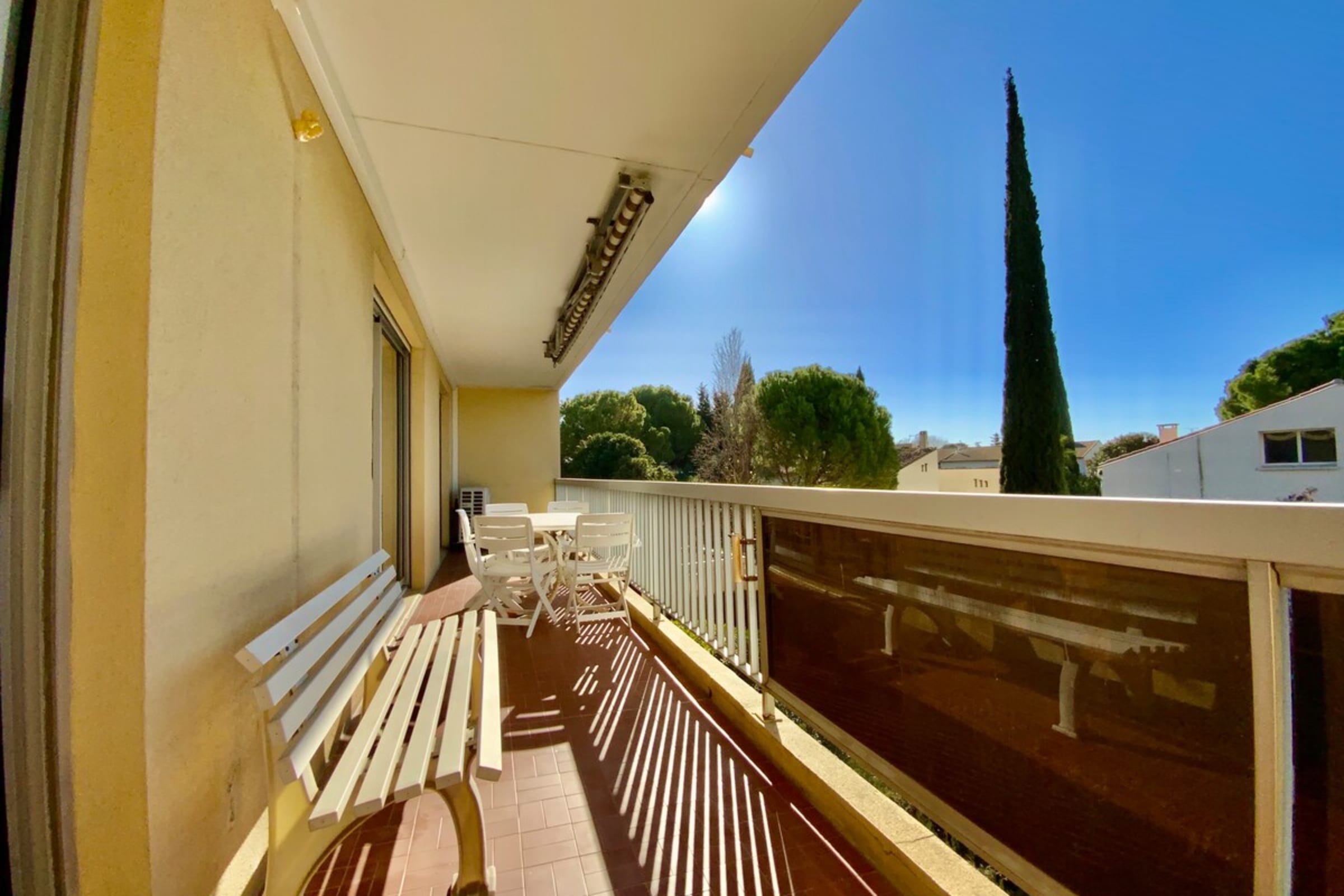 Outdoor space: a long, sunny terrace with dining area and bench.