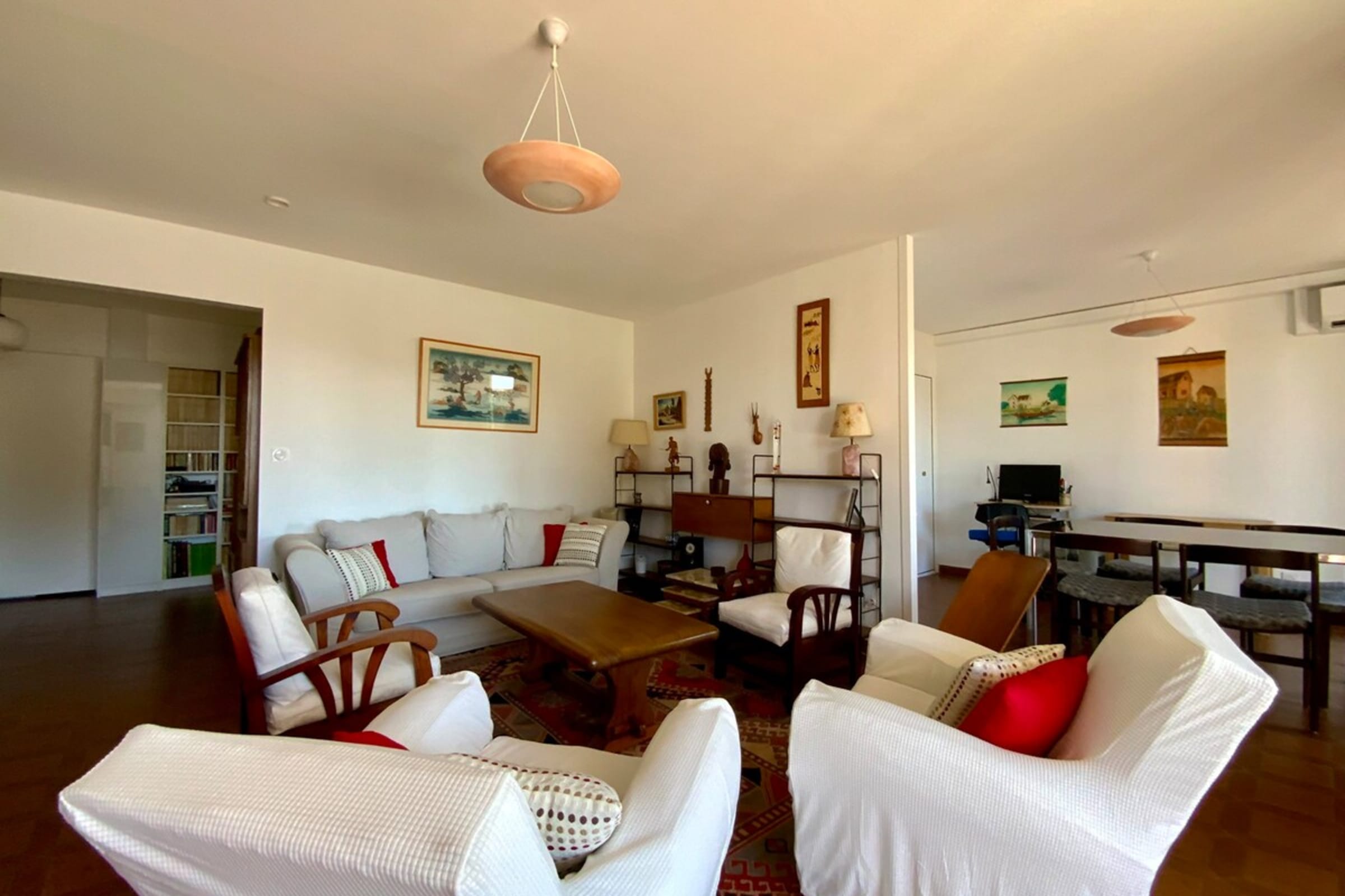 A living room including the lounge area with armchairs and sofas, a TV, a dining room side with a table that can accommodate 6 people.