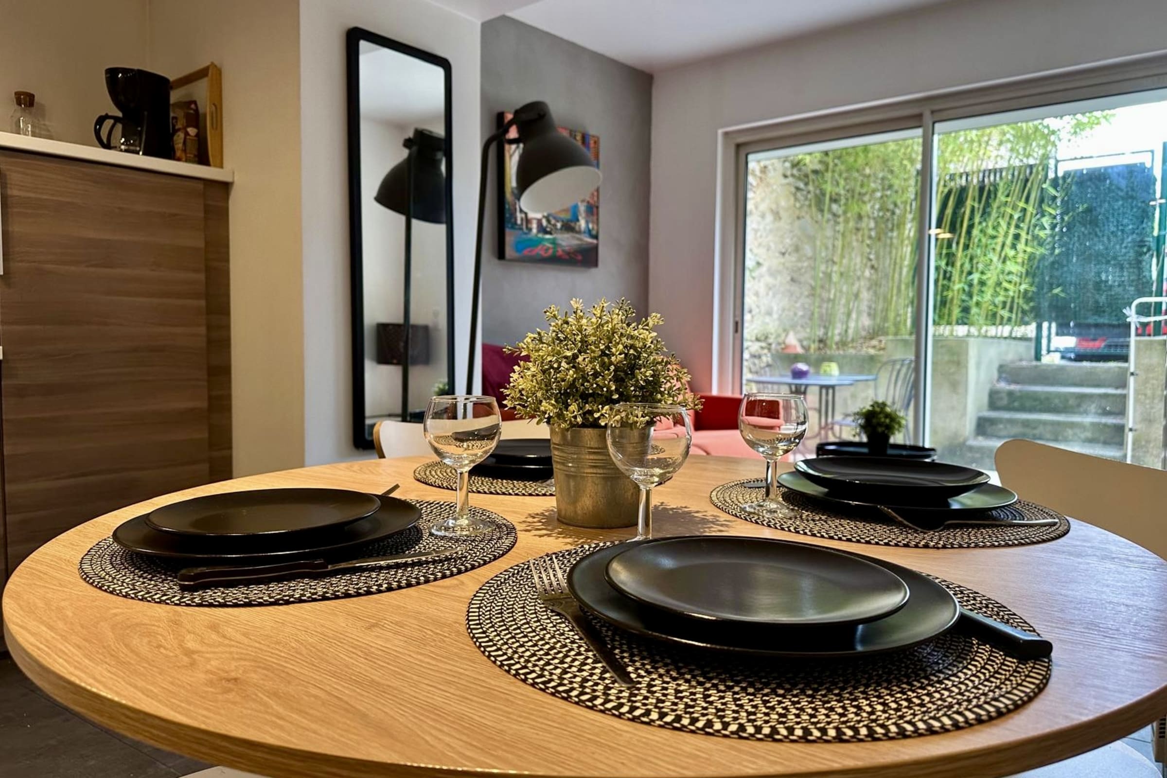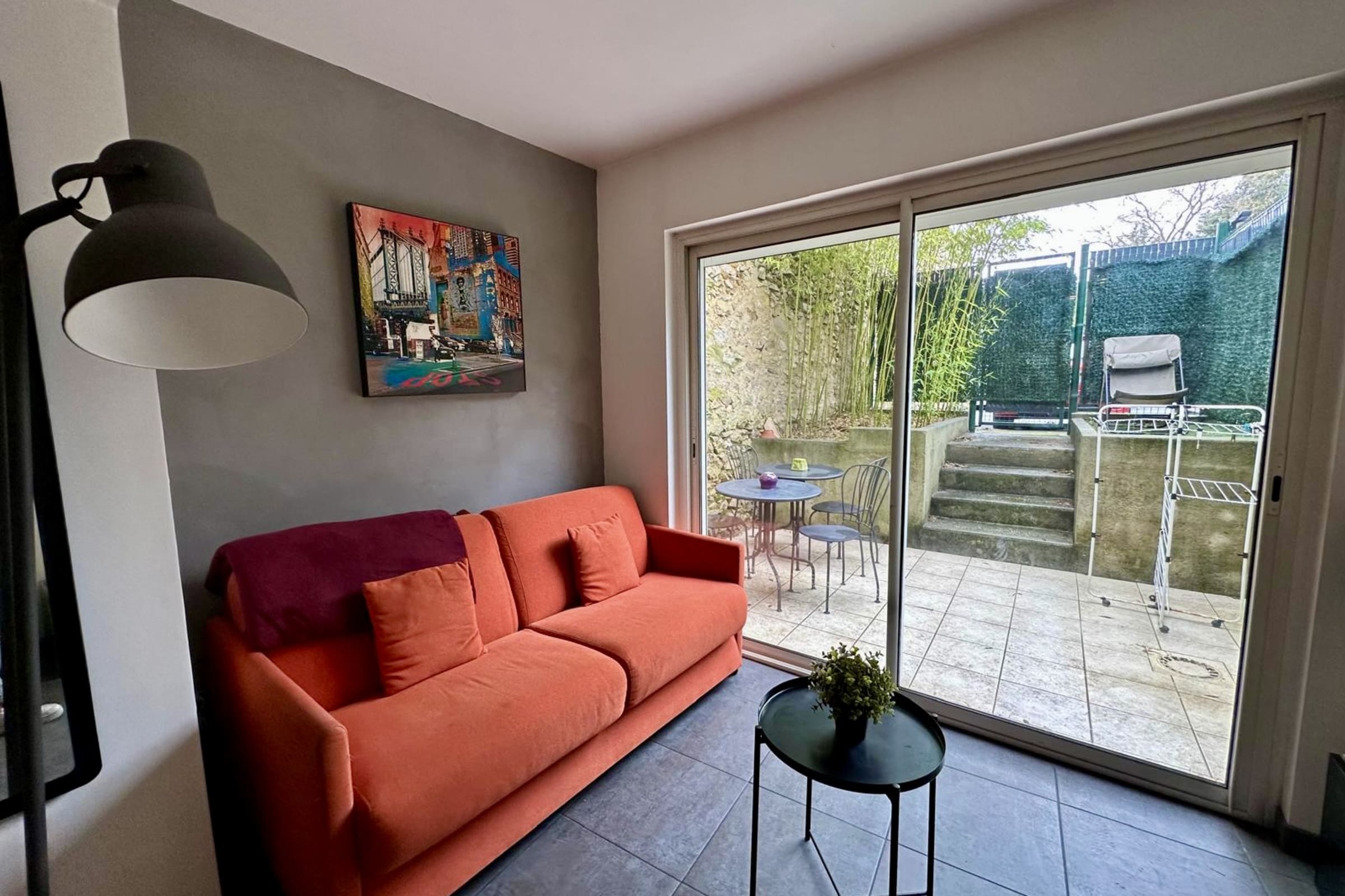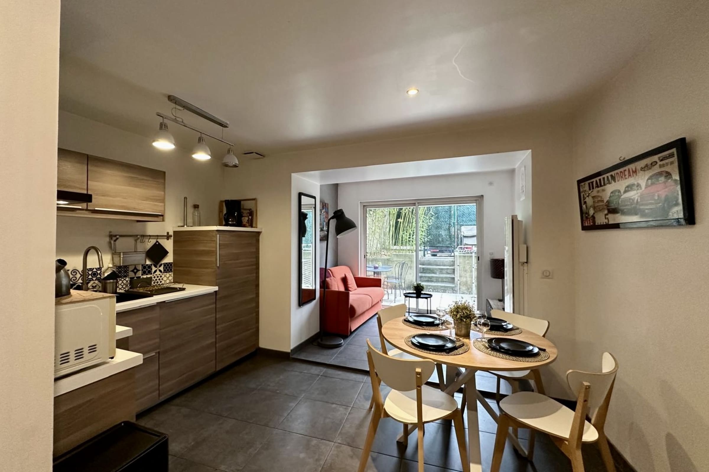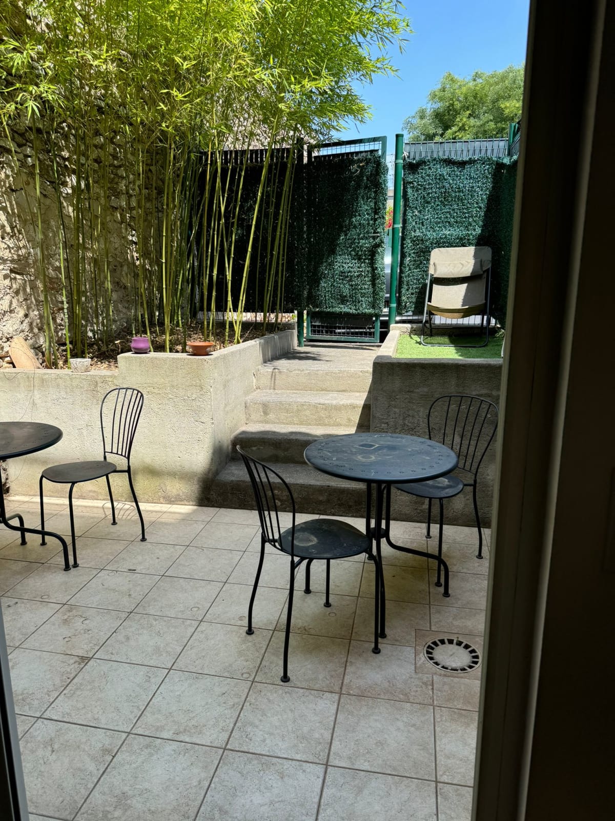 - 1 garden area with table, chairs and deckchair