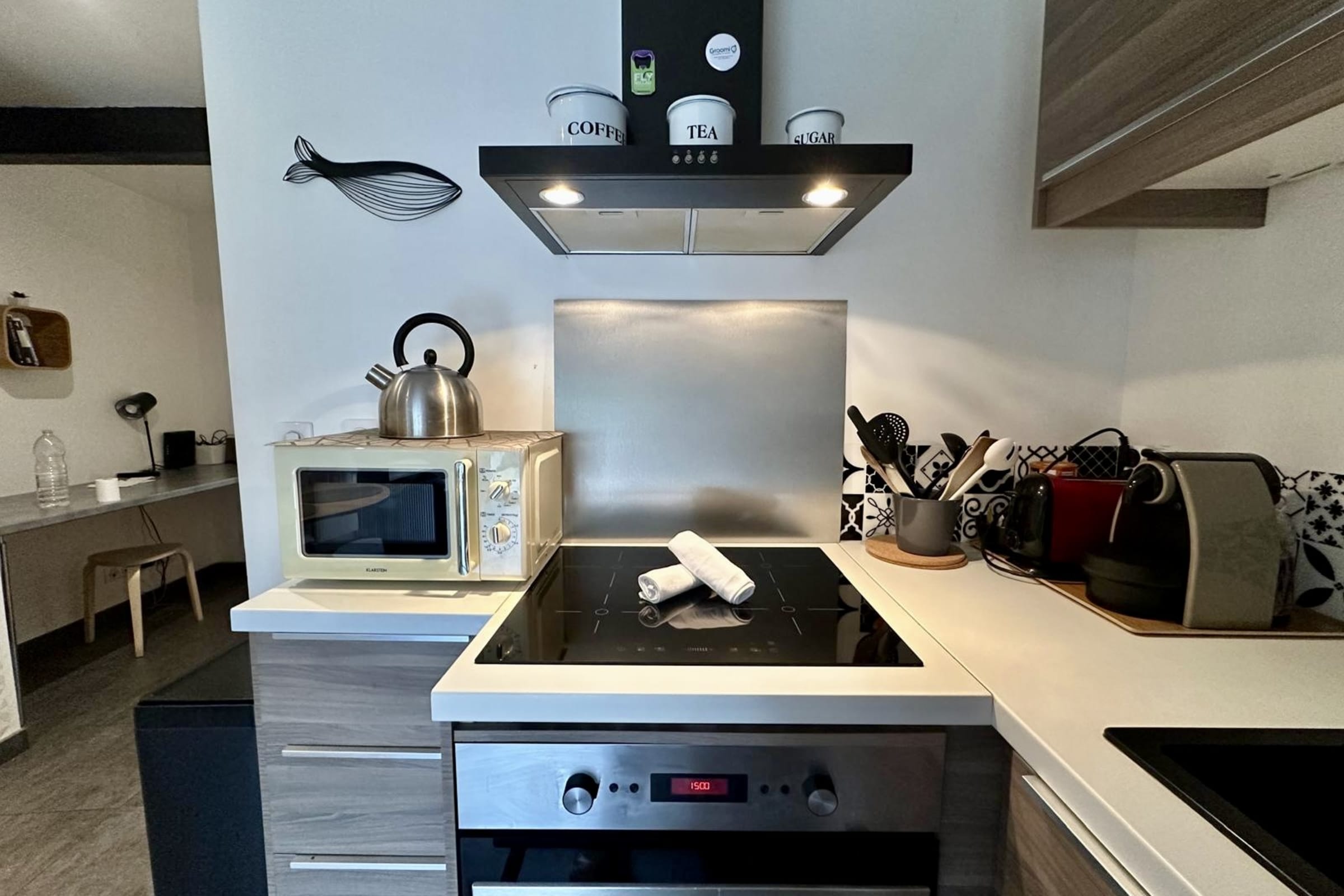 A living room including the lounge area with designer sofa bed and TV, a fully equipped kitchen (kettle, Nespresso coffee machine, hob, combined fridge, microwave, etc.)