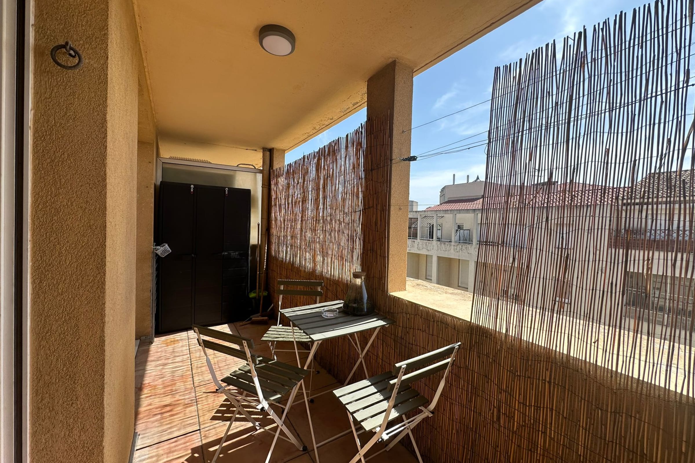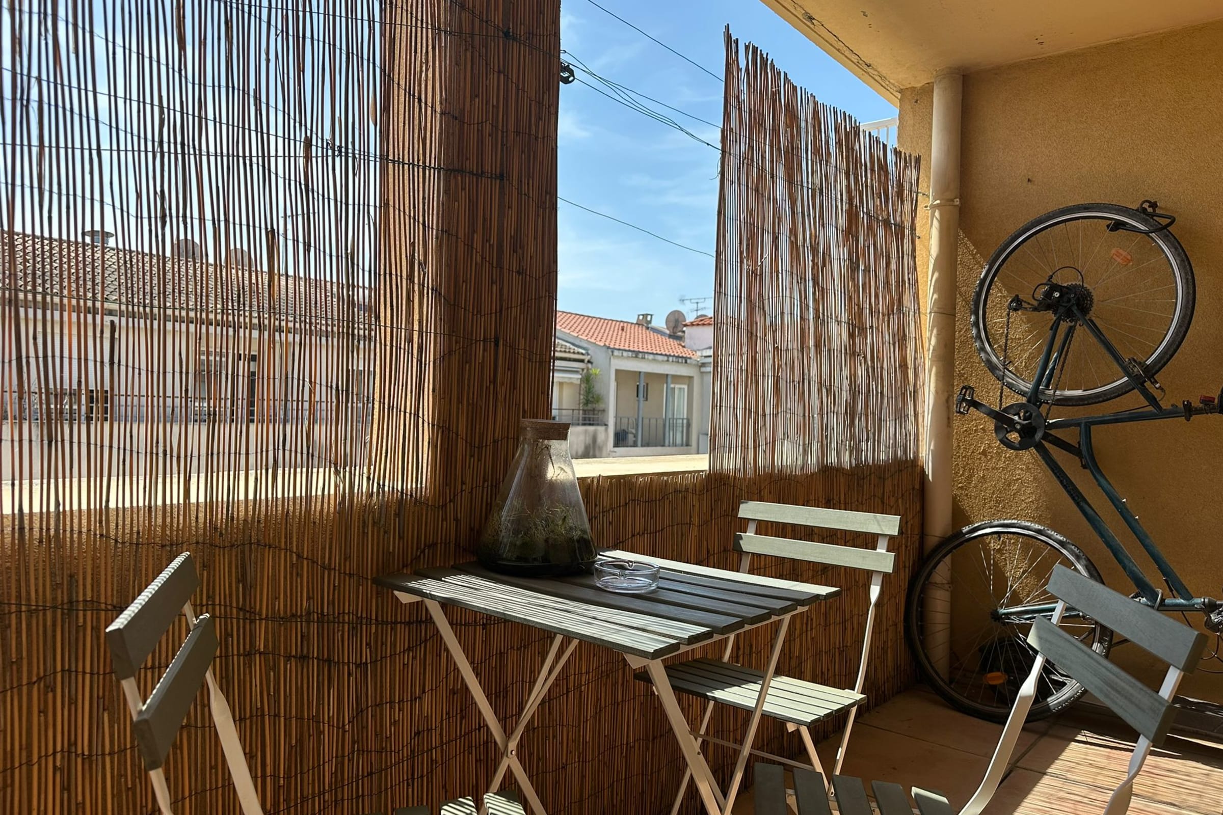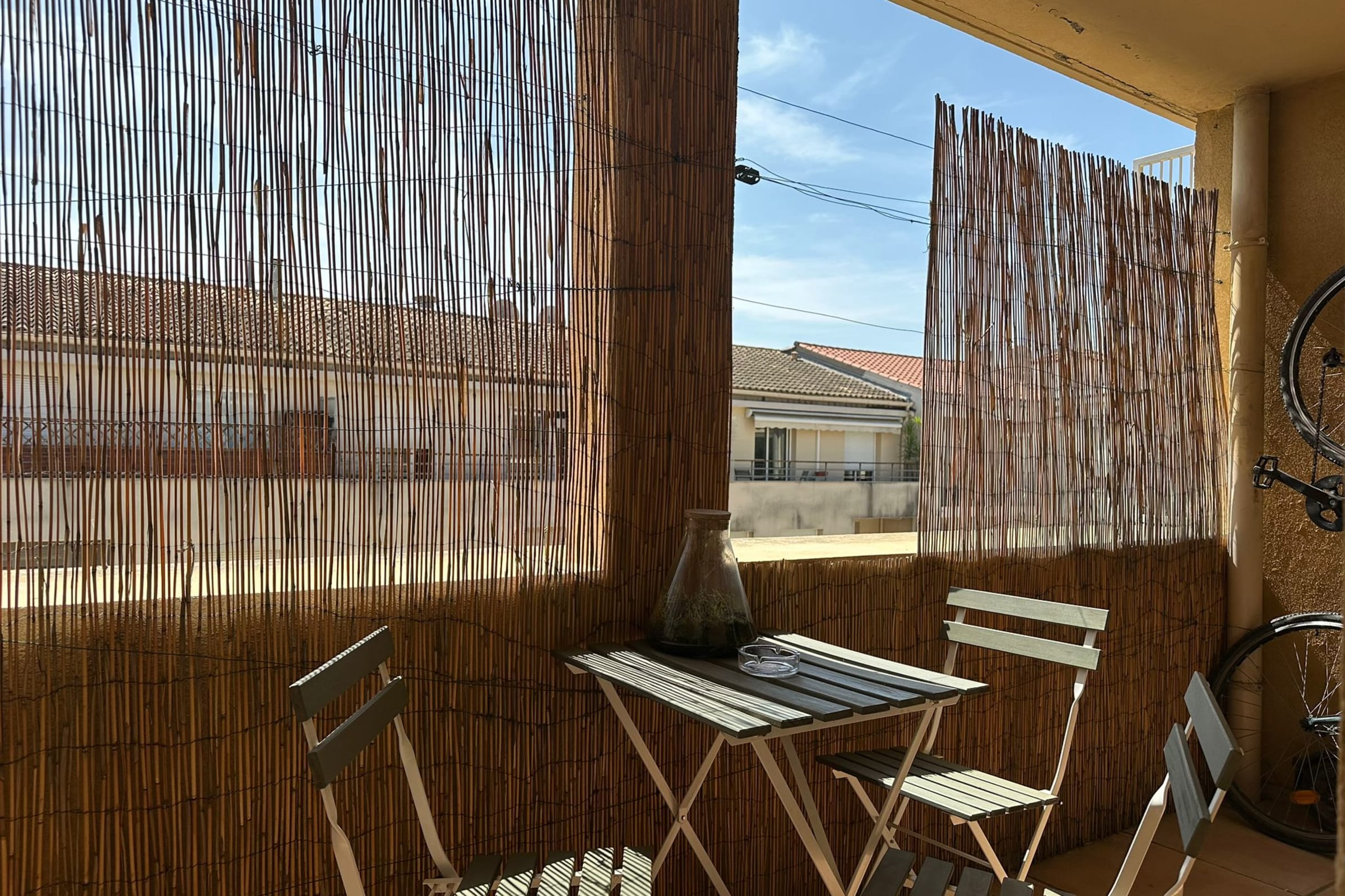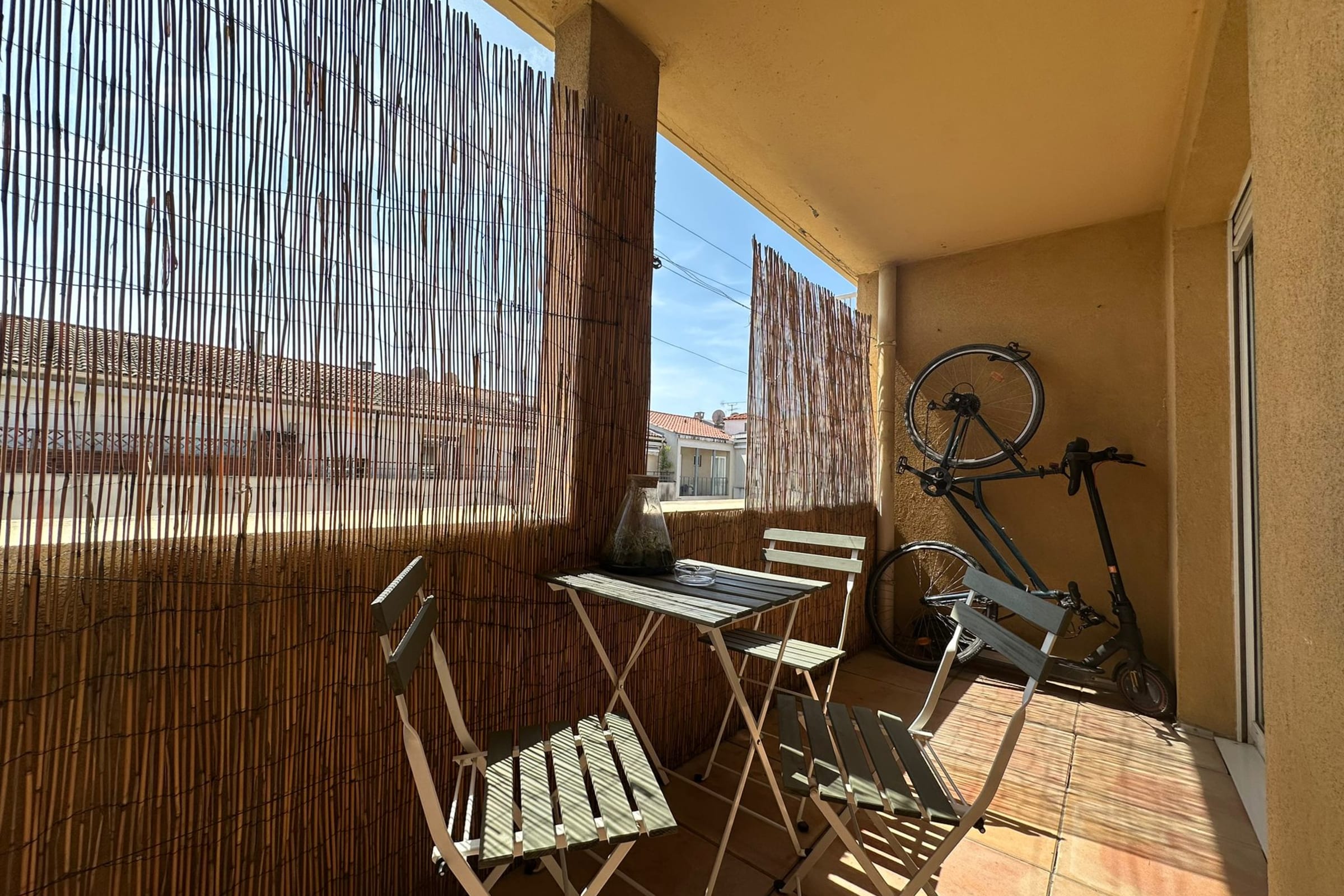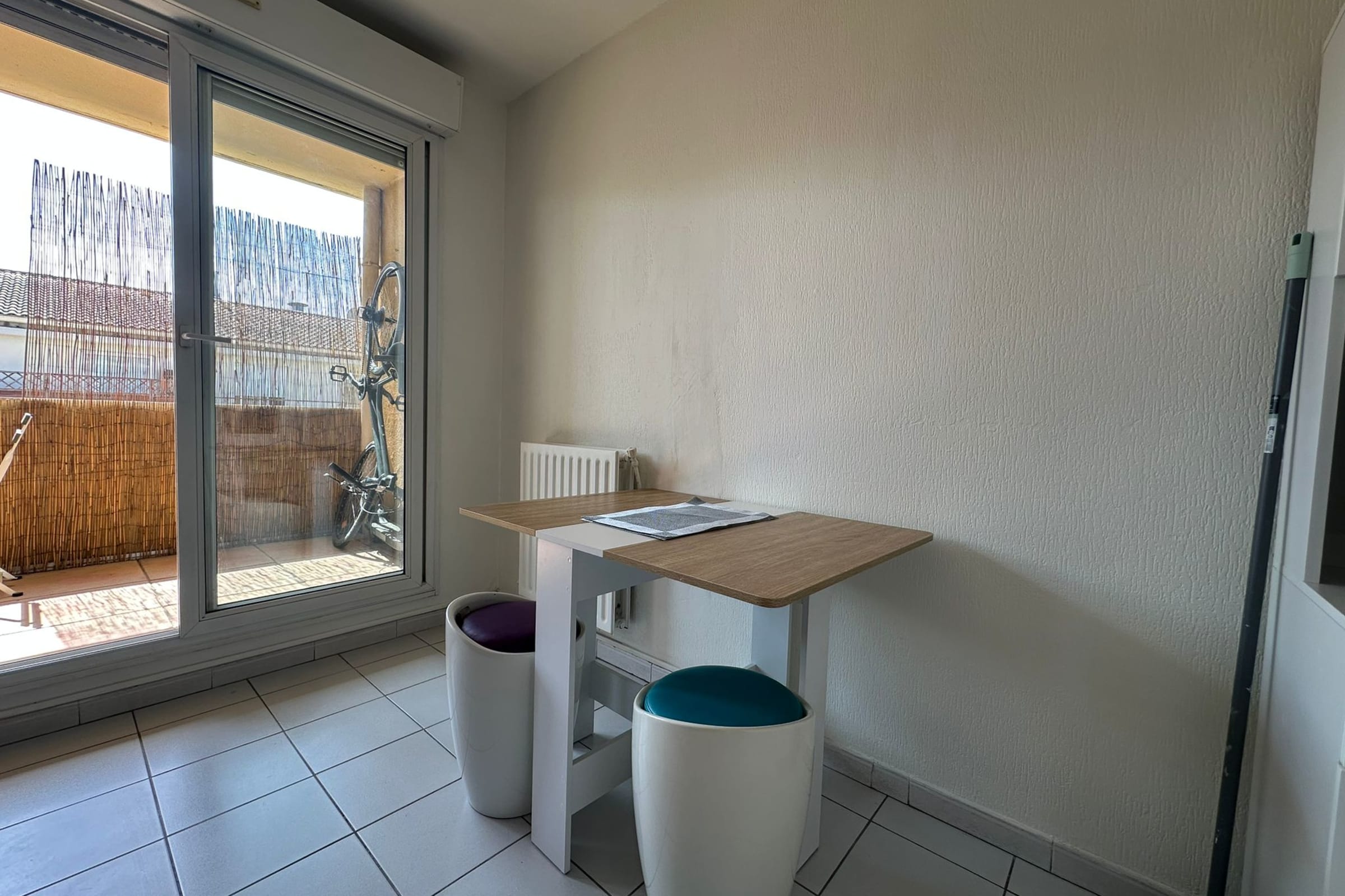 A pleasant and sunny balcony, accessible from the living room, features a table and chairs, perfect for enjoying meals outdoors.