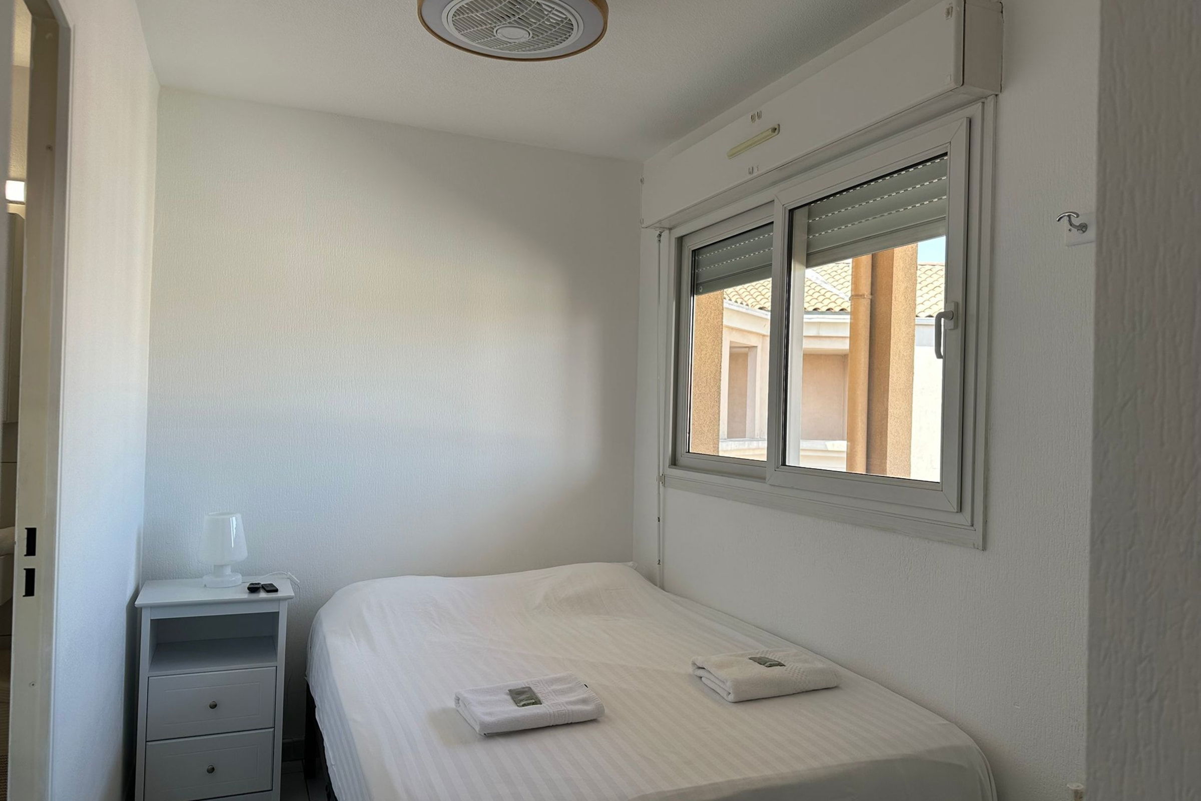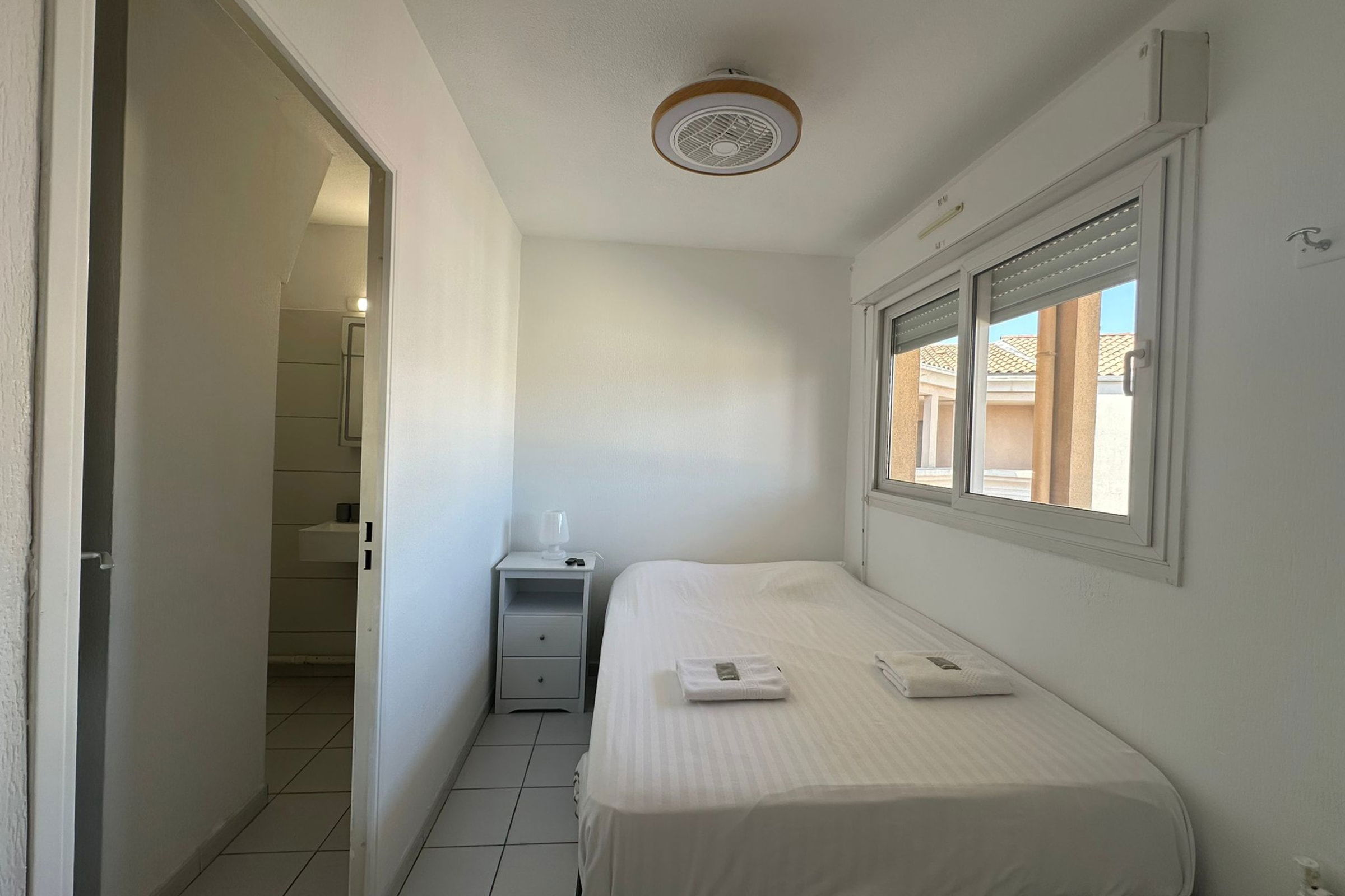 A bedroom with an en-suite bathroom is also available. The bedroom, overlooking a bright interior walkway, offers a comfortable and quiet sleeping space, with: