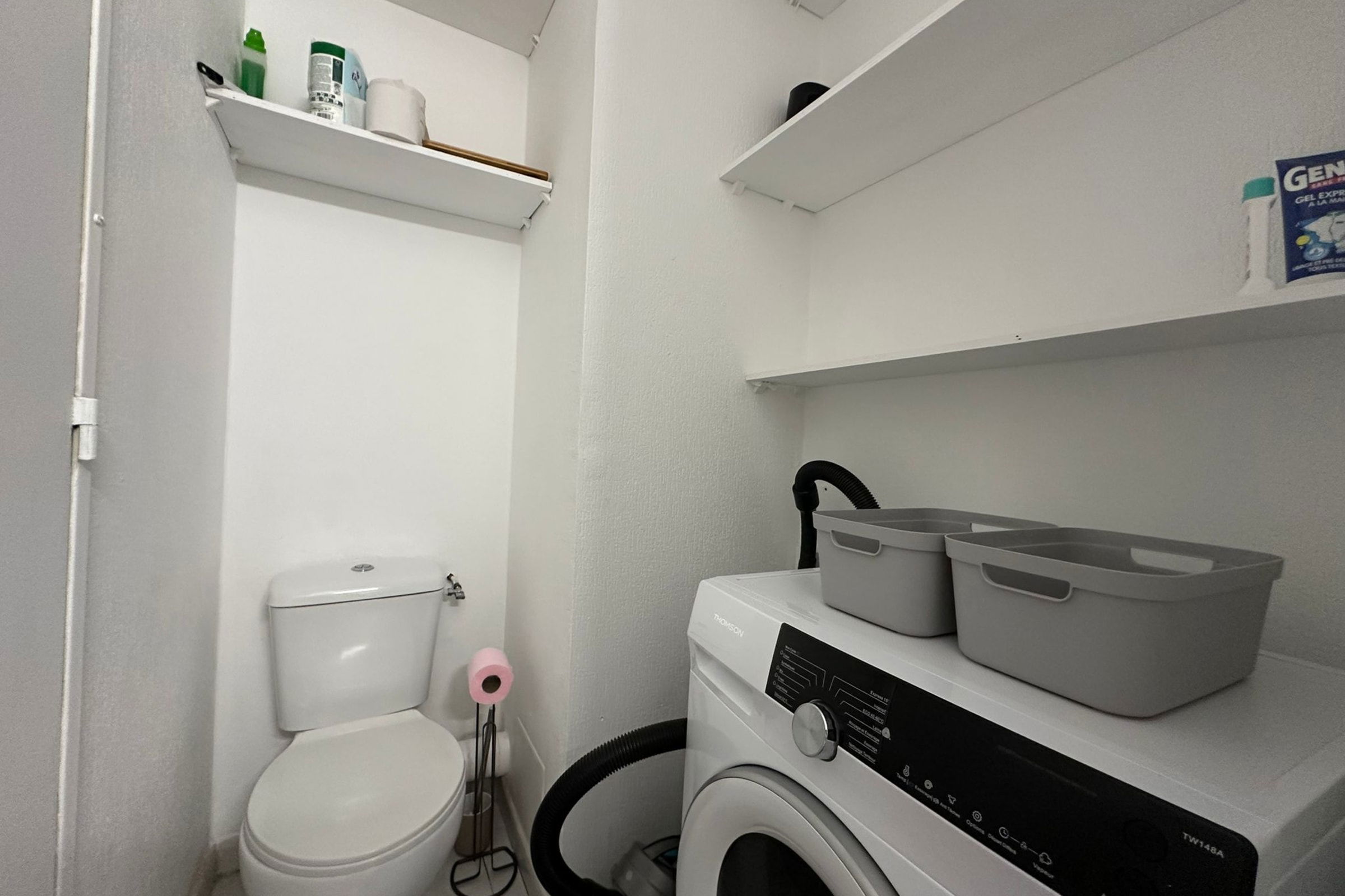 • A laundry corner with a washing machine and storage space