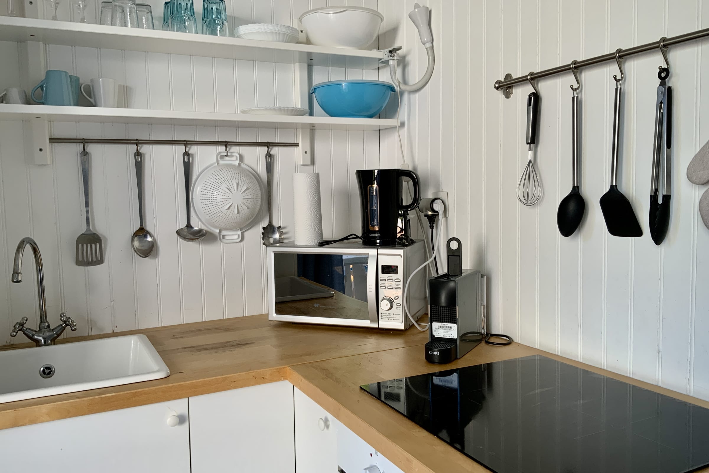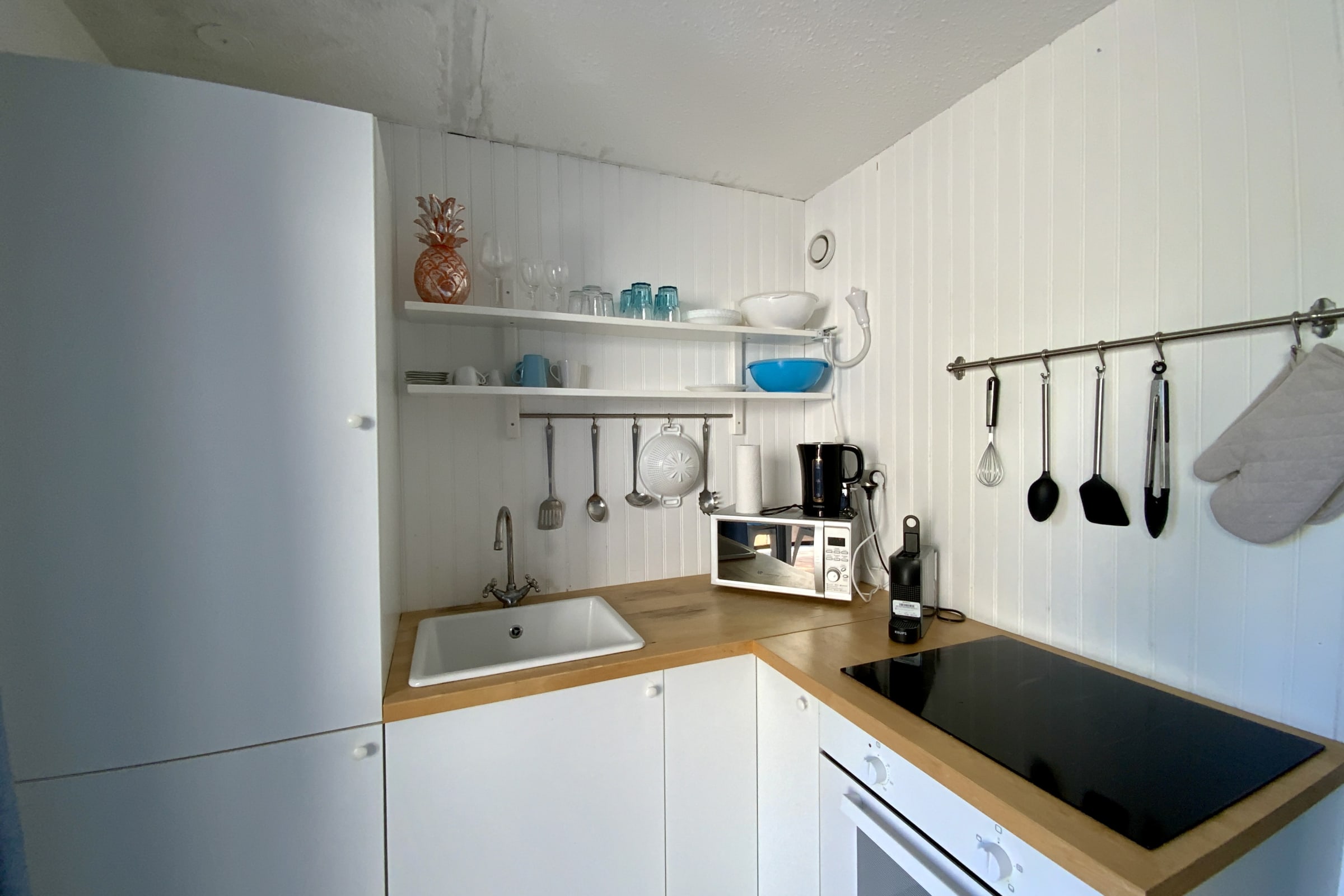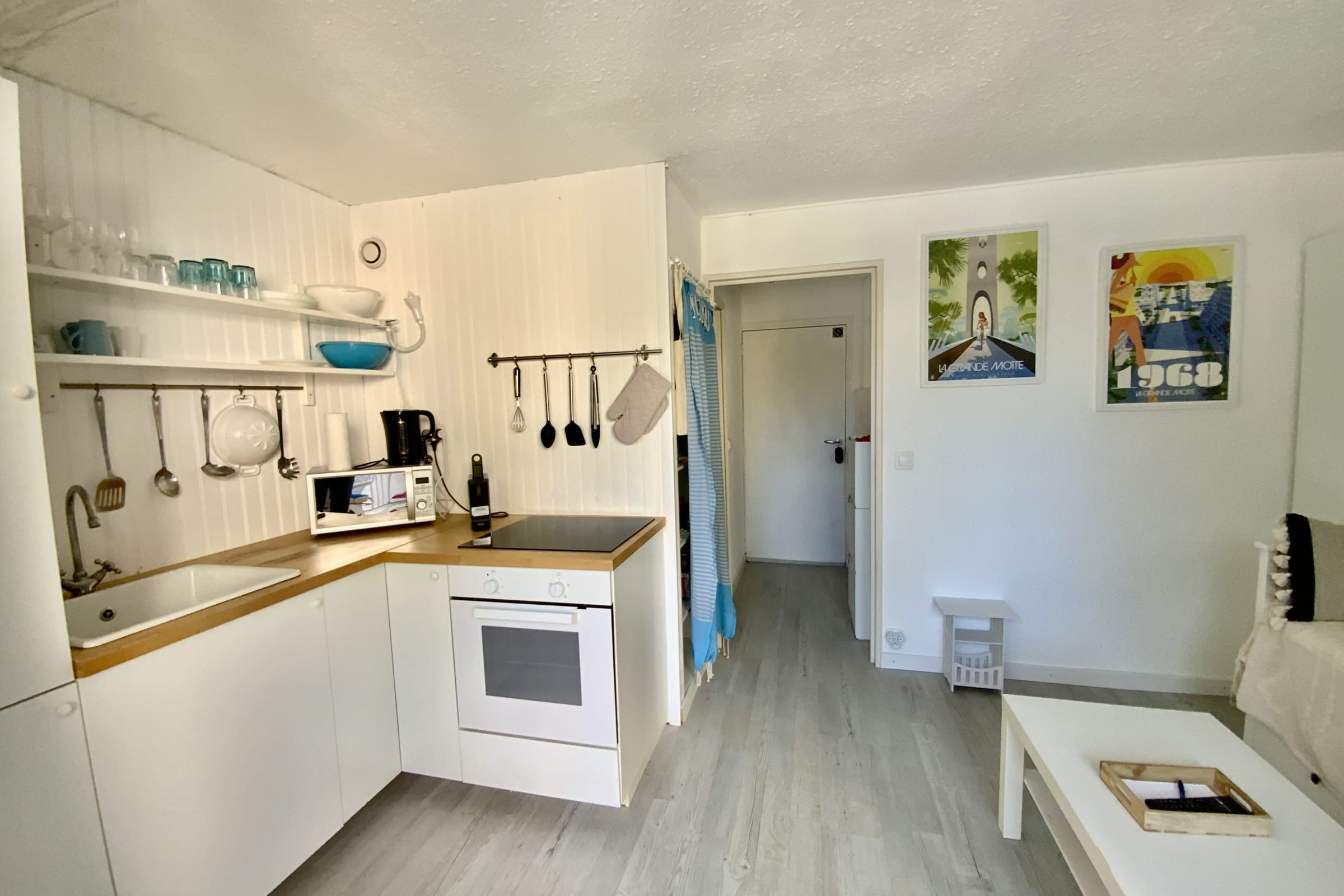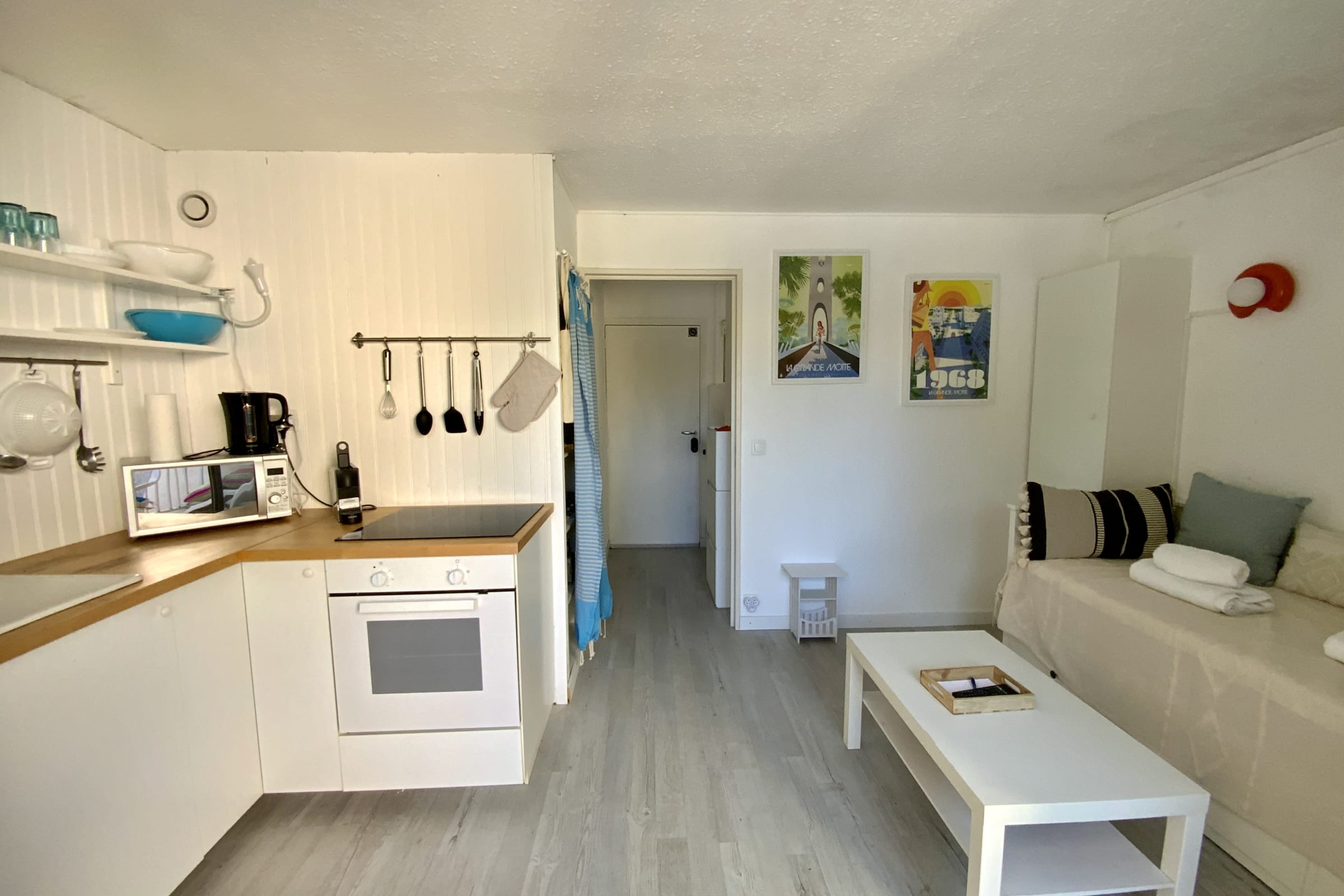 • An open-plan kitchenette connected to the living area, equipped for short and medium stays (cooktop, microwave, coffee maker, dishes, and kitchen utensils)
