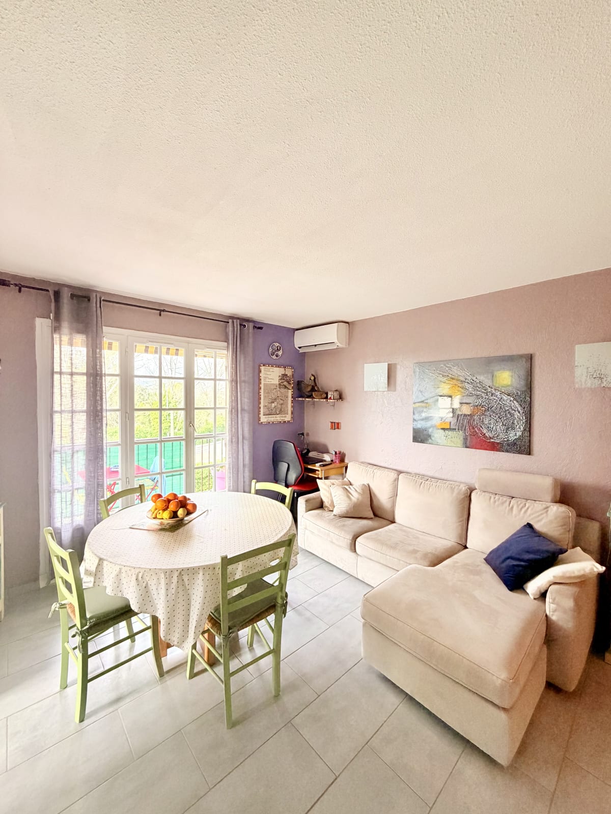 Dans le spacieux séjour, un canapé d’angle et une cuisine ouverte avec table et 4 chaises et un accès à la terrasse équipé d'une table et de chaise.