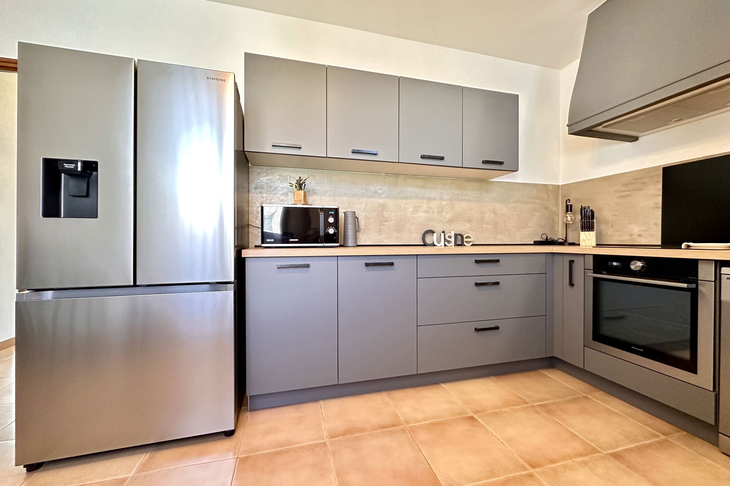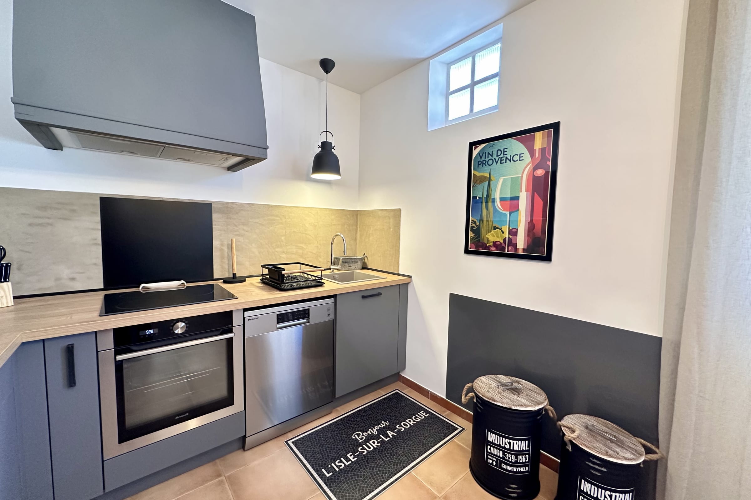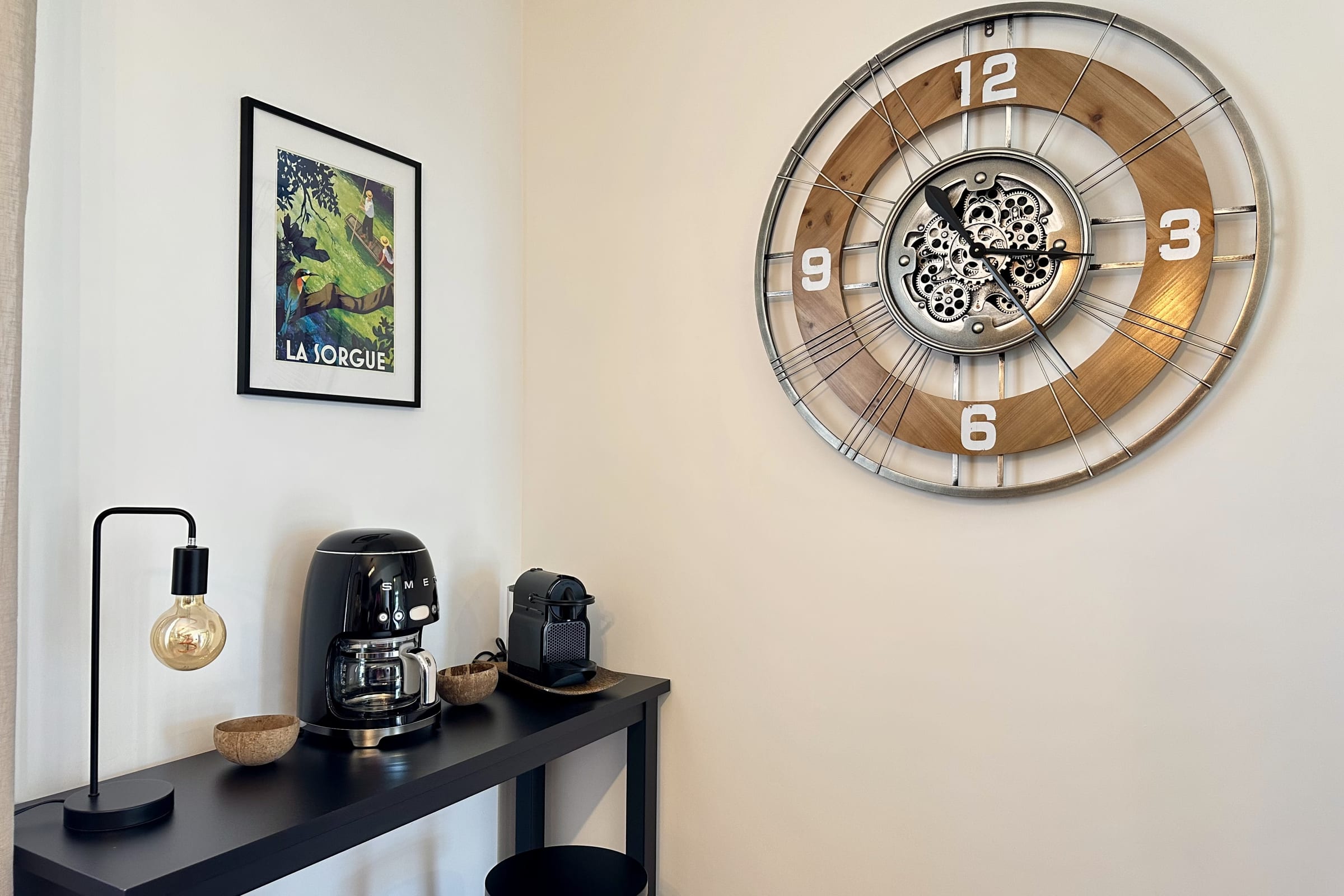 On the ground floor, you’ll find a fully equipped kitchen (oven, microwave, dishwasher, fridge/freezer, hob, toaster, kettle, Nespresso machine and Smeg filter coffee maker). Essentials such as oil, salt and pepper are provided.