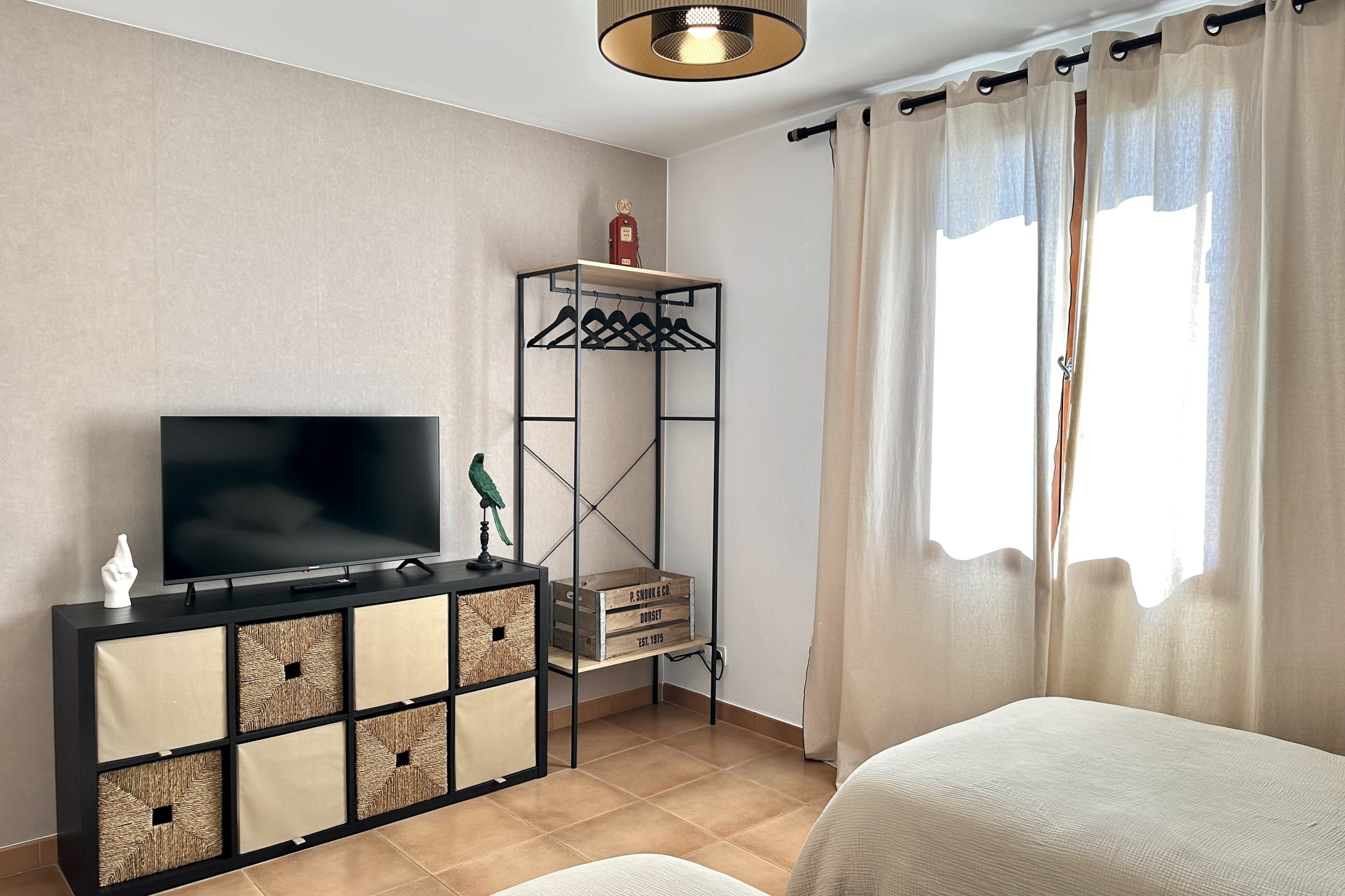 – one bedroom with two single beds and a TV