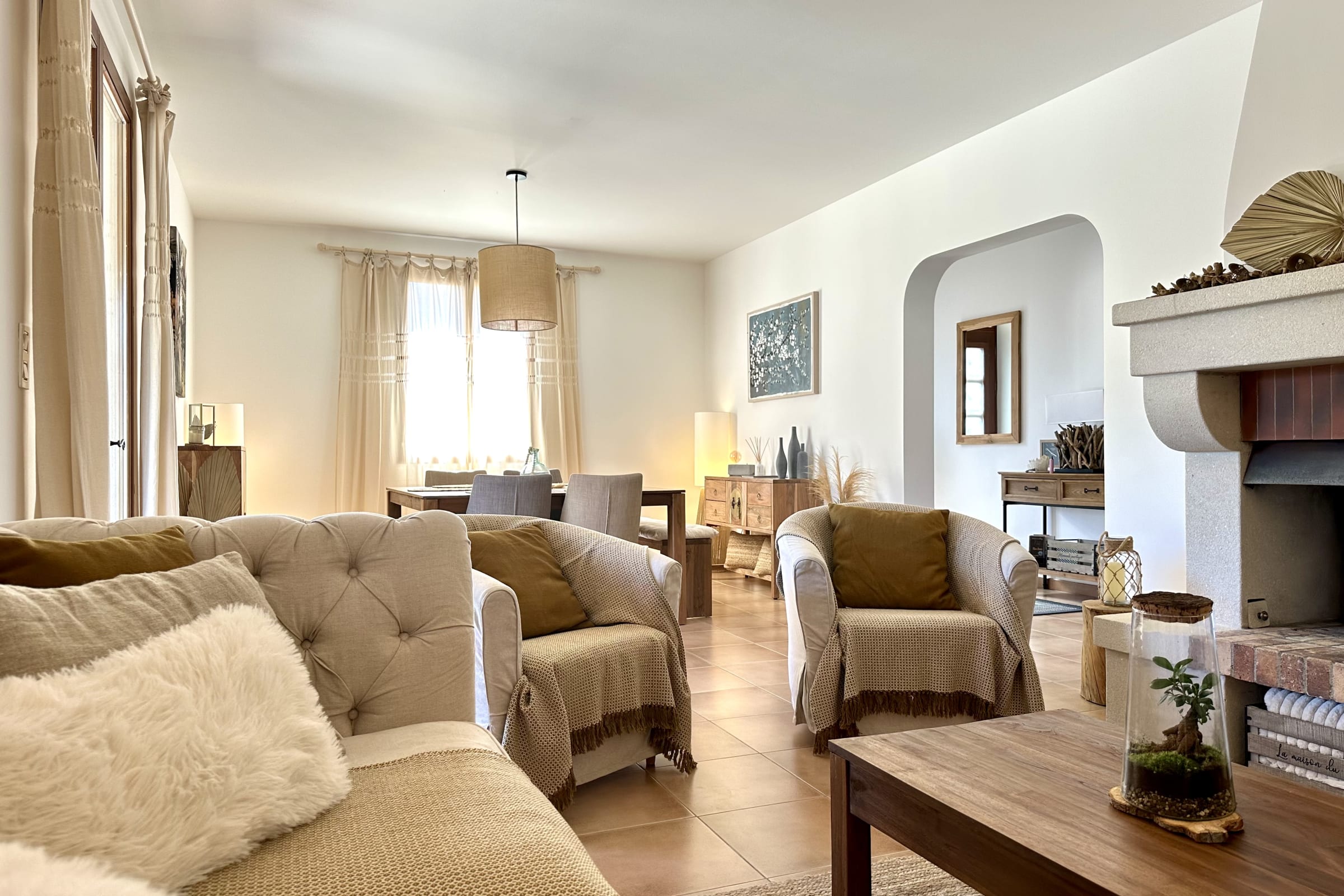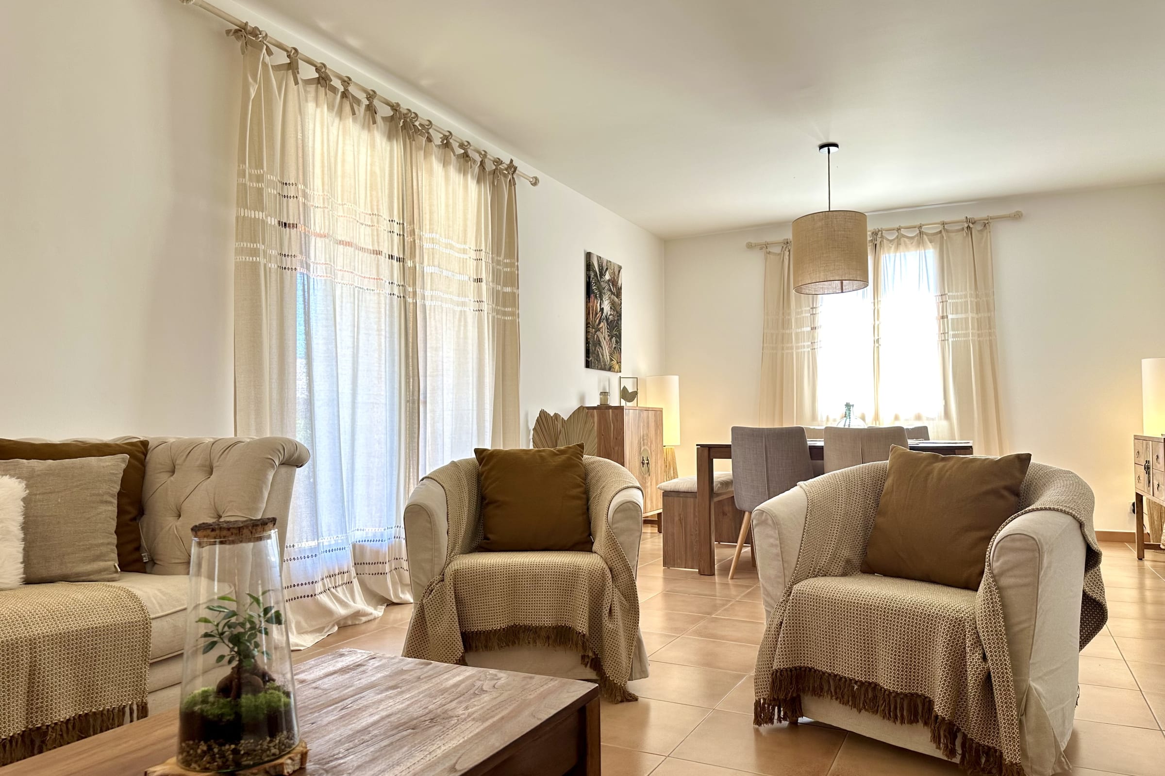 The living room opens directly onto the terrace, making it easy to enjoy the outdoor space. The dining area is located just next to it.