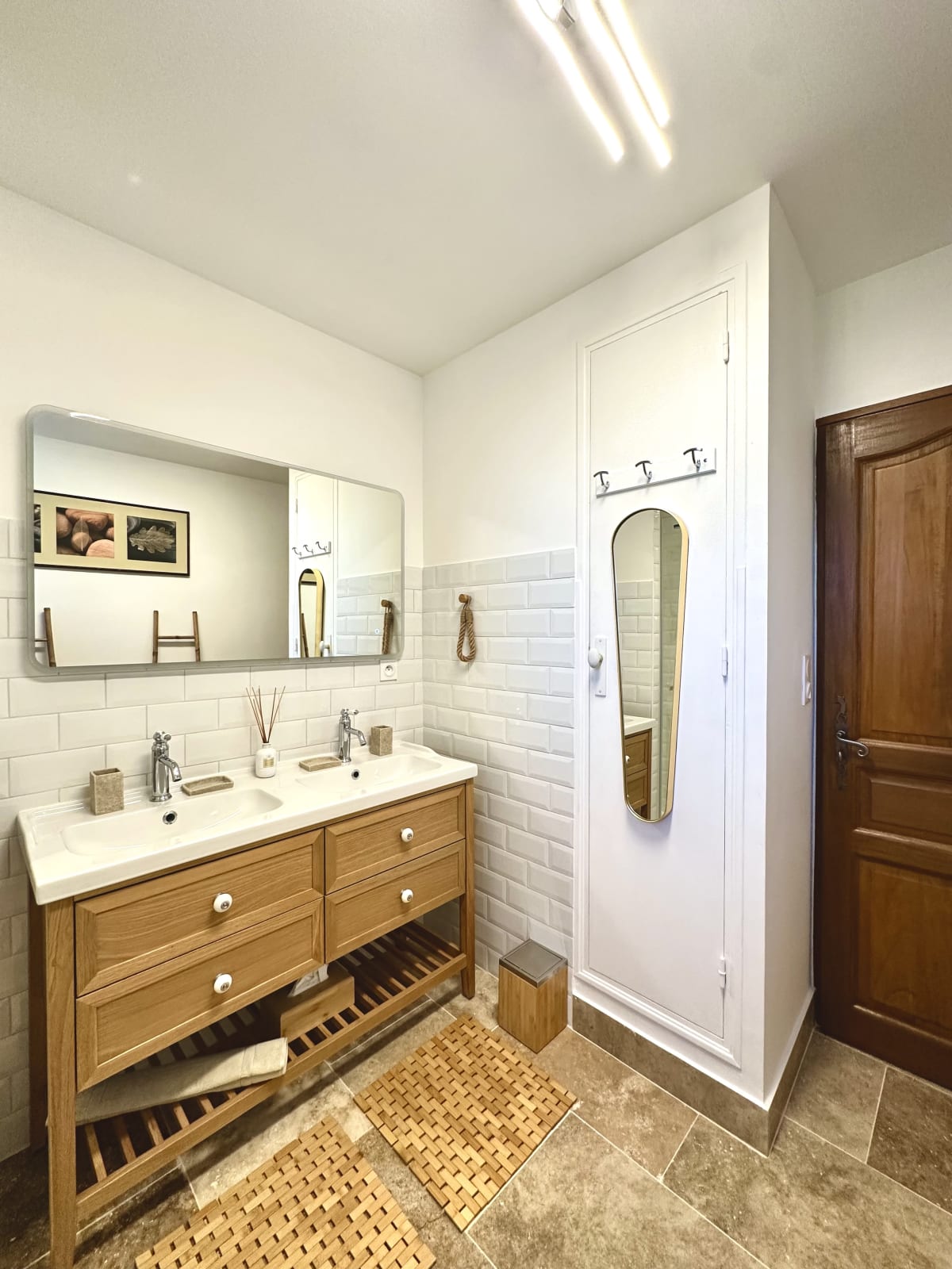 The bathroom includes a shower, double washbasin and toilet.