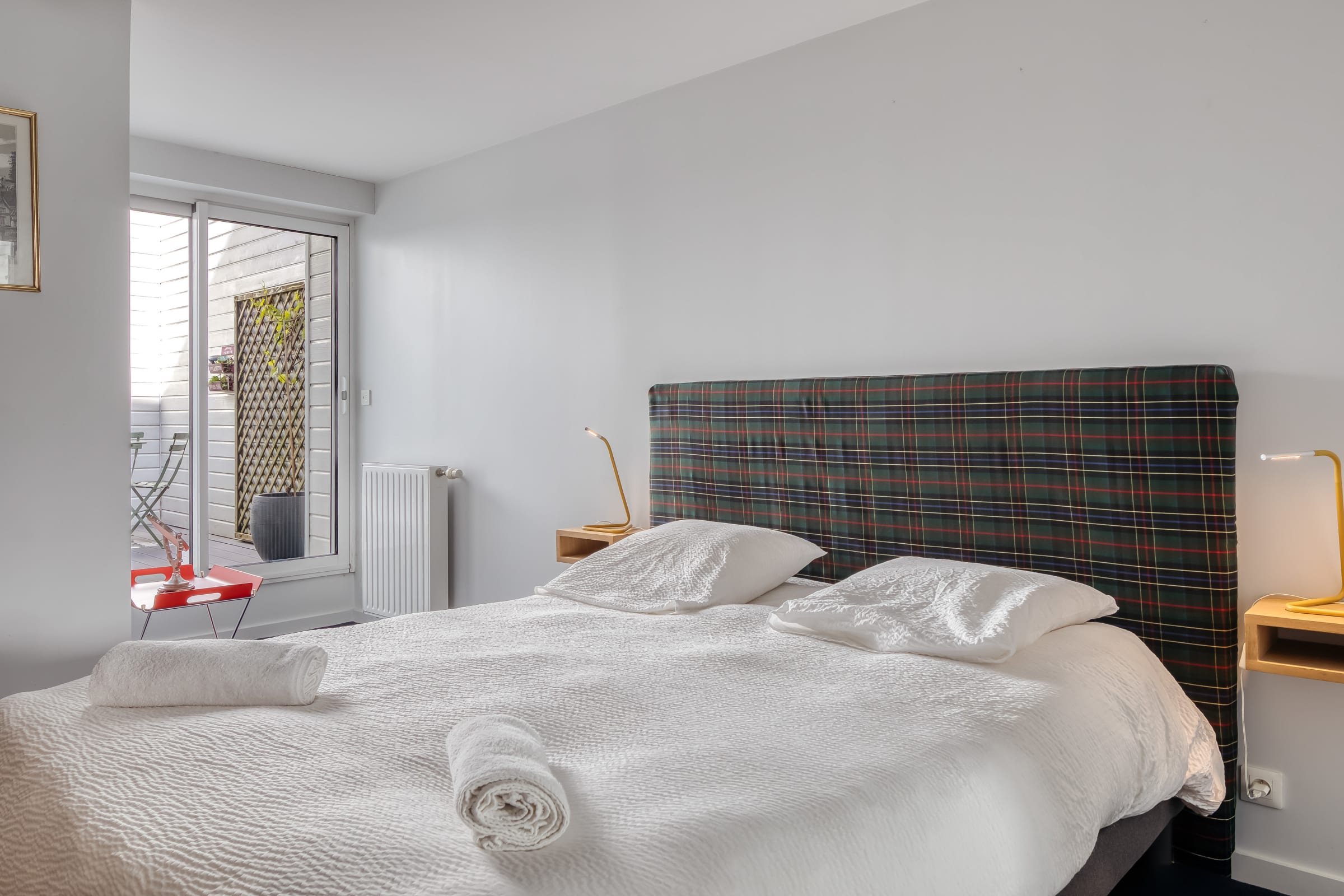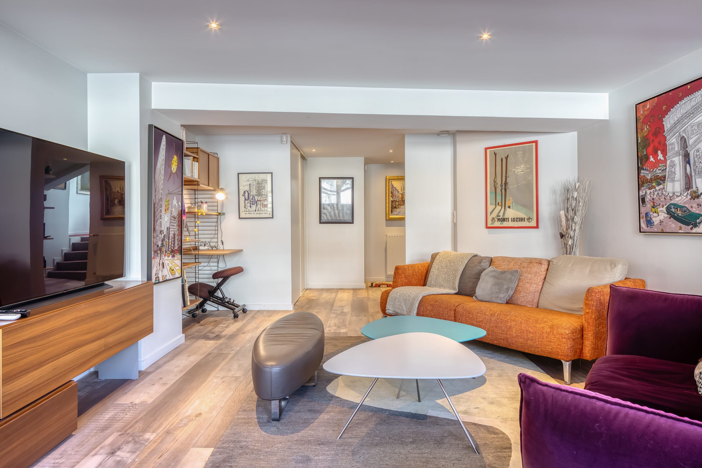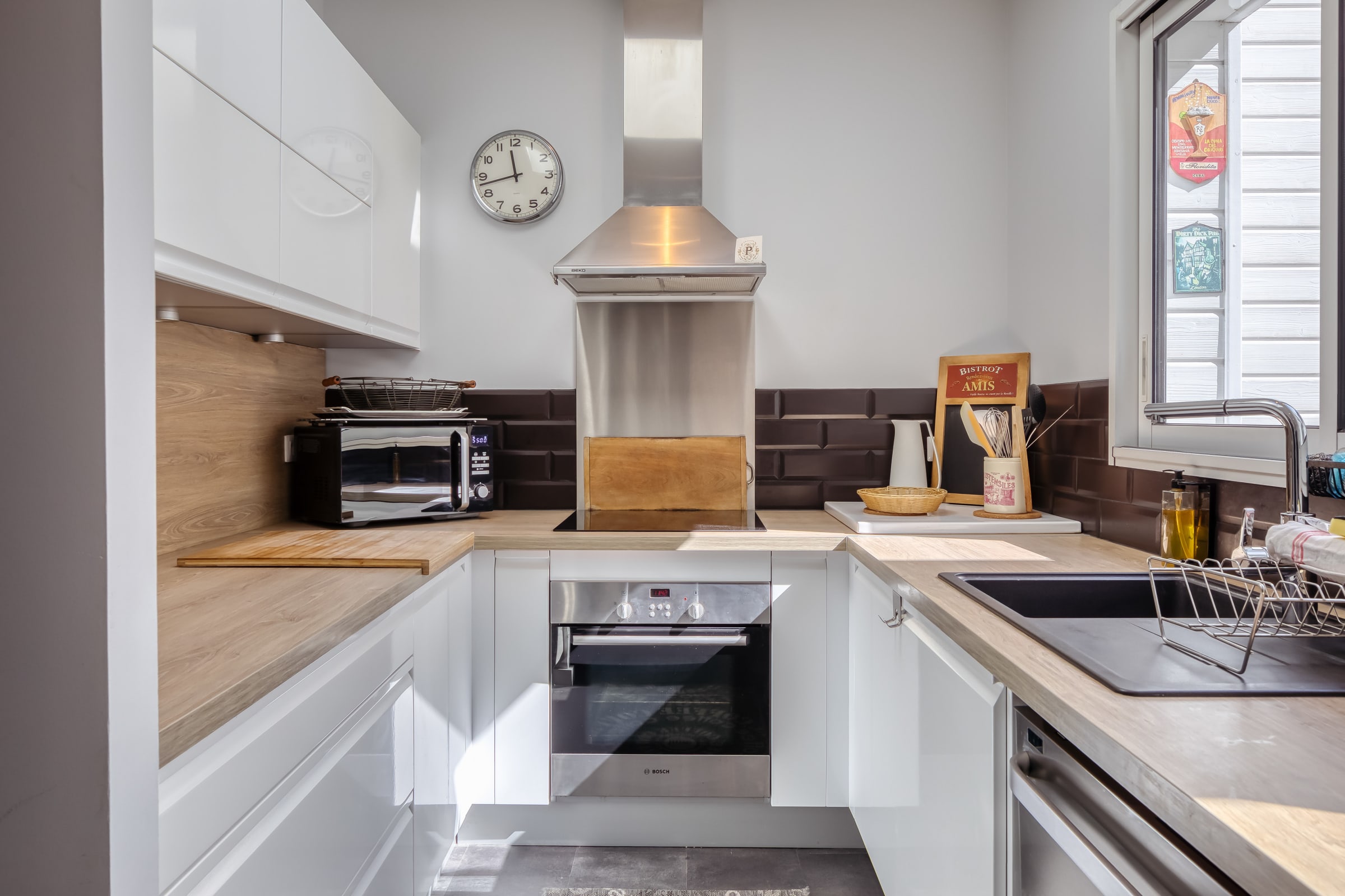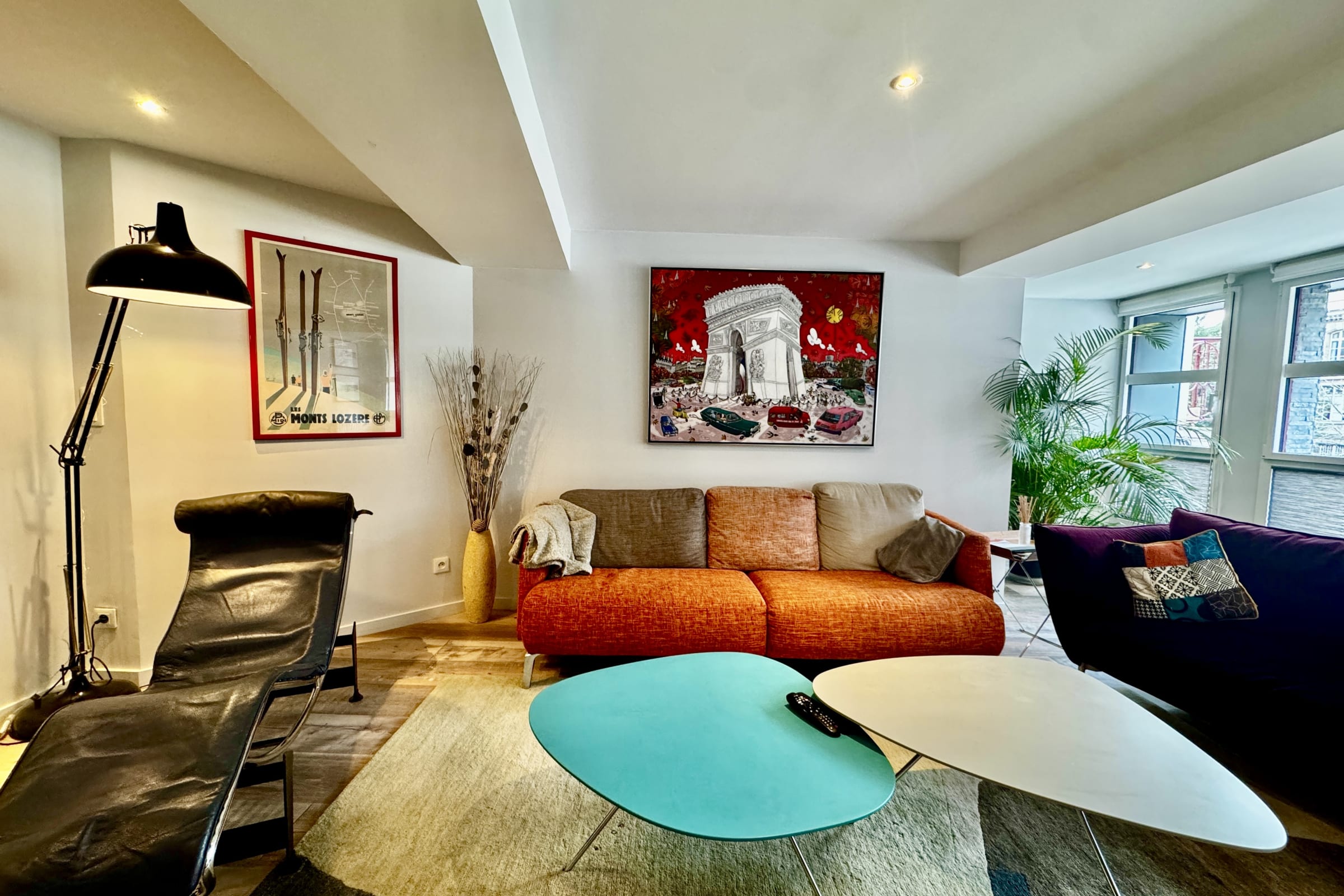 Main floor (1st floor of the building): Here you will find a fully fitted and equipped kitchen: hob, oven, extractor hood, dishwasher, microwave, Nespresso machine, toaster, kettle, blender... Everything you need is there. The light-filled living room is the ideal place to get together: comfortable sofa, large smart TV, convivial table for sharing meals, all with a view of the square in Rouen. Also on this level: a bedroom with its own shower room and WC, as well as direct access to the patio, a real outdoor cocoon for special moments.