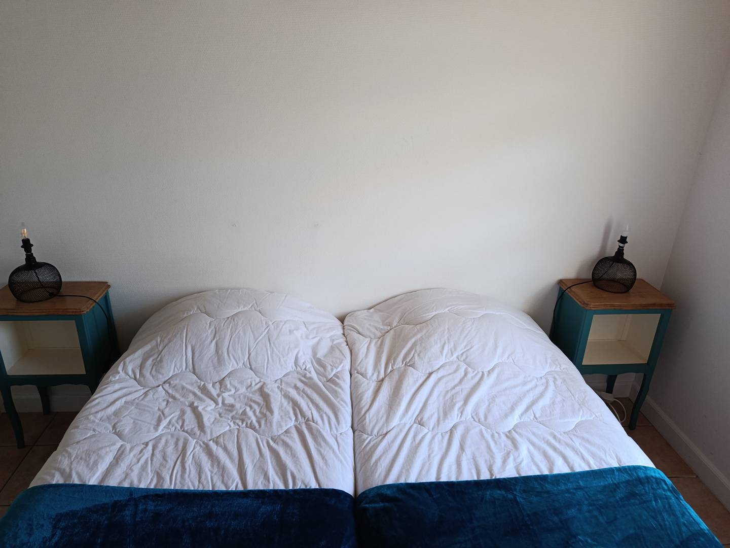 The sleeping area consists of a bathroom, toilet, and two bedrooms with closets: one bedroom with a double bed (160x200cm) and one bedroom with two single beds (80x200cm) that can be joined to form a double bed.
