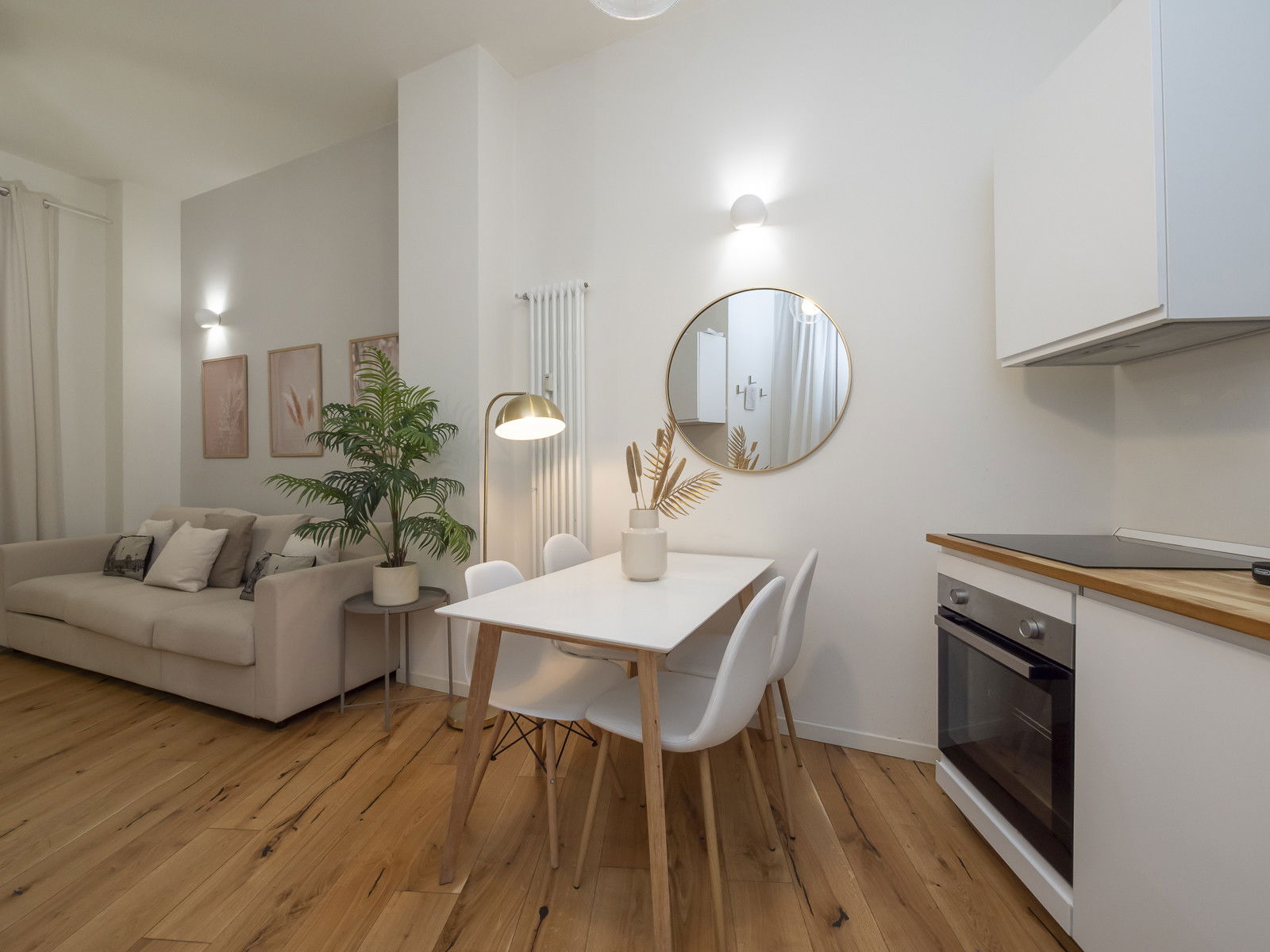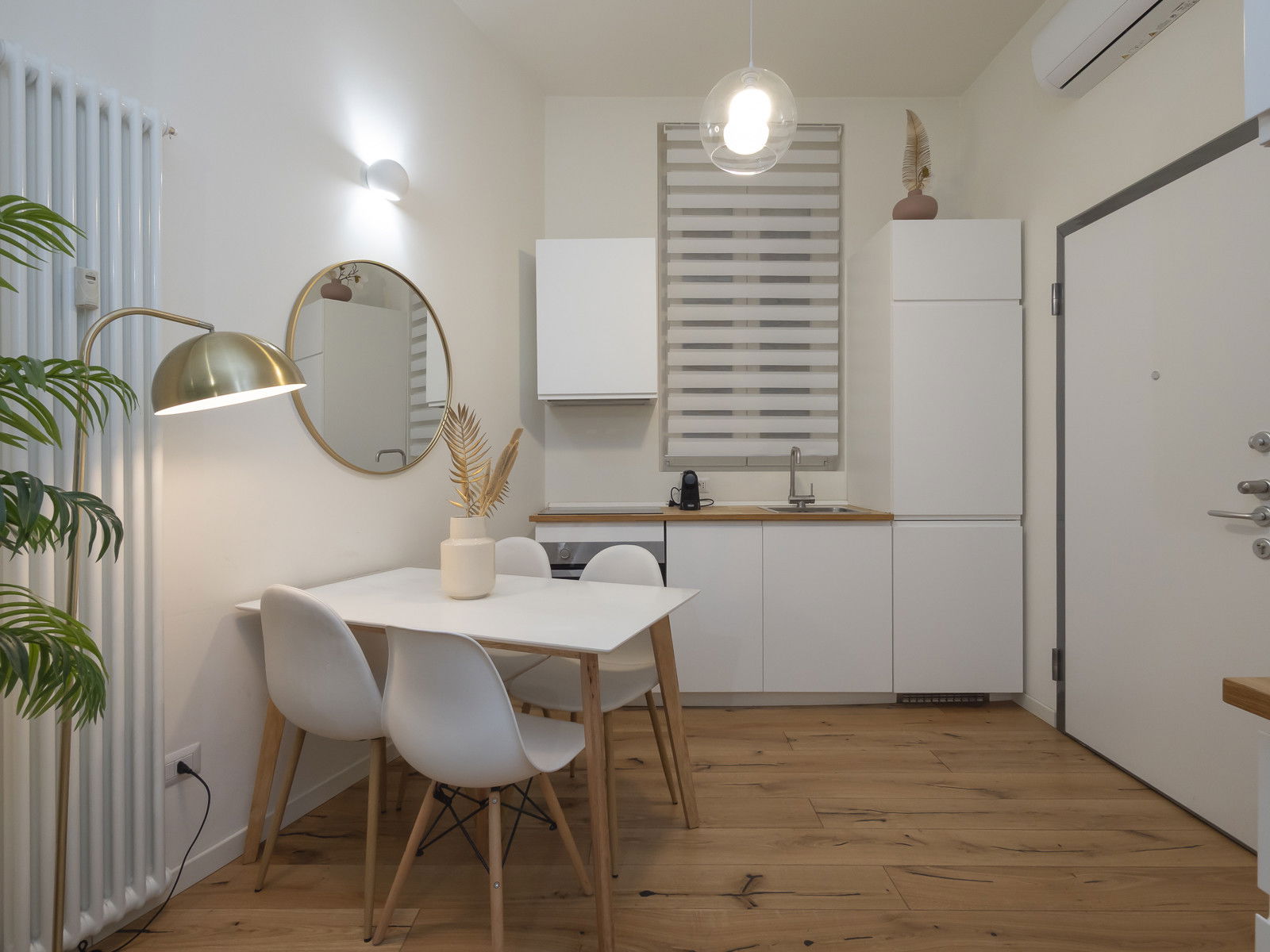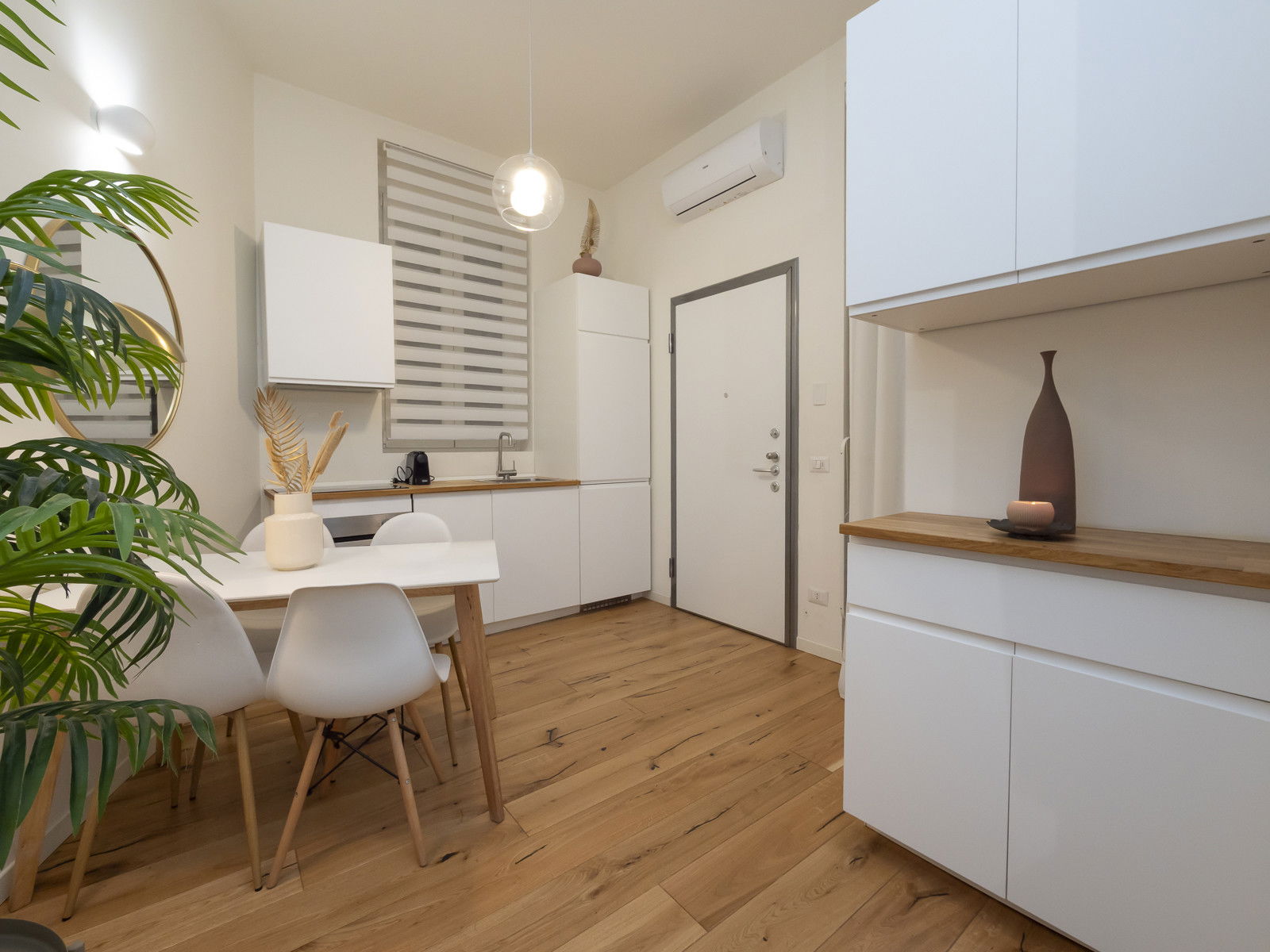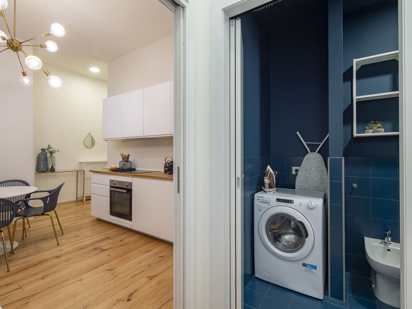 The modern kitchen is furnished with a table for four people and equipped with state-of-the-art appliances: an oven, induction cooktop, coffee machine, and dishwasher. A washing machine is conveniently located in a storage area near the entrance.