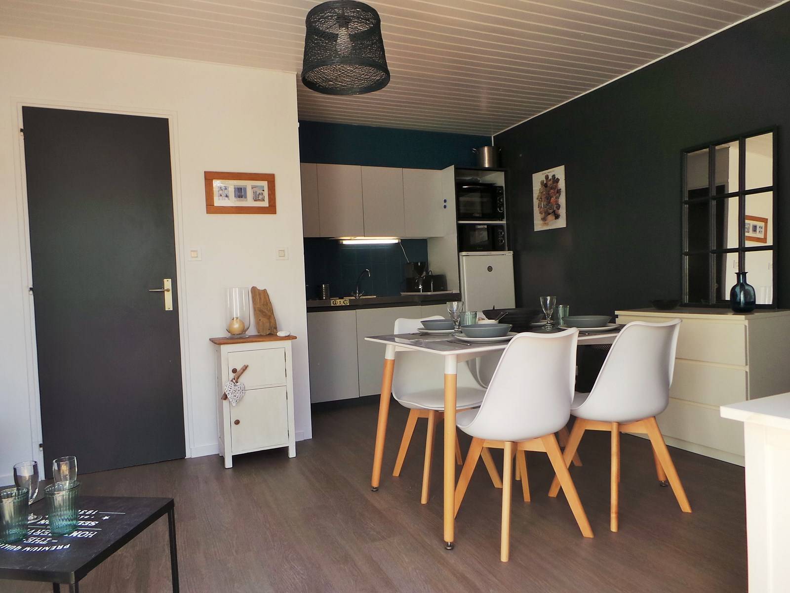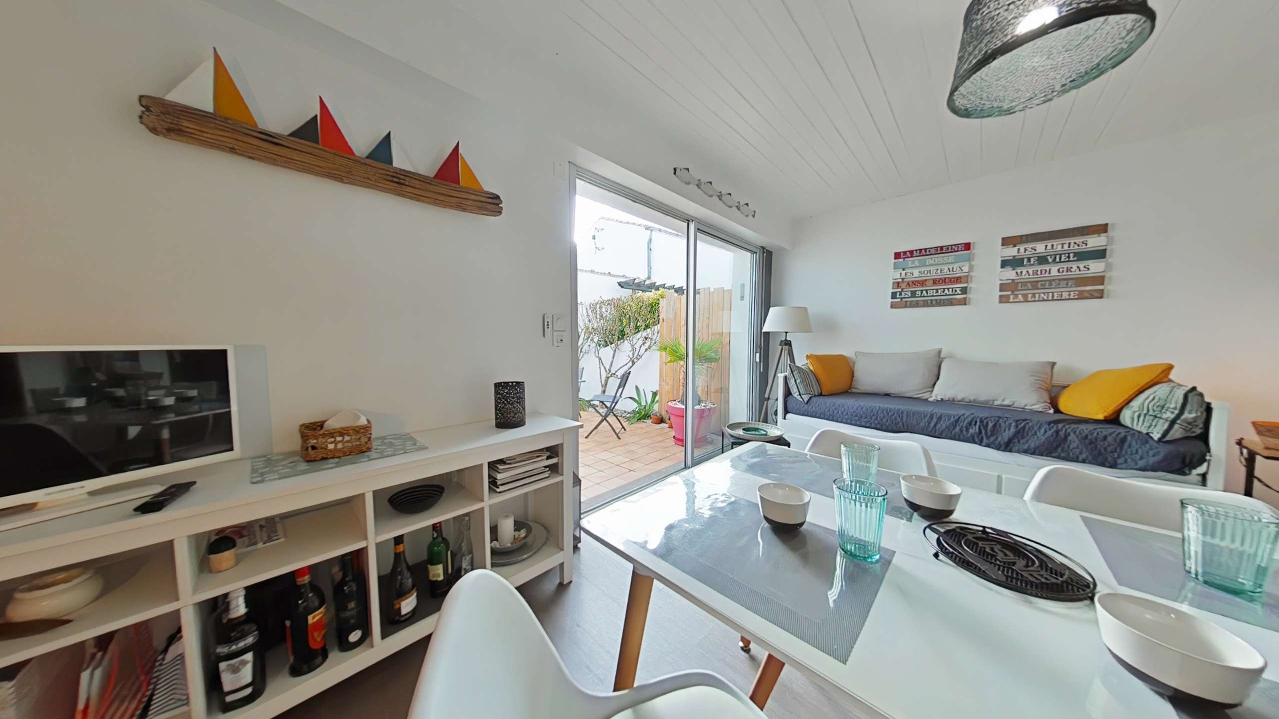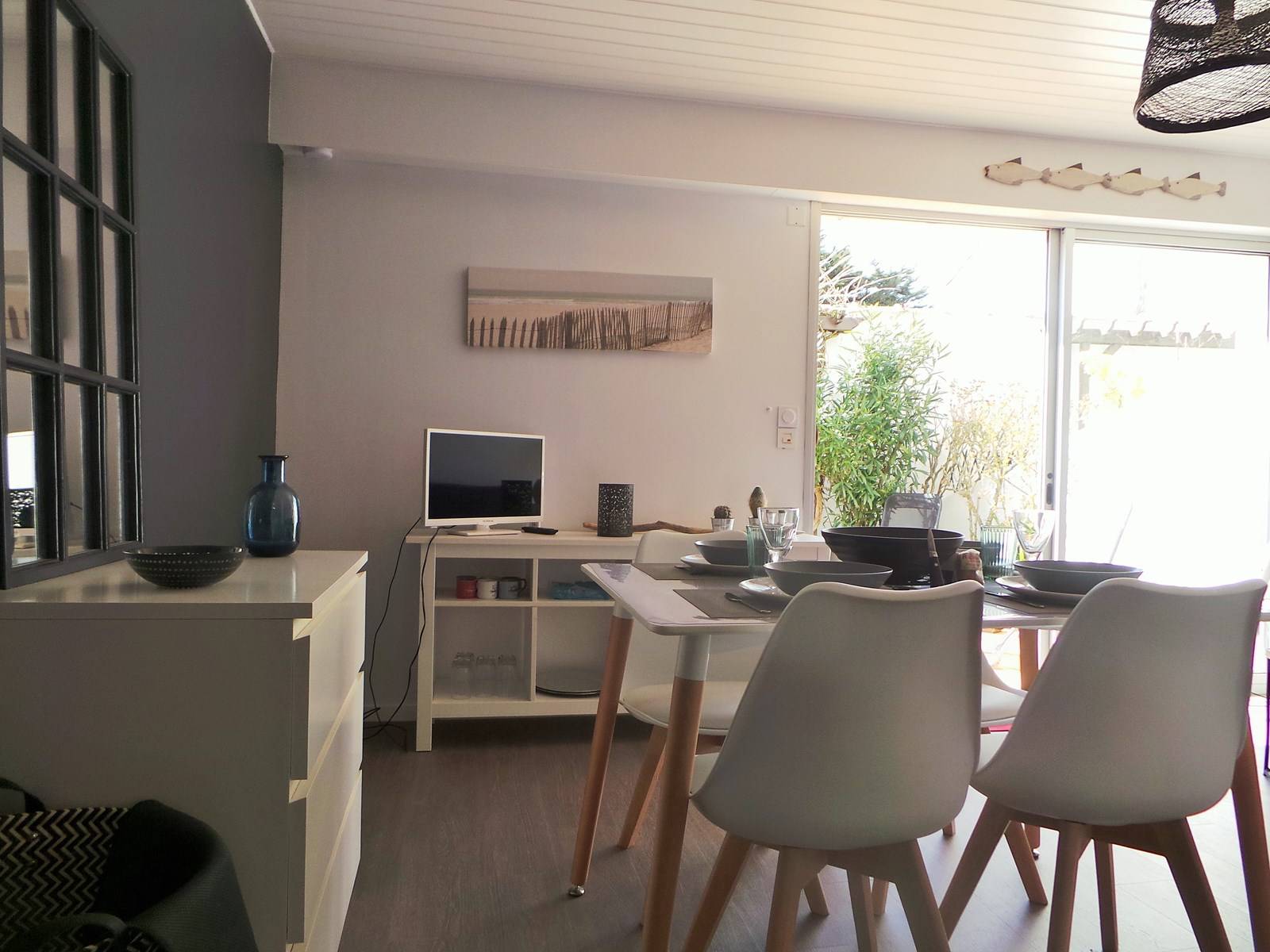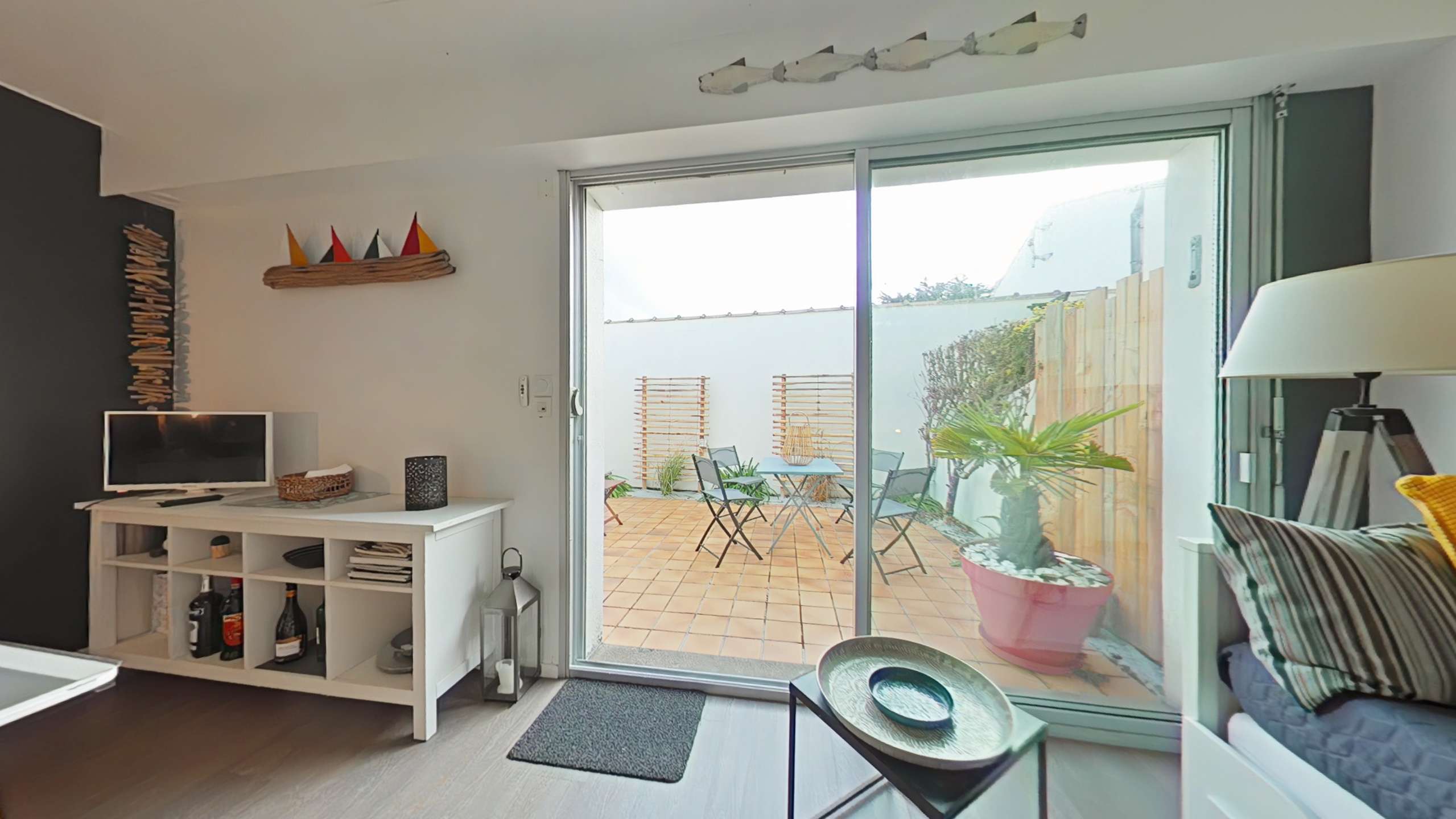 L'Herbaudière (85) - Les Lutins district - Close to the beach Studio/cabin apartment - approx. 36 m² - up to 4 people This completely renovated holiday apartment includes a cabin area with two single bunk beds, a living room with television and a new sofa bed for 2 people, a kitchen area, bathroom with wc and washing machine. The advantages of this rental by the sea: Private terrace with awning, not overlooked, garden furniture, deckchairs, ideal for lunch or rest - A private parking space. Household disinfection included.