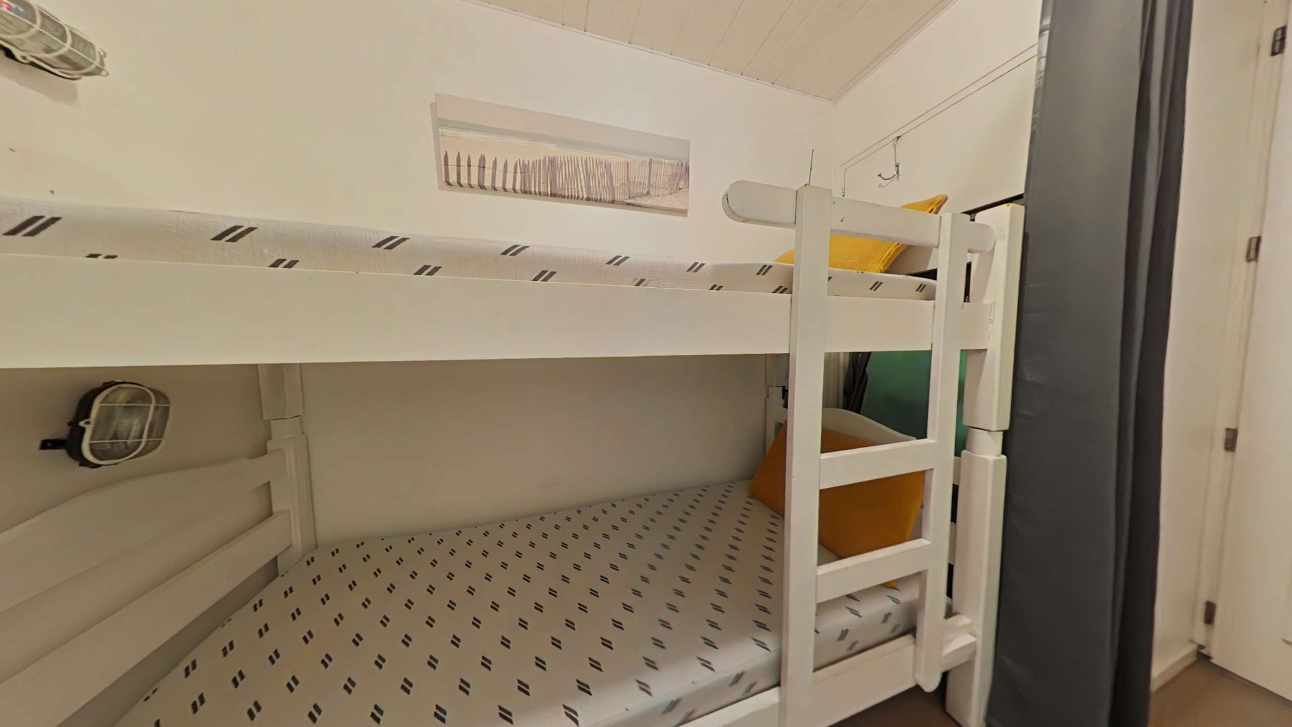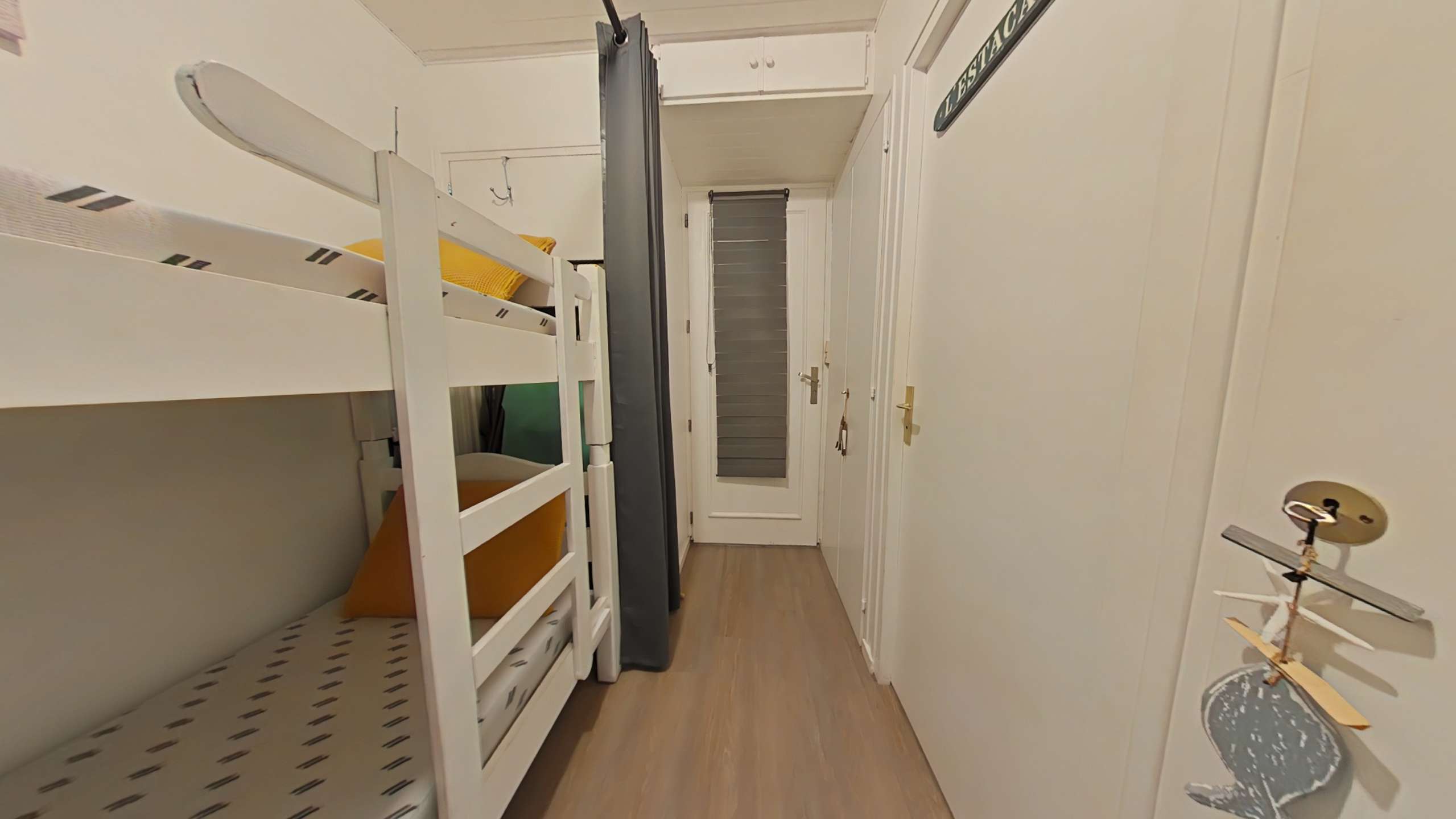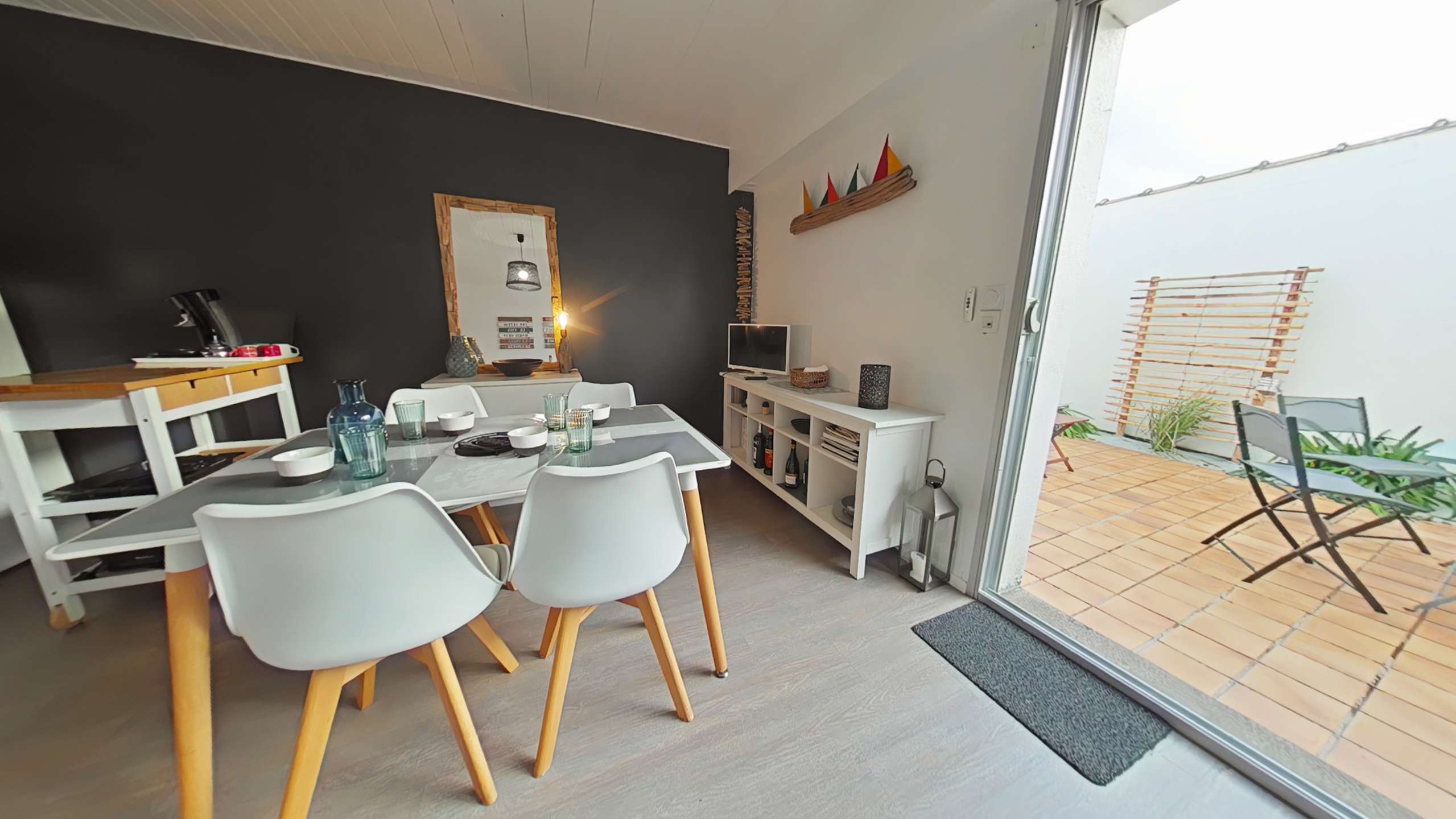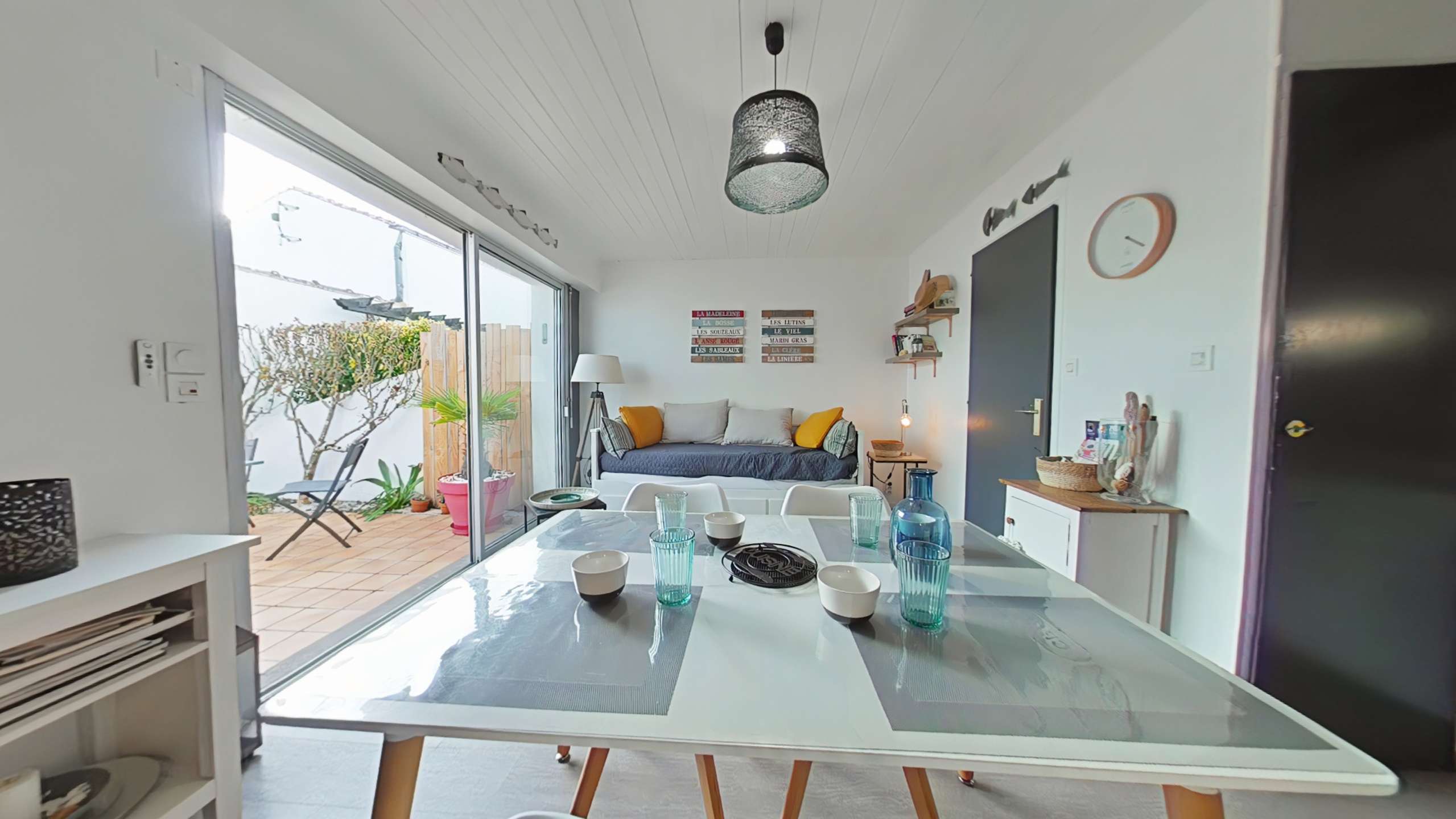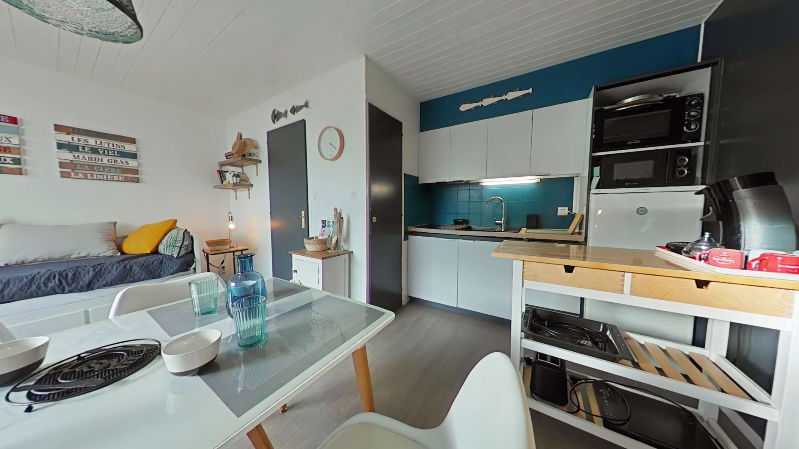 L'Herbaudière (85) - Les Lutins district - Close to the beach Studio/cabin apartment - approx. 36 m² - up to 4 people This completely renovated holiday apartment includes a cabin area with two single bunk beds, a living room with television and a new sofa bed for 2 people, a kitchen area, bathroom with wc and washing machine. The advantages of this rental by the sea: Private terrace with awning, not overlooked, garden furniture, deckchairs, ideal for lunch or rest - A private parking space. Household disinfection included.