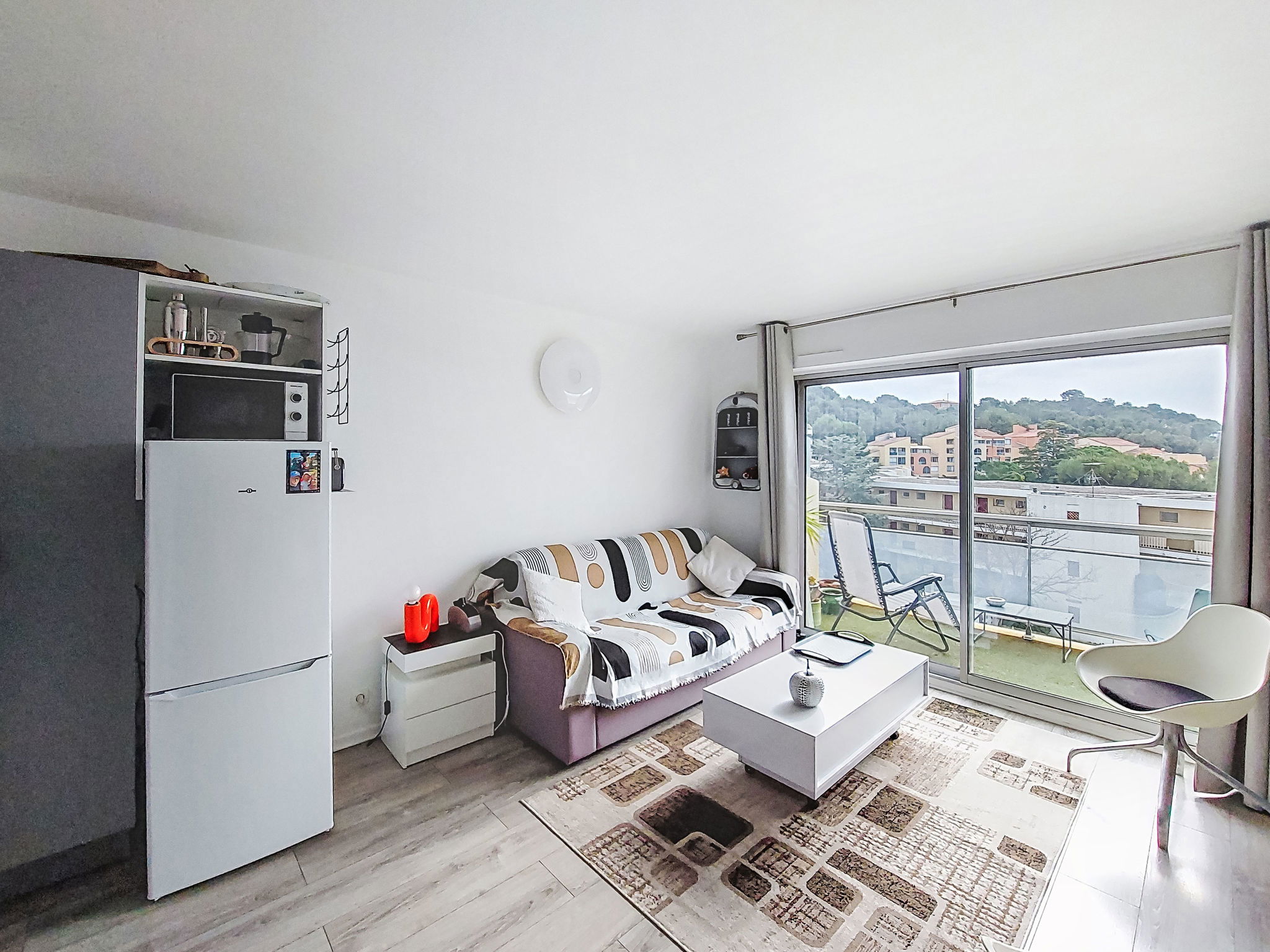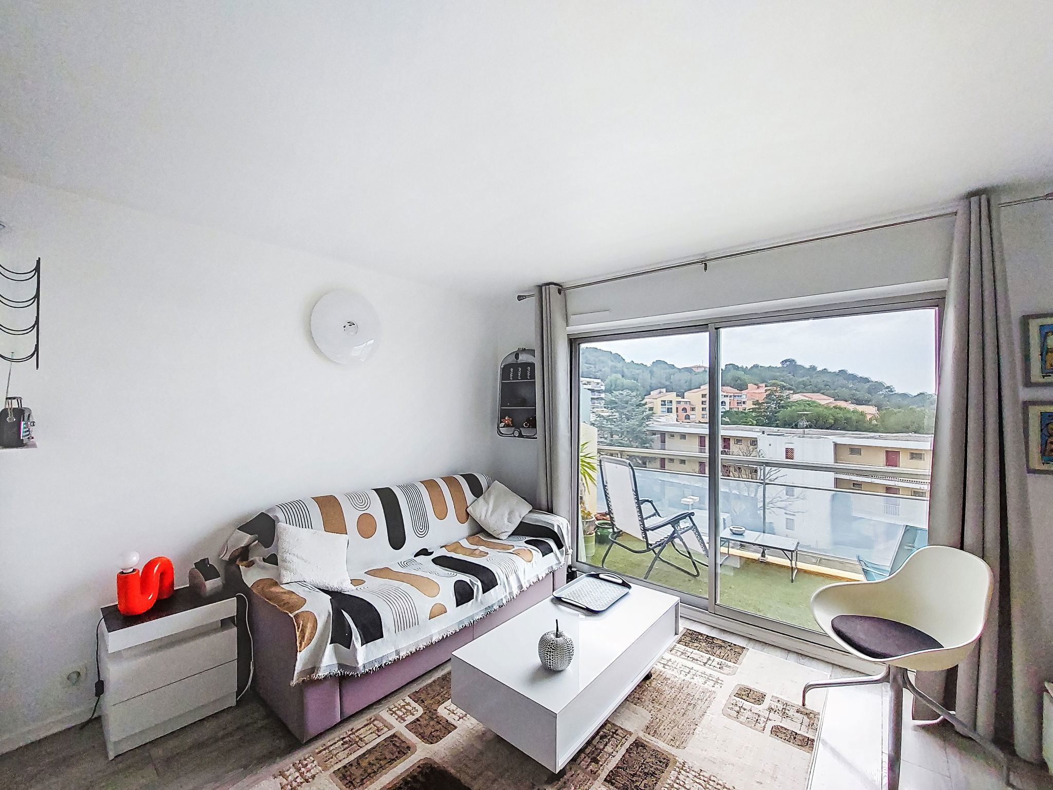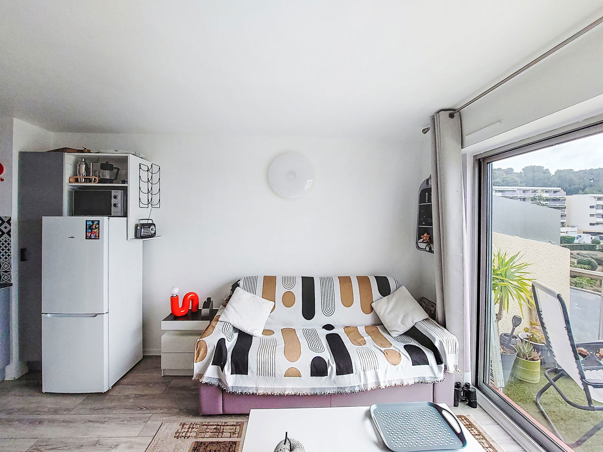1-room studio 26 m2 on 3rd floor. Comfortable and beautiful furnishings: living/dining room with 1 double sofabed (160 cm, length 190 cm), TV (flat screen), air conditioning. Exit to the terrace. Kitchenette (oven, 4 ceramic glass hob hotplates, toaster, microwave, electric coffee machine). Shower/WC. Forced-air heating. Terrace 7 m2. Terrace furniture. View of the sea. Facilities: washing machine. Internet (WiFi, extra). Parking space n 694. Please note: TV only FR. Smoke alarm. Offer by a private individual according to Art. 155, IV of CGI.