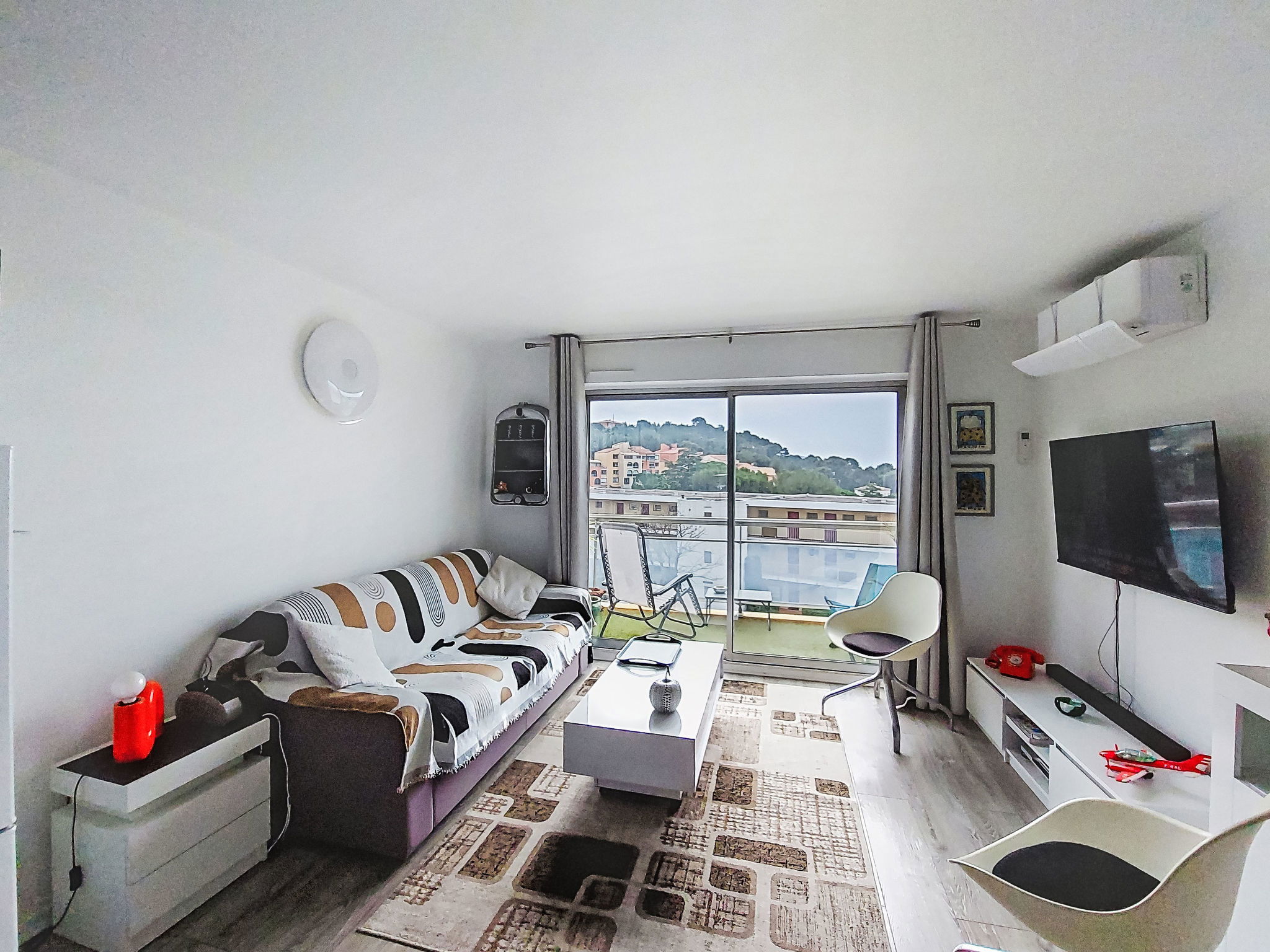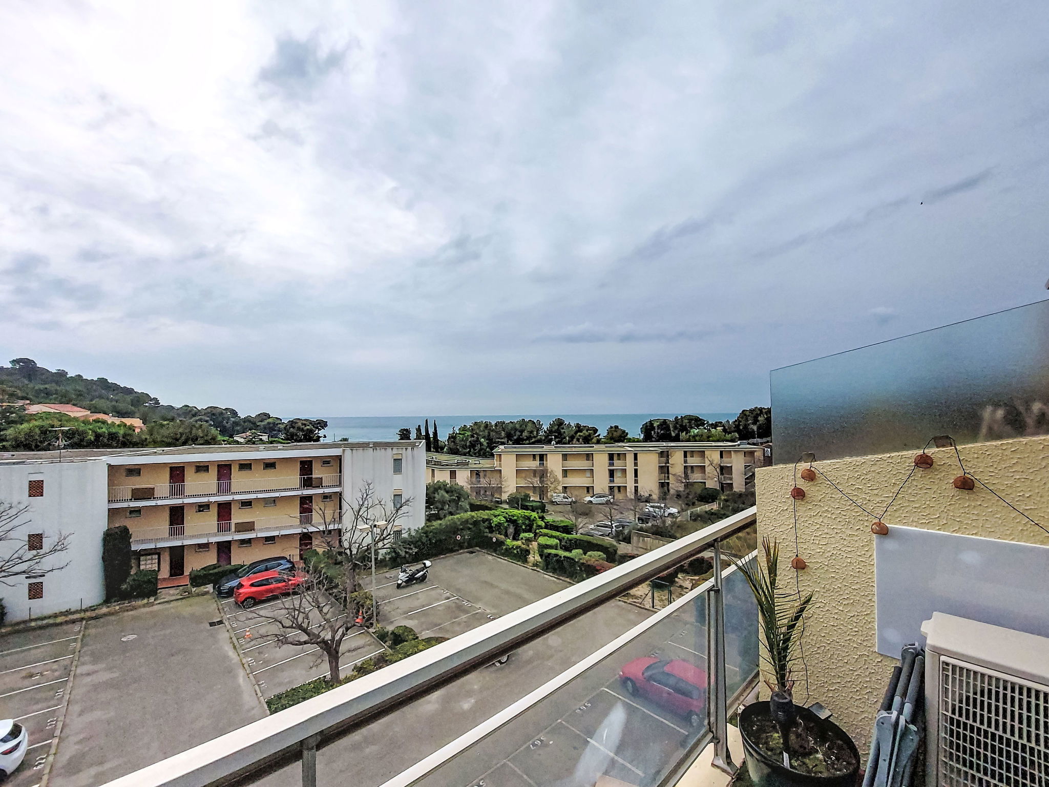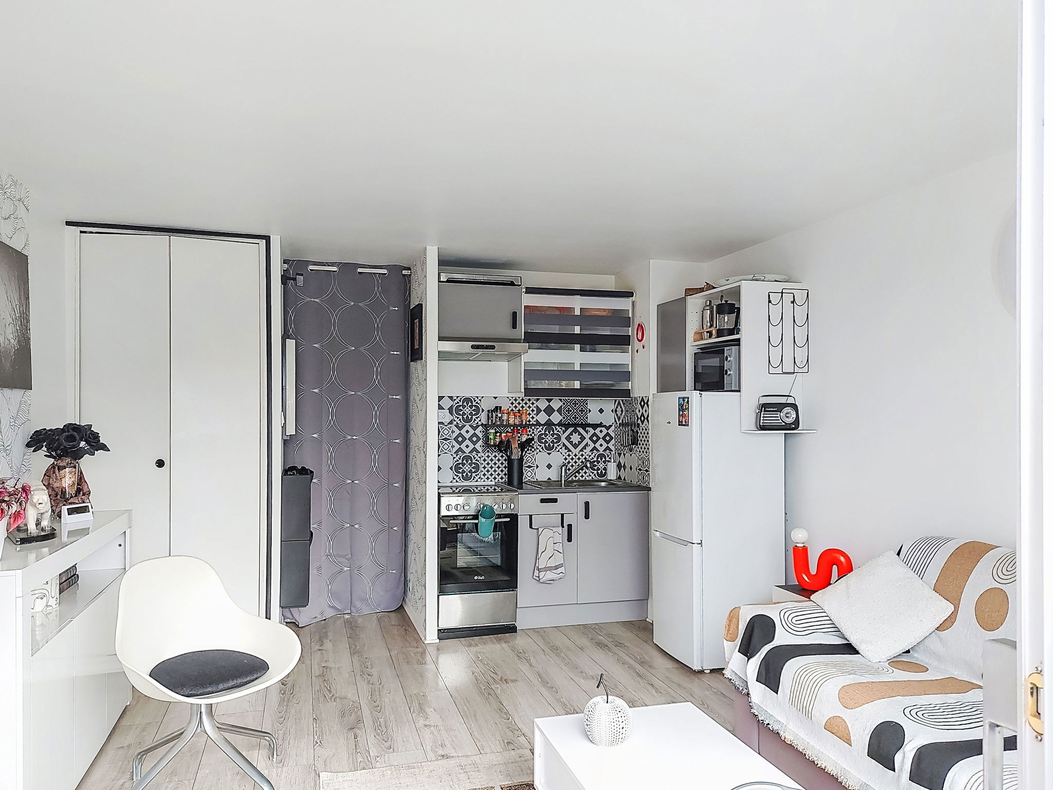 1-room studio 26 m2 on 3rd floor. Comfortable and beautiful furnishings: living/dining room with 1 double sofabed (160 cm, length 190 cm), TV (flat screen), air conditioning. Exit to the terrace. Kitchenette (oven, 4 ceramic glass hob hotplates, toaster, microwave, electric coffee machine). Shower/WC. Forced-air heating. Terrace 7 m2. Terrace furniture. View of the sea. Facilities: washing machine. Internet (WiFi, extra). Parking space n 694. Please note: TV only FR. Smoke alarm. Offer by a private individual according to Art. 155, IV of CGI.